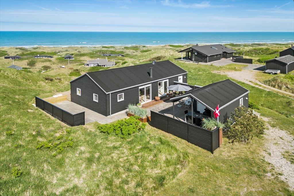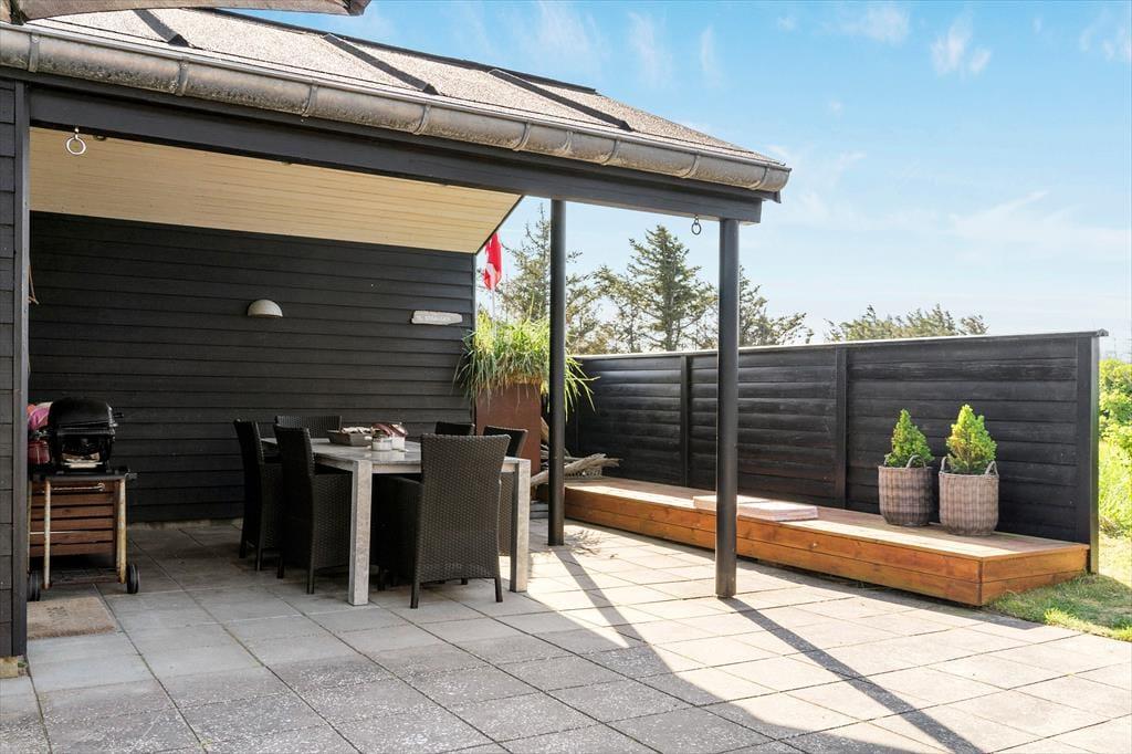 Fra de to soveværelser mod vest har man adgang til terrassen foran huset, hvor man kan nyde klitlandskabet og den fantastiske udsigt over Vesterhavet. Er det for blæsende, har huset en flot beskyttet solgård mod øst. Foran annekset er en overdækket terrasse, hvor man kan sidde helt ugeneret. På det næsten 100 m2 store terrasseareal finder man altid en plads i læ eller sol, og de store vinduespartier på begge sider af opholdsrummet åbner op for udsigten over havet, selvom man sidder i solgården.