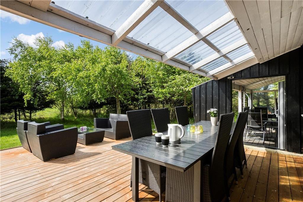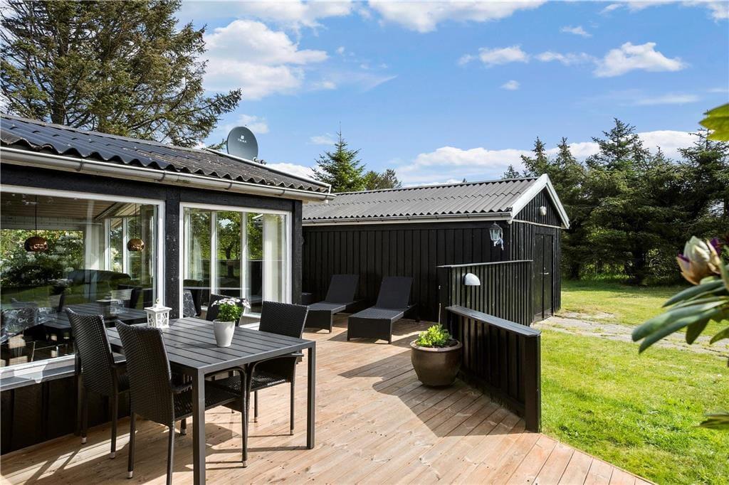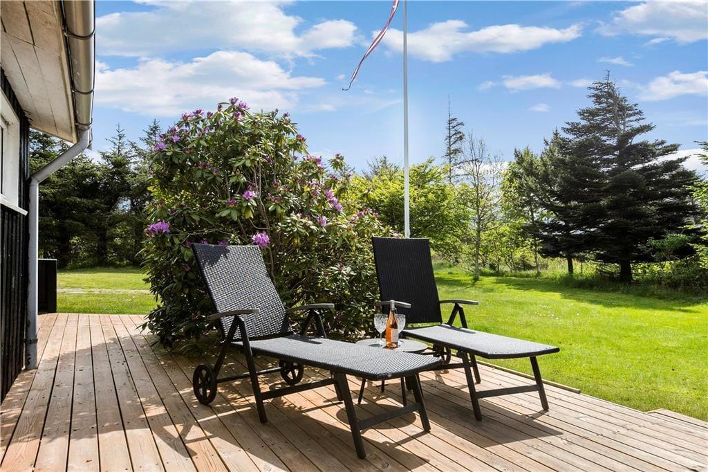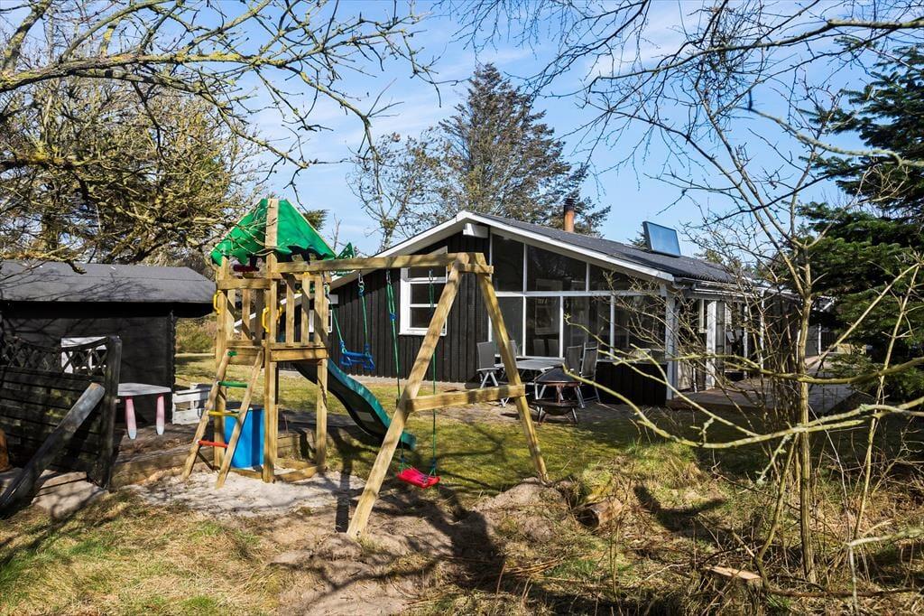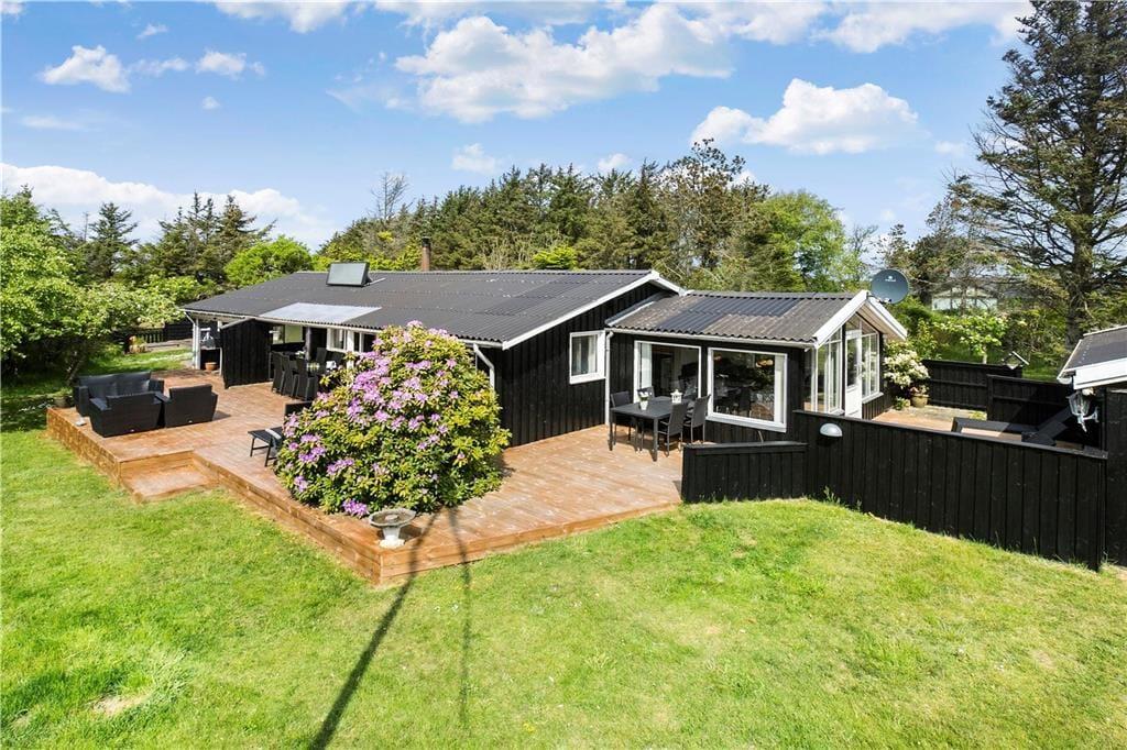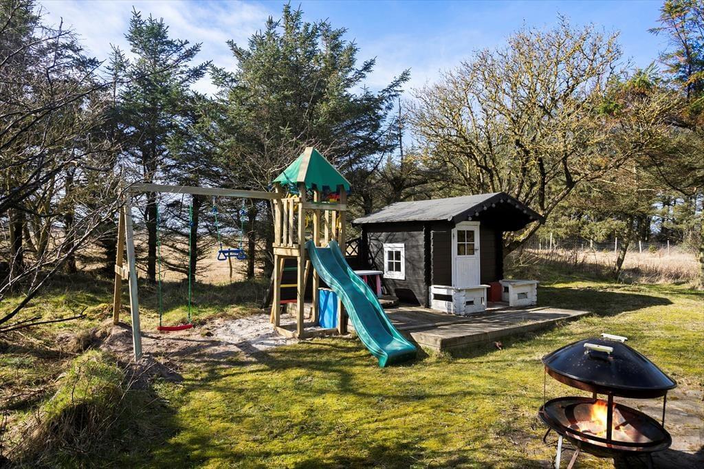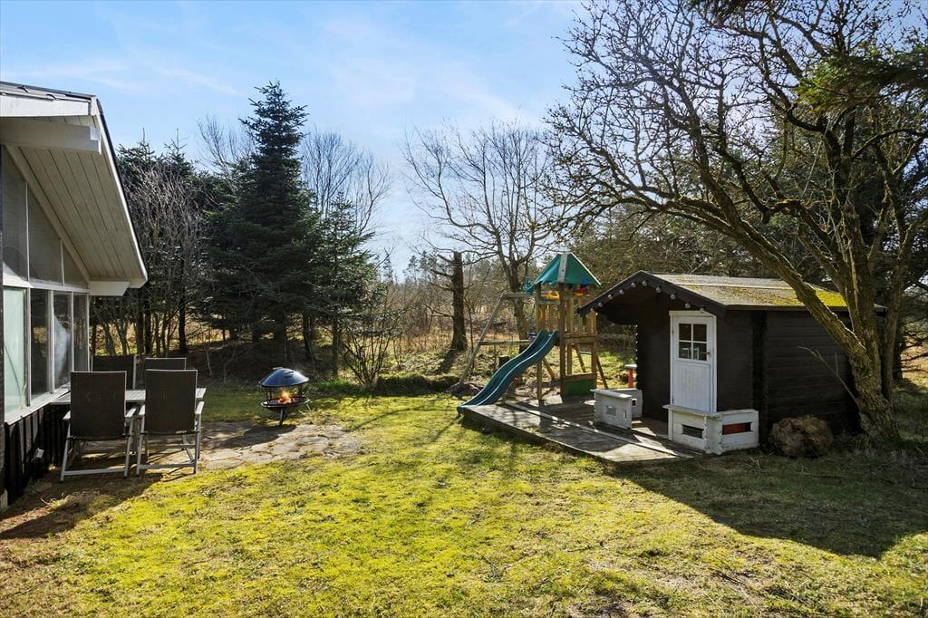 Den 6000m2 store naturgrund er en kæmpegevinst ved dette sommerhus. Hele arealet er indhegnet, så børn kan lege trygt og hunde kan luftes uden fare. Da huset ligger for enden af vejen, har man det hele for sig selv og kan opholde sig på terrasserne og græsplænen i fred og ro, og føle sig helt ugeneret for naboer og forbipasserende. Grunden støder op til et fredet areal med græssende får og fra en lille bakke kan man nyde udsigten til Vesterhavet, som i øvrigt hele tiden kan høres i baggrunden. På terrasserne kan man slappe af i solen og nyde alle dagens måltider; her er alle muligheder for at opholde sig udendørs dagen lang.