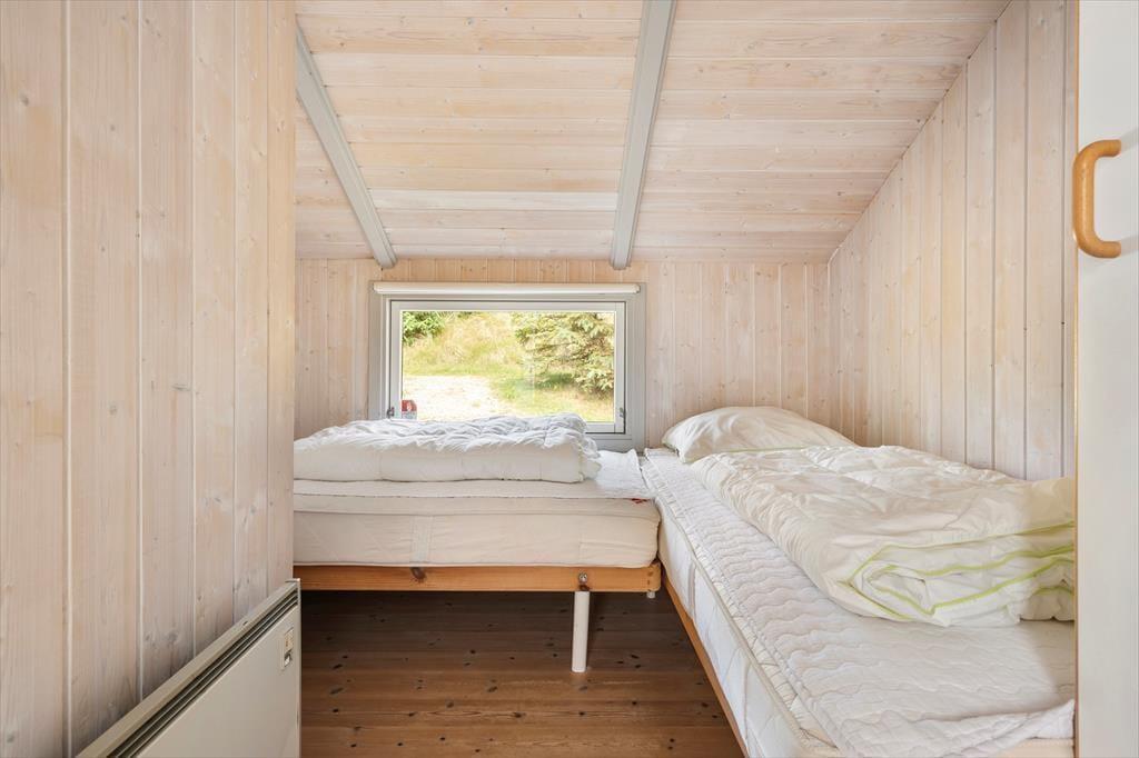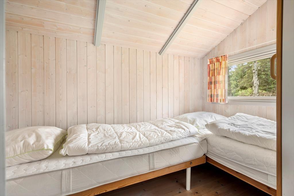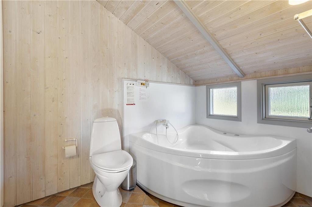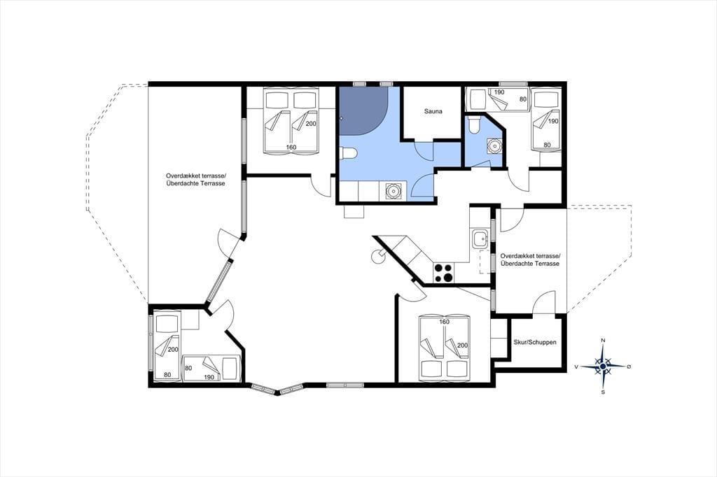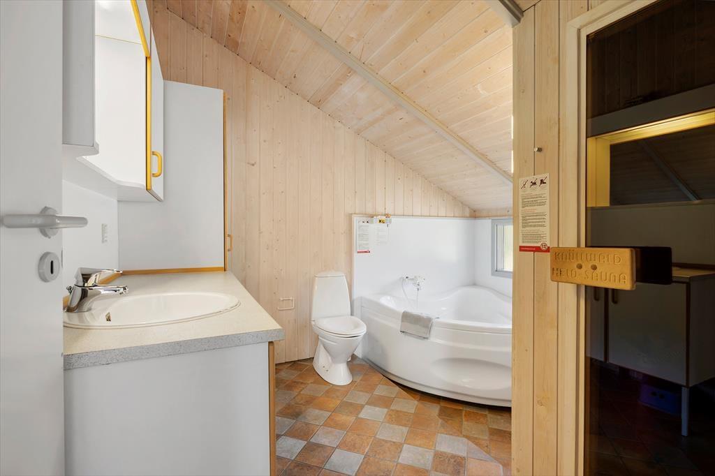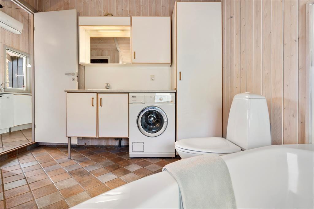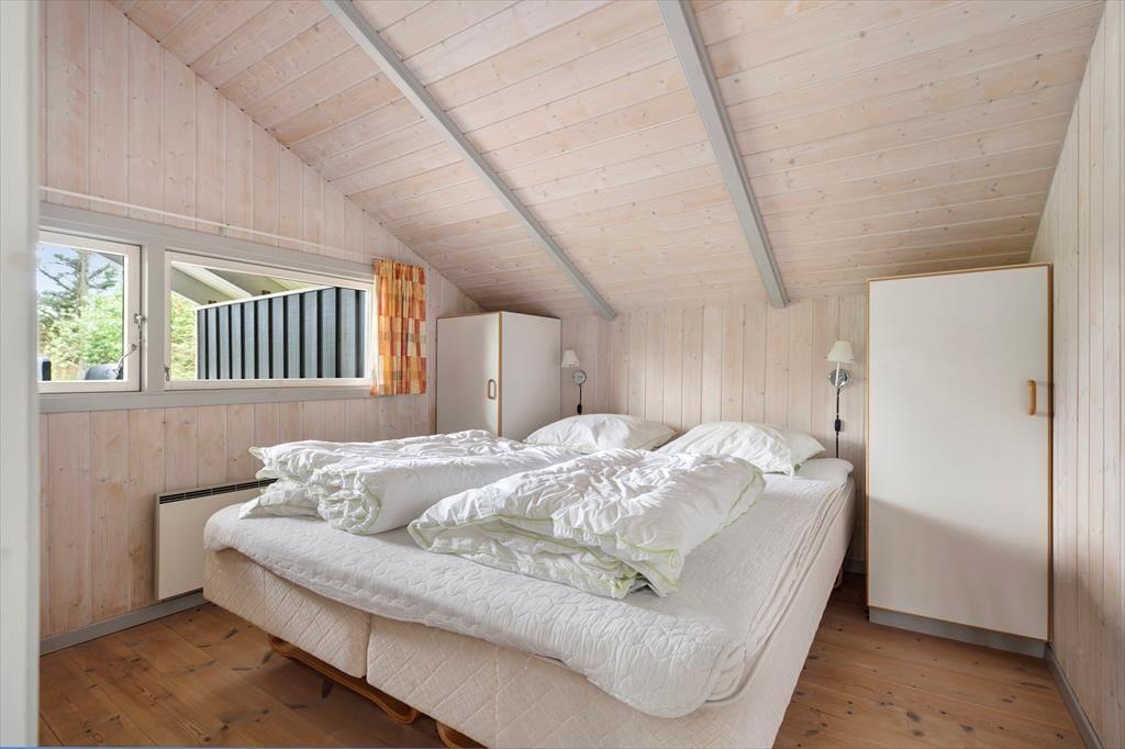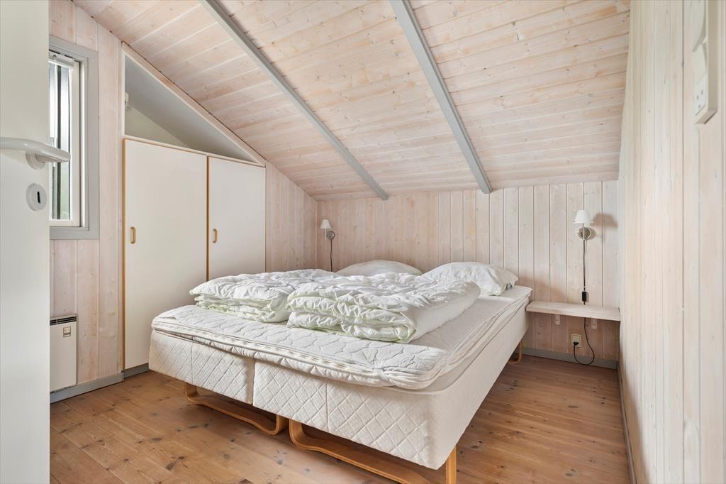 Sommerhuset er funktionelt indrettet med køkken, stue og spiseplads som det naturlige samlingspunkt, mens værelser og badeværelser er fordelt rundt om. Der er lyse paneler på vægge og loft, og med lyse gulve og store vinduer fremstår huset meget venligt og imødekommende. Køkkenet er udstyret med alle former for hvidevarer og i stuen kan man skabe lidt hygge ved at tænde op i brændeovnen, eller man kan trække ud på en af terrasserne og nyde de lange sommeraftener. Værelserne har alle gode senge og skabsplads, og på det store badeværelse finder man både bruser, spabad og sauna. Desuden forefindes både vaskemaskine, og stol og seng til de mindste børn.