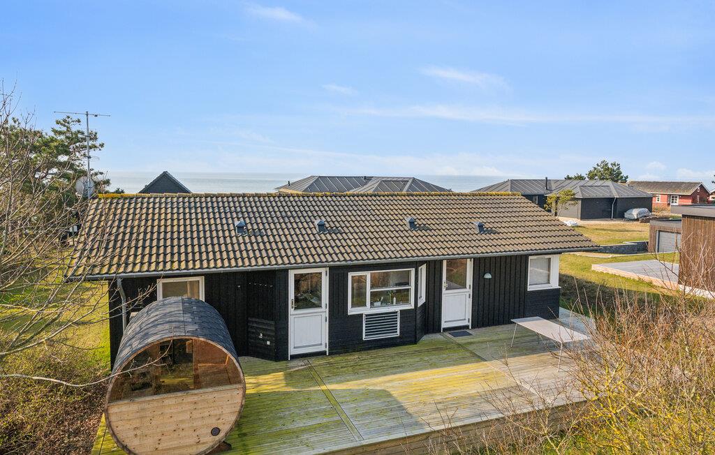 Feriehus tæt på stranden med sauna, havudsigt og hyggelig træterrasse for afslapning og naturoplevelser.
