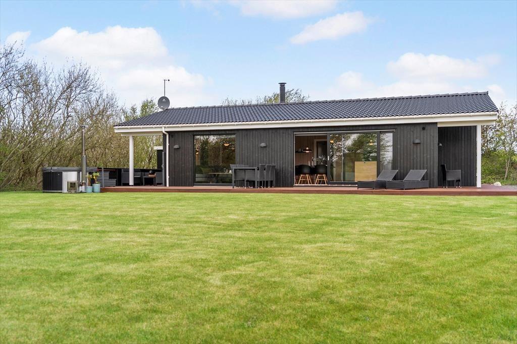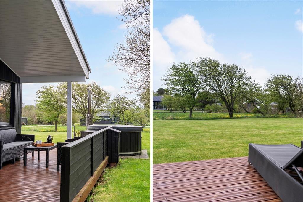 Også ude i det fri er der mulighed for at bade: Her på den 930 m2 store grund står der nemlig et dejligt vildmarksbad, der inviterer til en stille stund, når mørket falder på og feriefreden hviler over Kjærgaarden. Livsnydertilværelsen kan også foregå på den store og delvist overdækkede træterrasse, der er udstyret med gode kvalitetshavemøbler. På havens græsplæne er der god plads til at lege og spille havespil, og derudover kan I frit benytte jer af sommerhusområdets legeplads, petanquebane og minigolfbane (bemærk, at for at bruge sidstnævnte må man selv medbringe køller og bolde).