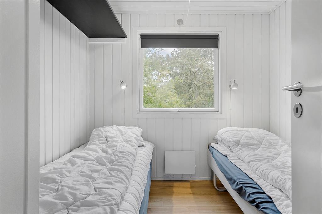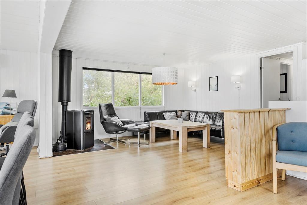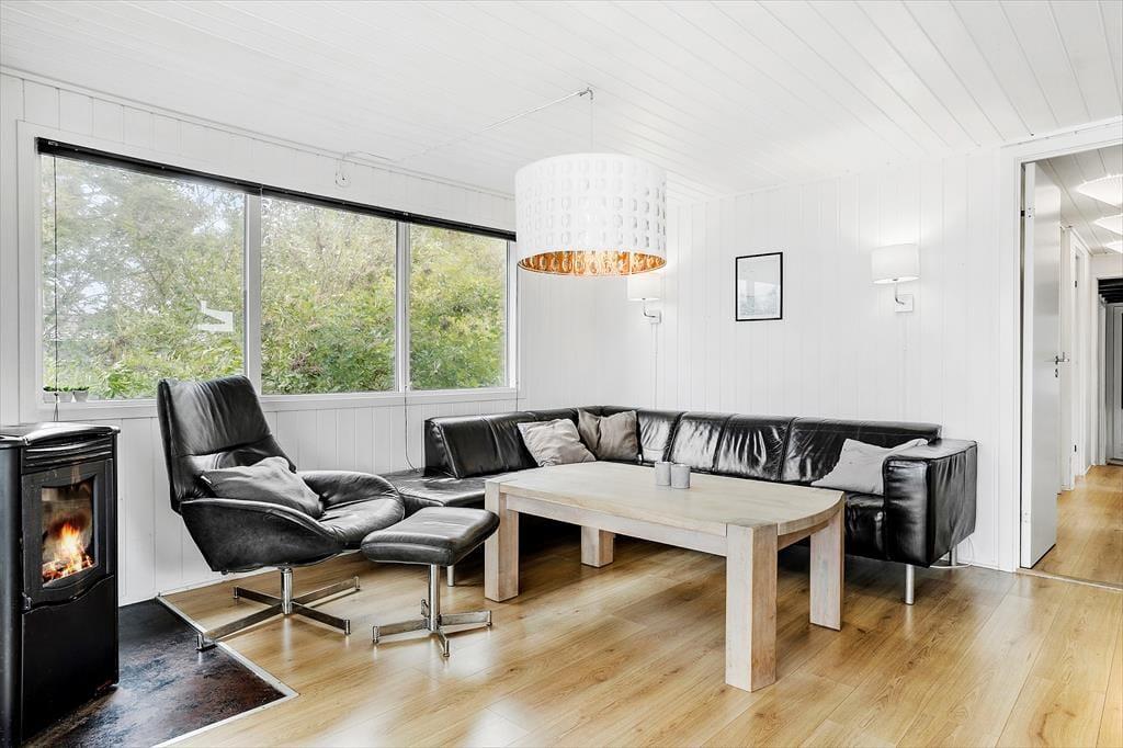 Sommerhuset ligger i første række ud mod kysten, og derfor kan du nyde synet af fjordens blå vand gennem stuens store gavlvindue. Spisebordet er stort, så her kan alle samles – også hvis I er 10 personer, der holder ferie sammen. Soveværelser er der fire af, og dertil kommer en hems med ekstra madrasser, så I alle kan sove komfortabelt. Køkkenet ligger på hyggelig vis i åben forbindelse med stuen, og de to badeværelser er godt fordelt i huset. Planløsningens helt store pryd er poolrummet, for her kan børn og voksne bade i swimmingpoolen og nyde livet med wellness i form af både spabad og sauna.