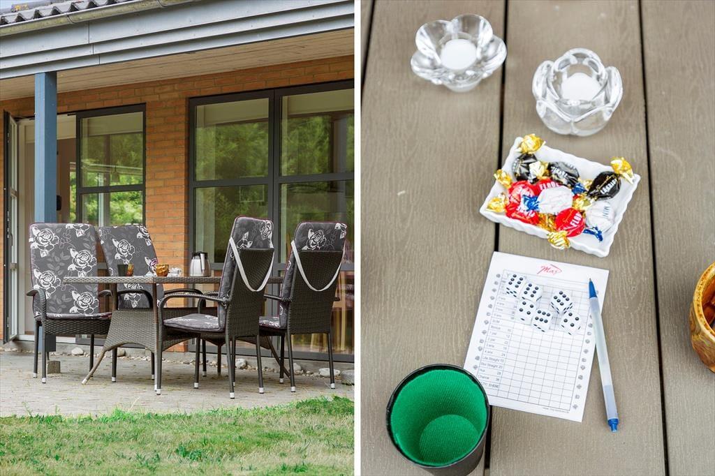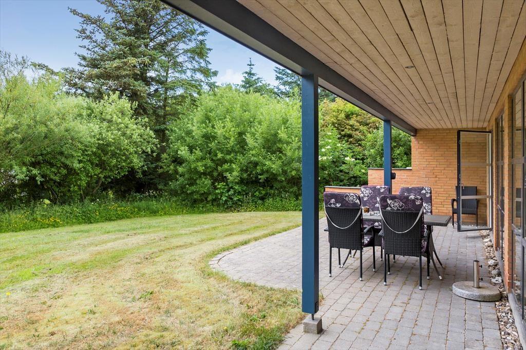 Sommerhuset ligger på en velholdt plænegrund med gode muligheder for leg og boldspil, hvis der er børn med på ferien. Mod syd er der en stor og delvist overdækket terrasse med gode havemøbler, liggestole, grill og parasol. Grunden er omgivet af træer og buske, så der er god læ og masser af privatliv.