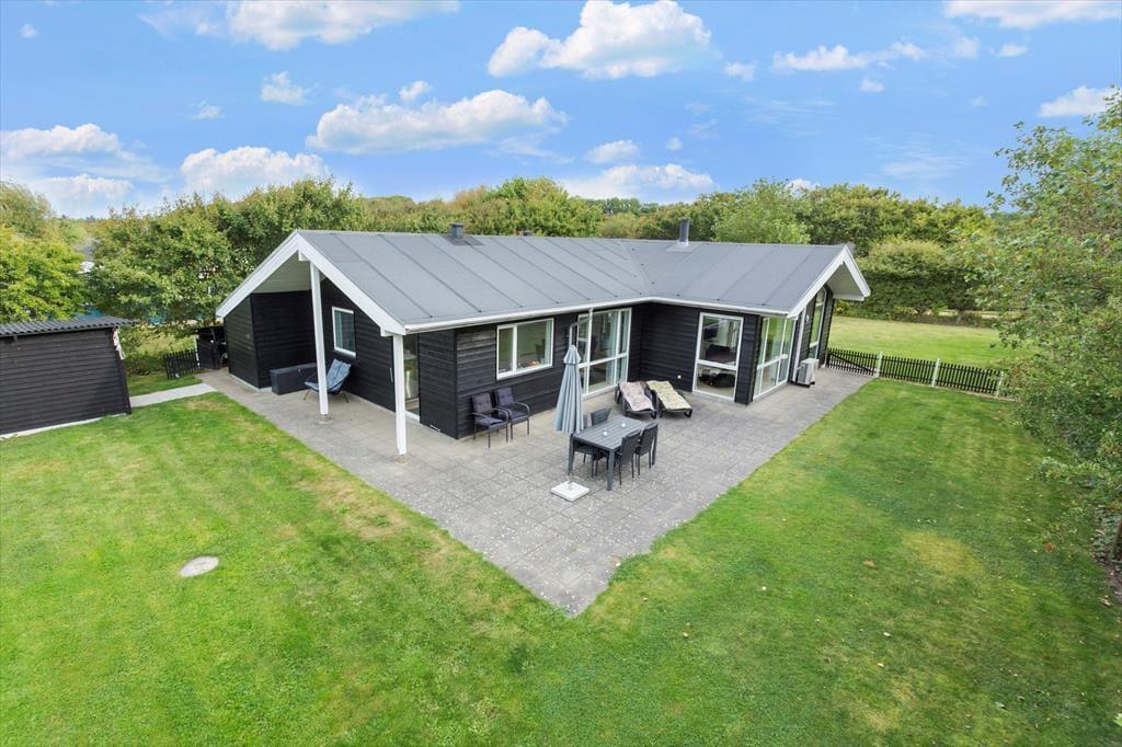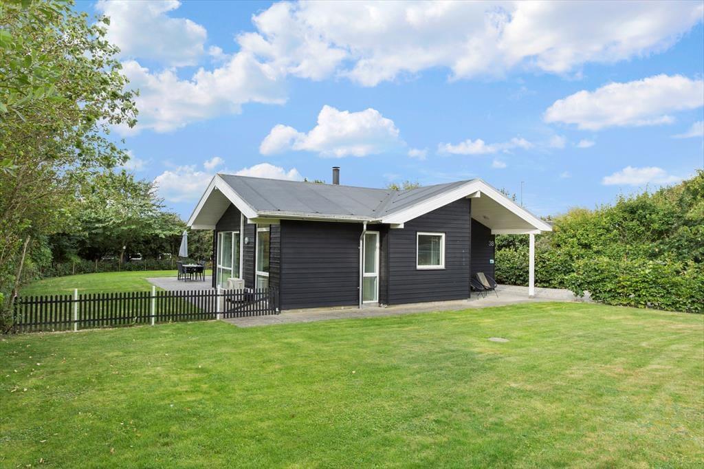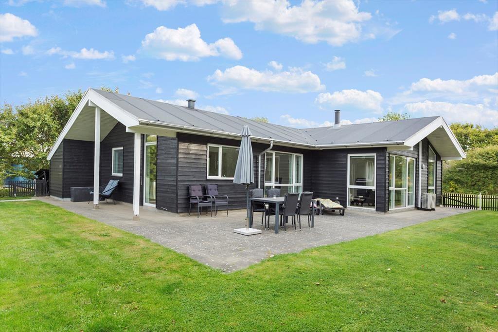 Sommerhusets baghave er indhegnet, så her kan hunden trygt løbe frit på græsplænen. Der er god plads til leg og boldspil – eller til en fredelig stund på den delvist overdækkede fliseterrasse, der er udstyret med havemøbler, liggestole og grill.