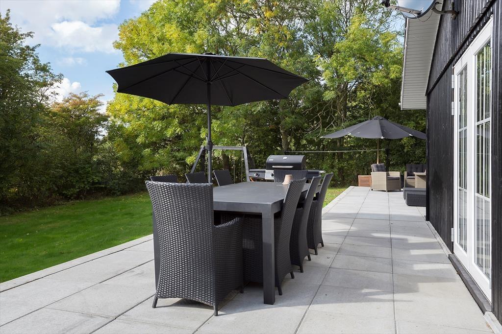 Hvis hele ferien ikke skal foregå i poolafdelingen, kan det bestemt også anbefales at tage en time eller to i en havestol på terrassen. Den strækker sig langs sommerhusets sydlige side og er udstyret med solsenge, loungeområde og havebord – plus en grill, så I kan diske op med lækre, sommerlige aftensmåltider sidst på dagen. Til børnene er der gynge, og hvis græsplænen ikke rækker til familiens fysiske udfoldelser, har I kort afstand til Kjærgaardens store fællesareal med boldbane, legeplads og minigolf.