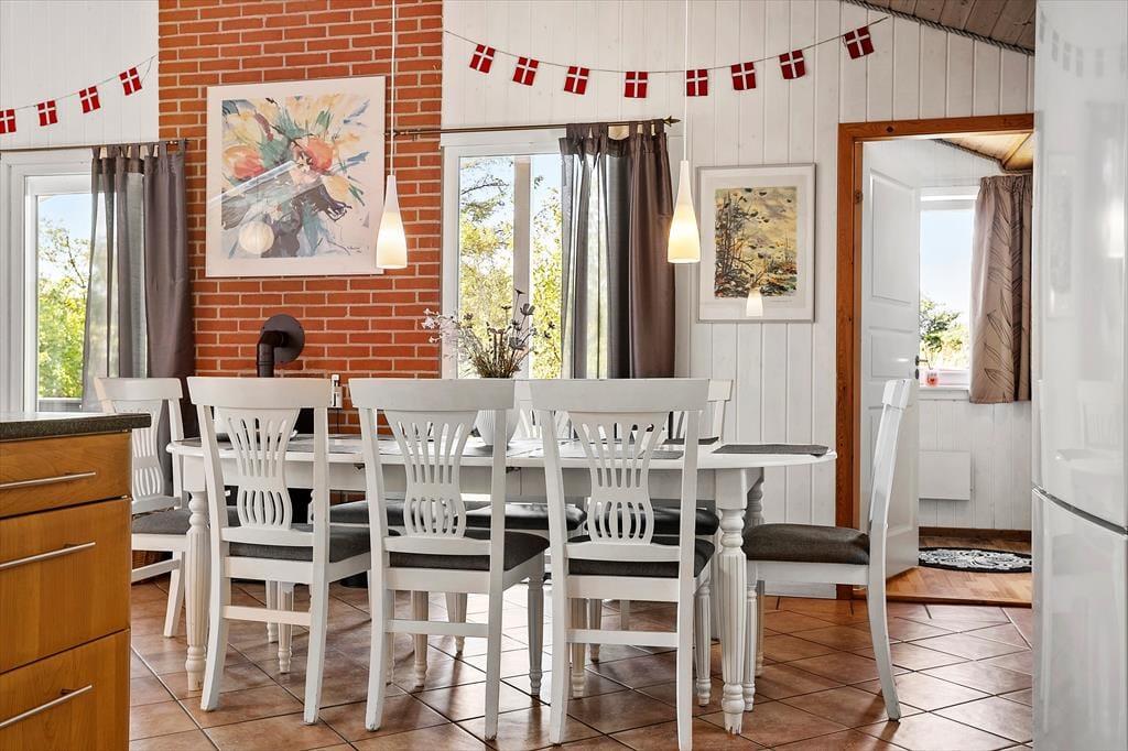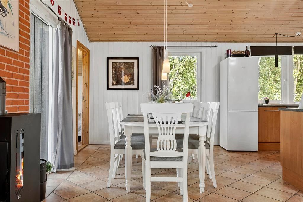 Træd ind i et sommerhus, hvor hygge og komfort går hånd i hånd. Her kan du samle familien i stuen omkring brændeovnen og nyde den varme atmosfære efter en dag på stranden eller i naturen. Huset byder på plads til otte personer, og med spabad og sauna kan ferien blive en luksuriøs oplevelse med afslapning for både krop og sjæl. Køkken og stue er åbne mod hinanden, hvilket skaber en naturlig sammenhæng, hvor samtaler og leg kan flyde frit, mens du tilbereder mad eller nyder en kop kaffe. Huset byder også dine firbenede venner velkommen, så ingen bliver ladt udenfor – her er alt skabt til fælles oplevelser og uforstyrret ro.
