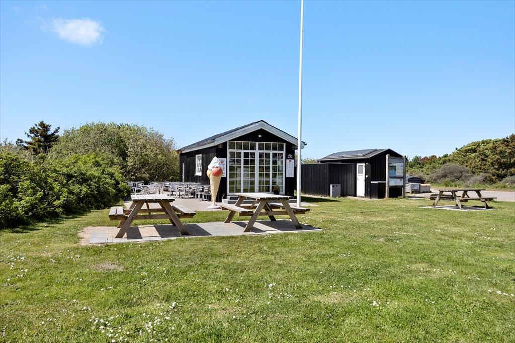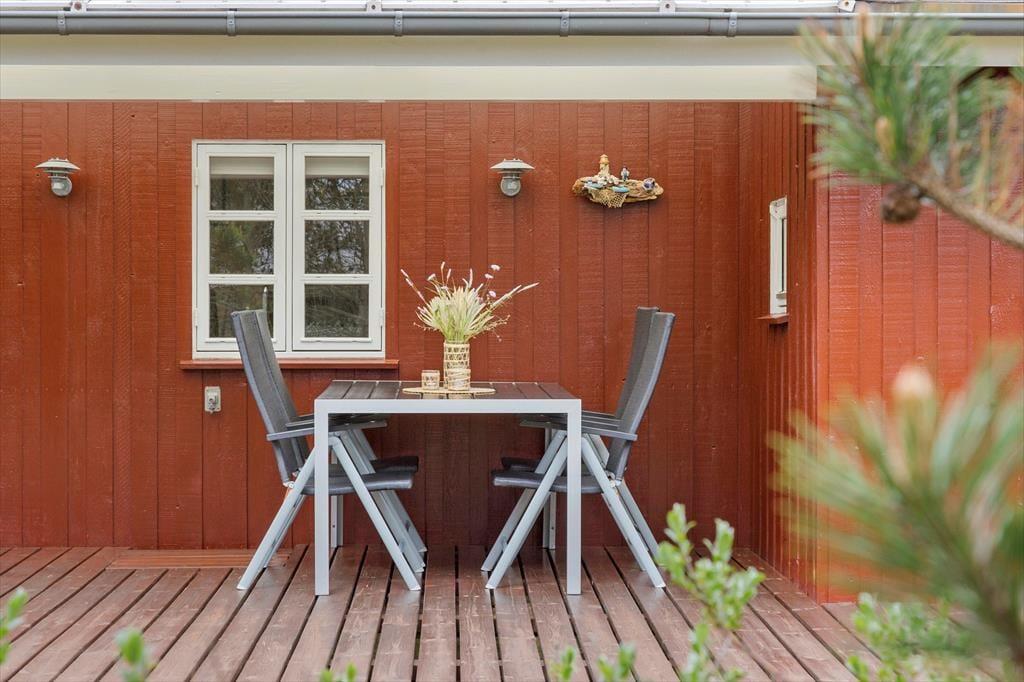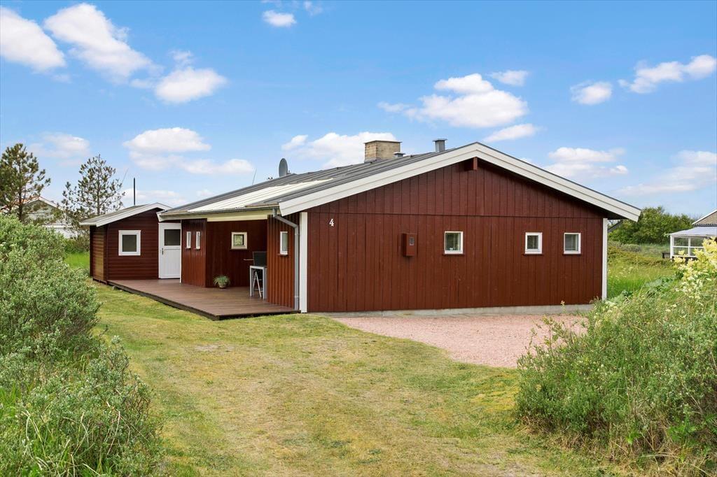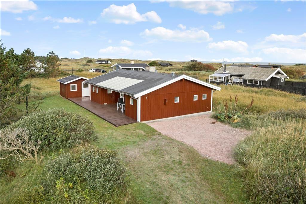Sommerhusets udendørsområder er mindst lige så indbydende som dets indre. Den store terrasse indbyder til lange dage under åben himmel, hvor du kan nyde morgenkaffen, grille aftensmaden eller blot slænge dig i en liggestol og lade solen varme ansigtet. Huset ligger på en naturskøn grund med masser af plads til fri leg og aktiviteter, samtidig med at de omkringliggende træer skaber et fredeligt og privat miljø. Naturen er altid lige i nærheden, og en kort tur til fods fører dig direkte til de smukke klitter og den brede sandstrand ved Vesterhavet.