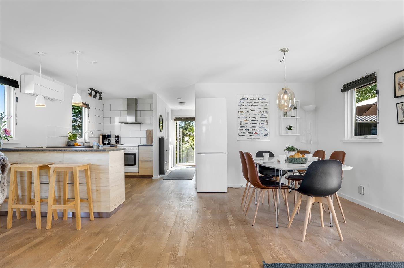 Køkkenet er udstyret med 1 køleskab. Der er 4 keramiske kogeplader, varmluftovn, mikrobølgeovn samt opvaskemaskine.