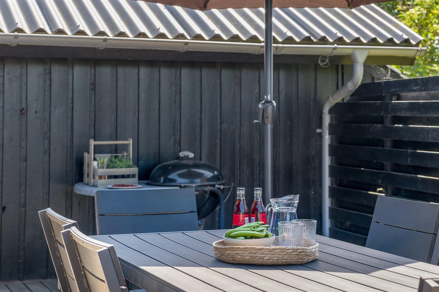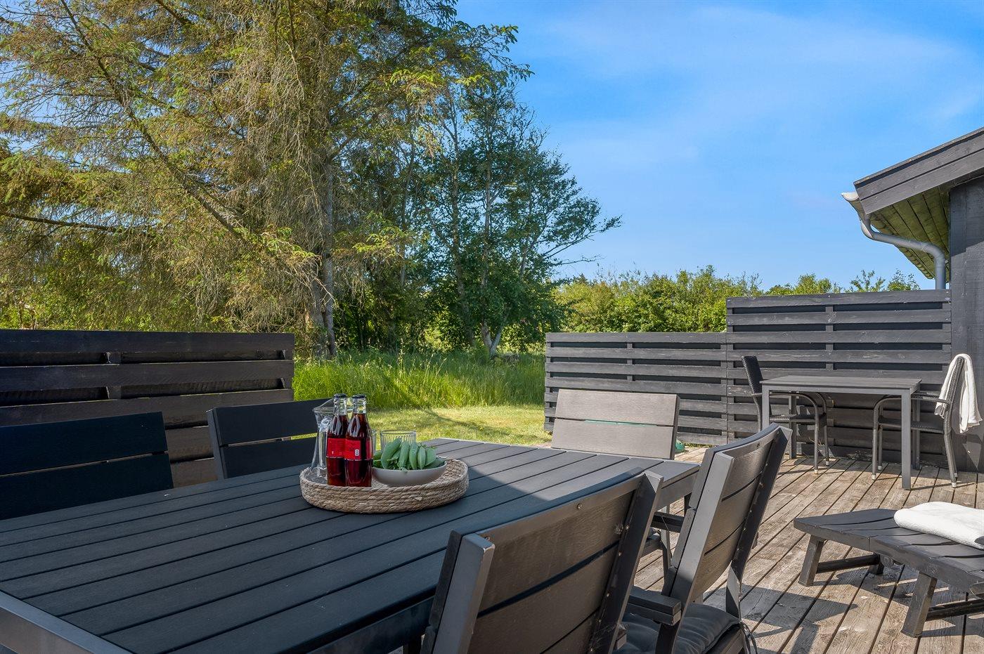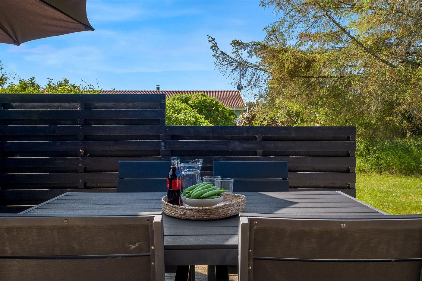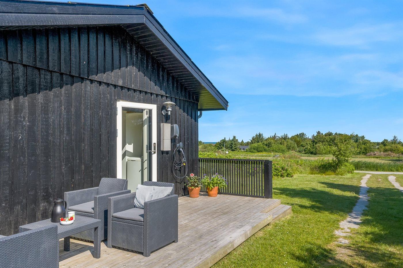 Ferieboligen er beliggende på en 2500 m² stor naturgrund. Der er 450 m til havet. Nærmeste forretning er beliggende i en afstand af 2000 m. Til ferieboligen hører åbent terrasseareal. Der ligger en legeplads i en afstand af 150 m. Der er installeret stik til opladning af elbil. Parkering ved ferieboligen.