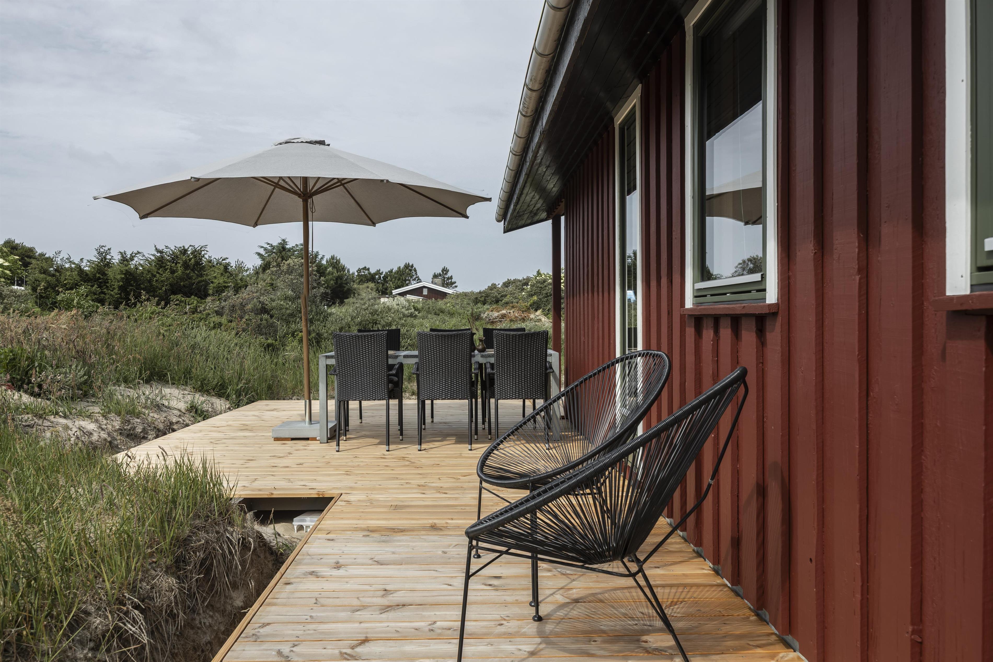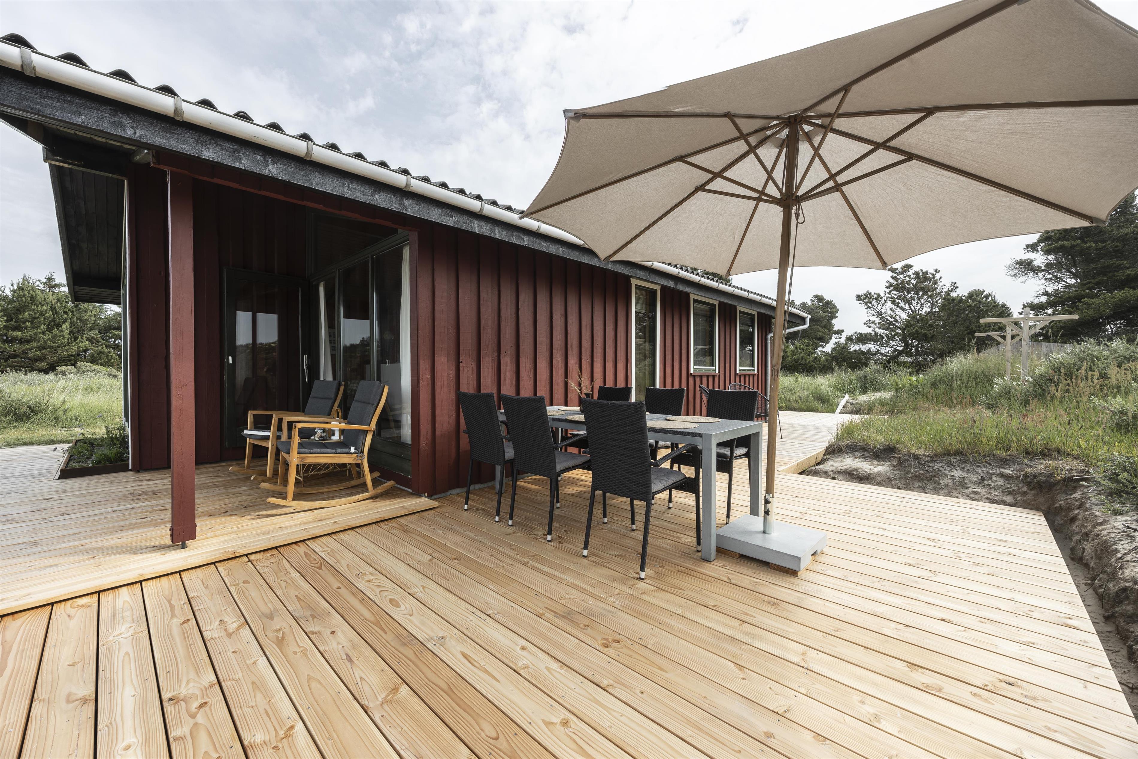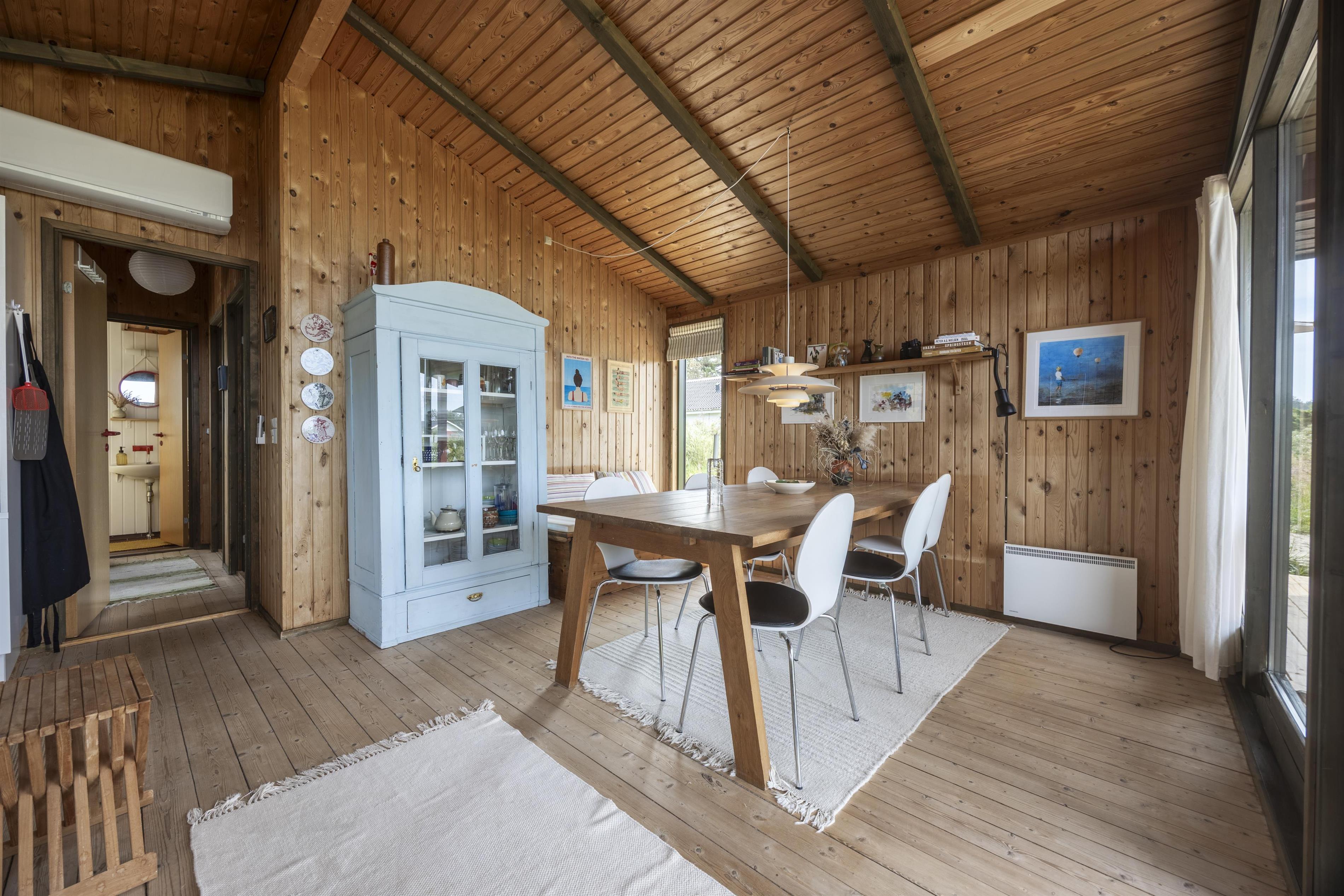 Sommerhuset ligger tilbagetrukket fra vejen, og her kan I nyde fred og ro, kun en kort gåtur fra stranden. Huset rummer et åbent køkken, som er i forbindelse med stue og spisestue, hvilket skaber et skønt fællesrum. Herfra er der udgang til en hyggelig, lille overdækket terrasse, hvor man kan sidde og fx. nyde solnedgangen. Bag huset finder I et shelter samt en udebruser med både koldt og varmt vand – perfekt efter en dukkert i havet, som blot ligger et par hundrede meter væk fra huset. I huset er der også en lille pizzaovn på gas, og der arbejdes på nye terrasser, som forventes klar til foråret 2025. Huset er energivenligt med varmepumpe, og der er desuden opsat ladestander til elbiler.