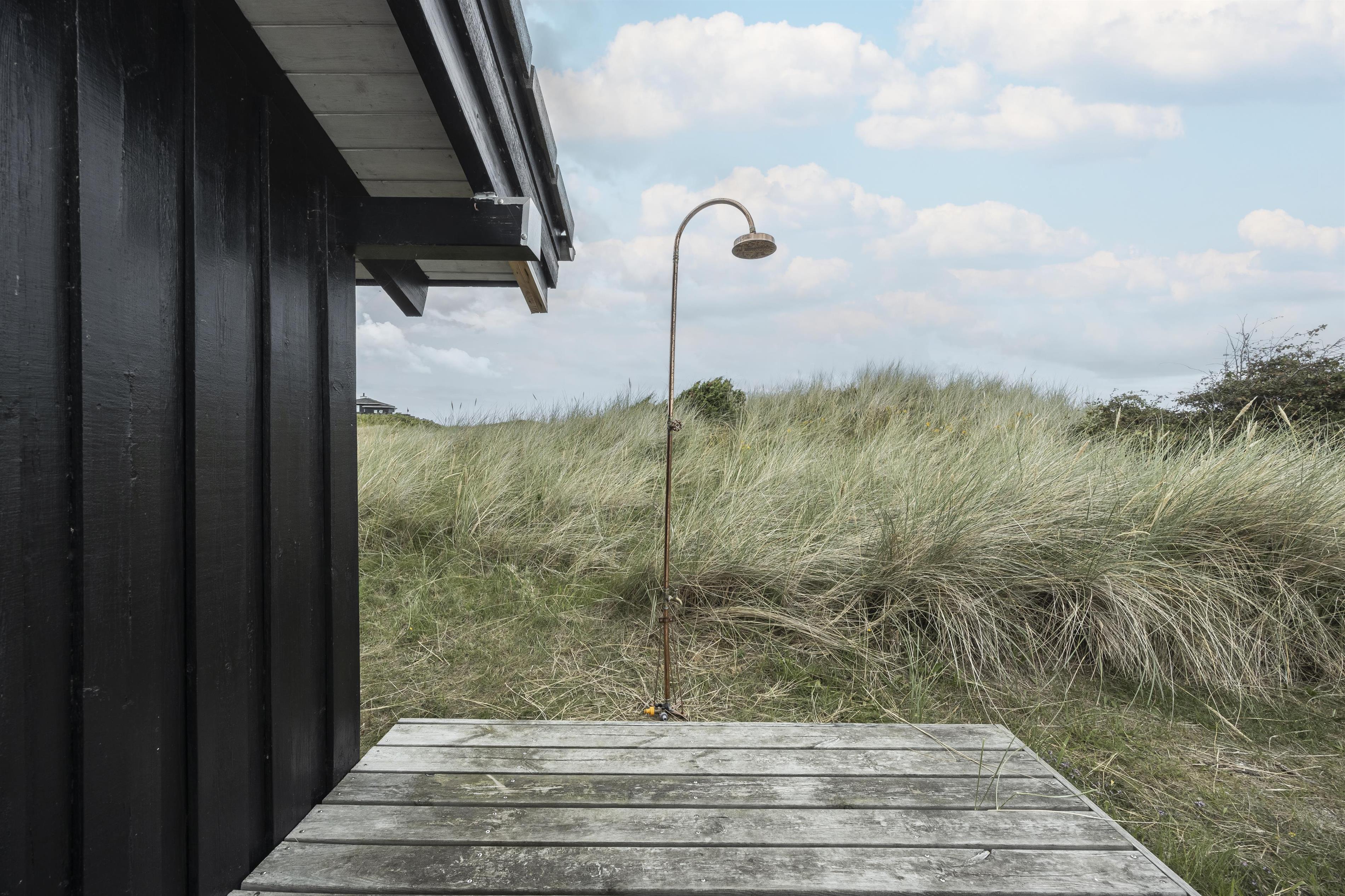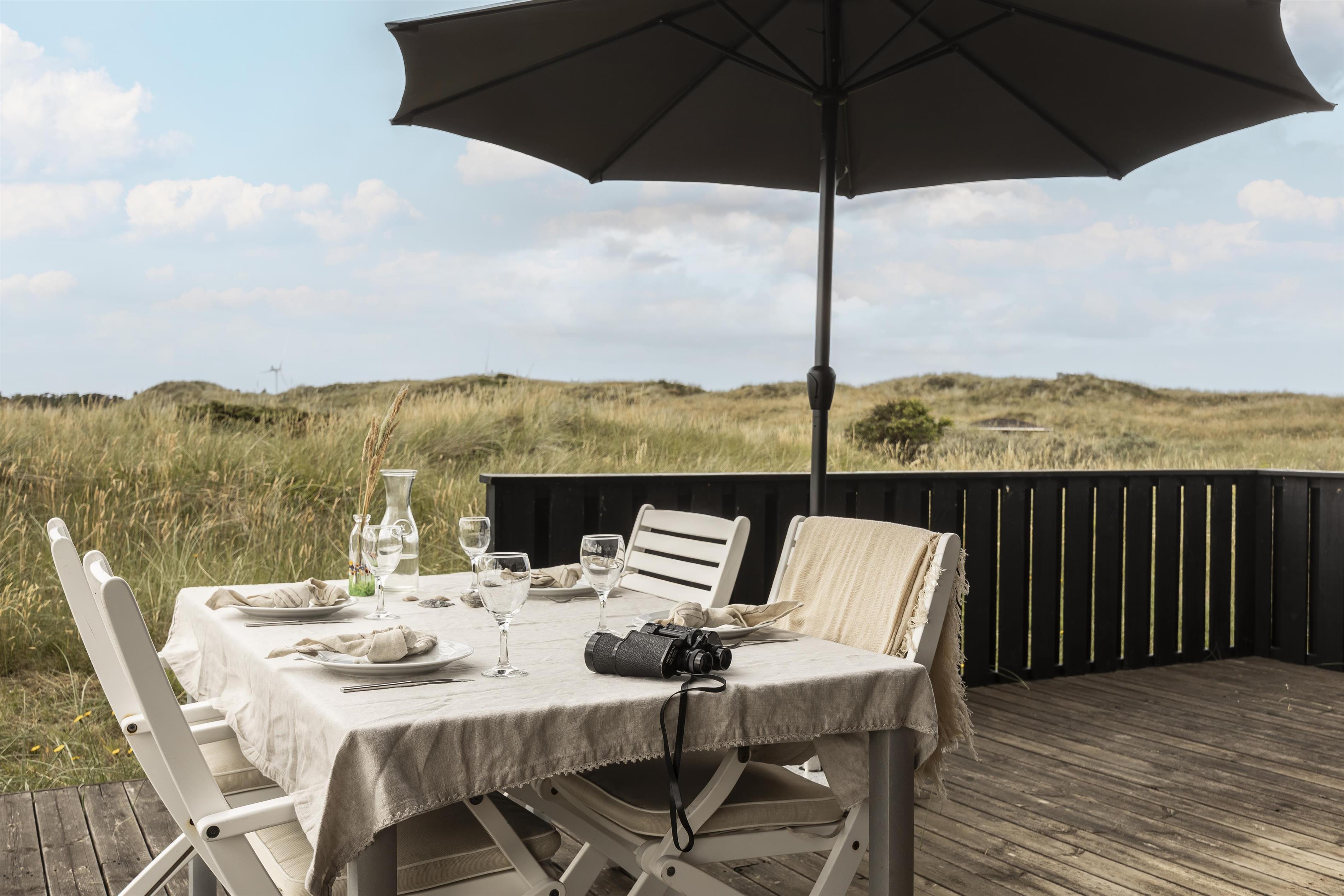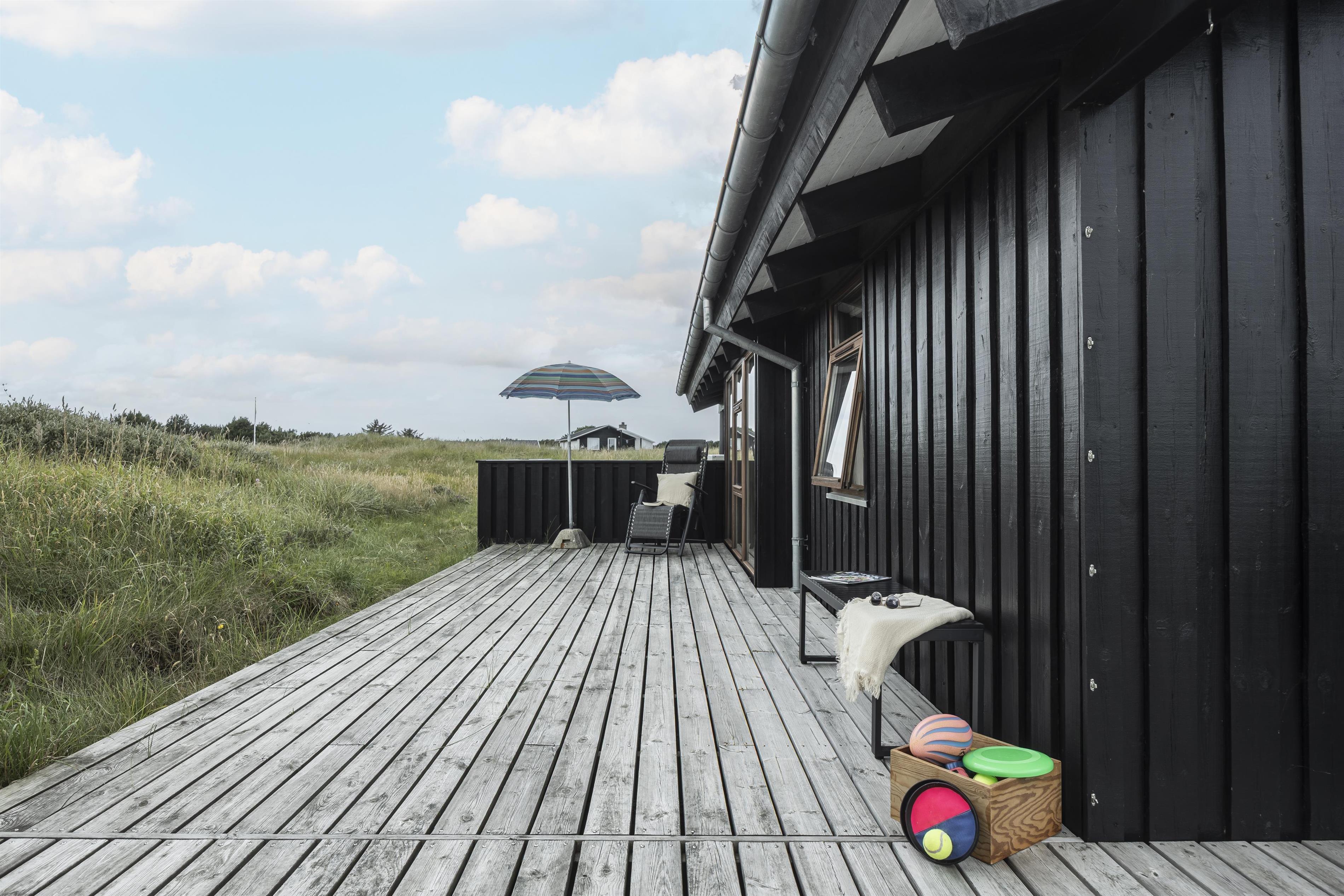 De udendørs faciliteter er mindst lige så tiltalende som indenfor. Feriehuset har dejlige terrasser på begge sider, så der altid er mulighed for at finde sol og læ – eller bare nyde en stille stund med kaffe og bøger. Den overdækkede terrasse giver ekstra komfort, uanset vejret, og her kan I sidde ugeneret med udsigt til klitterne. Med kun 125 meter til stranden kan I høre havets brusen og tage aftenture til klitternes top for at opleve solnedgangen over Vesterhavet.