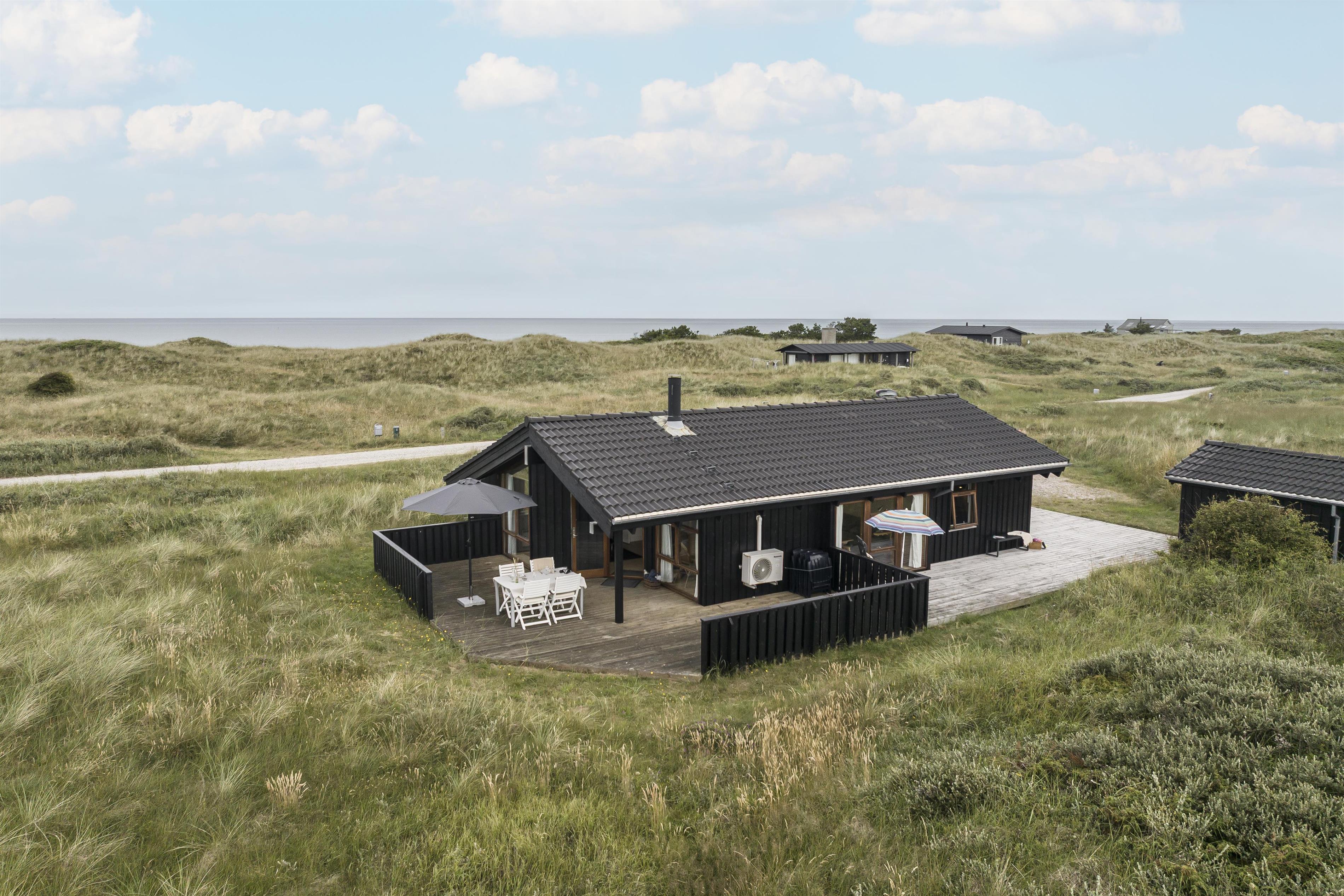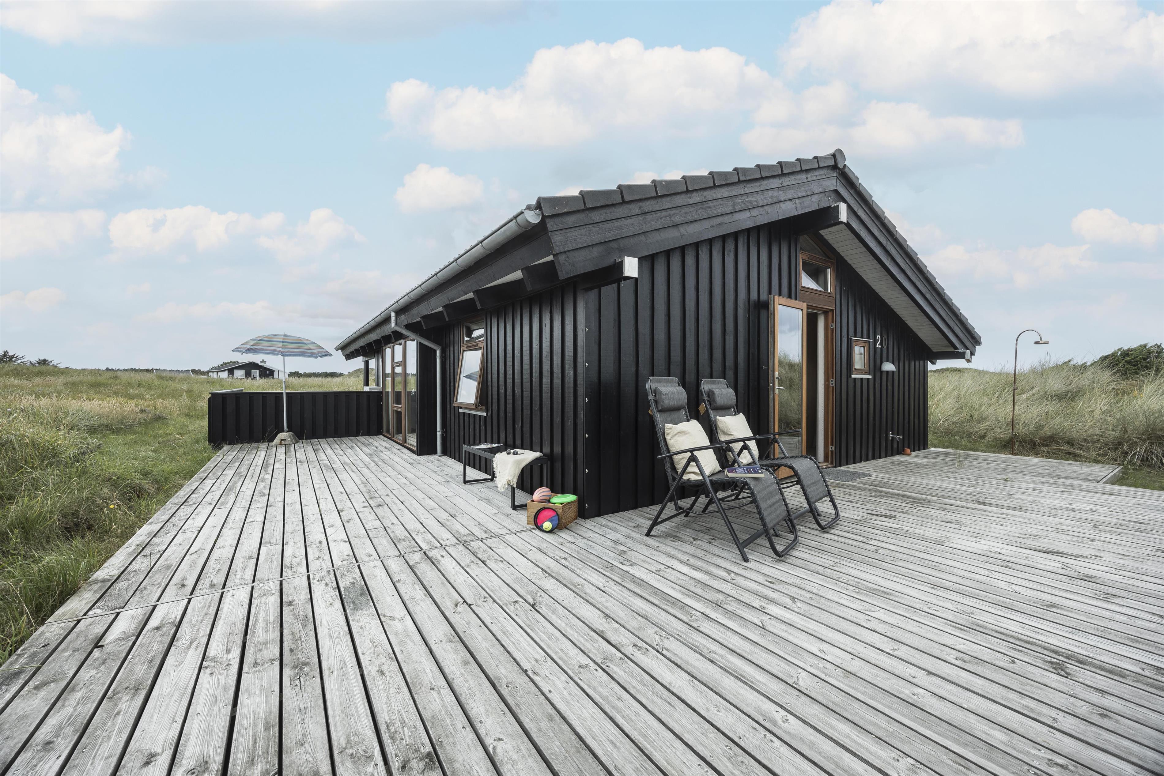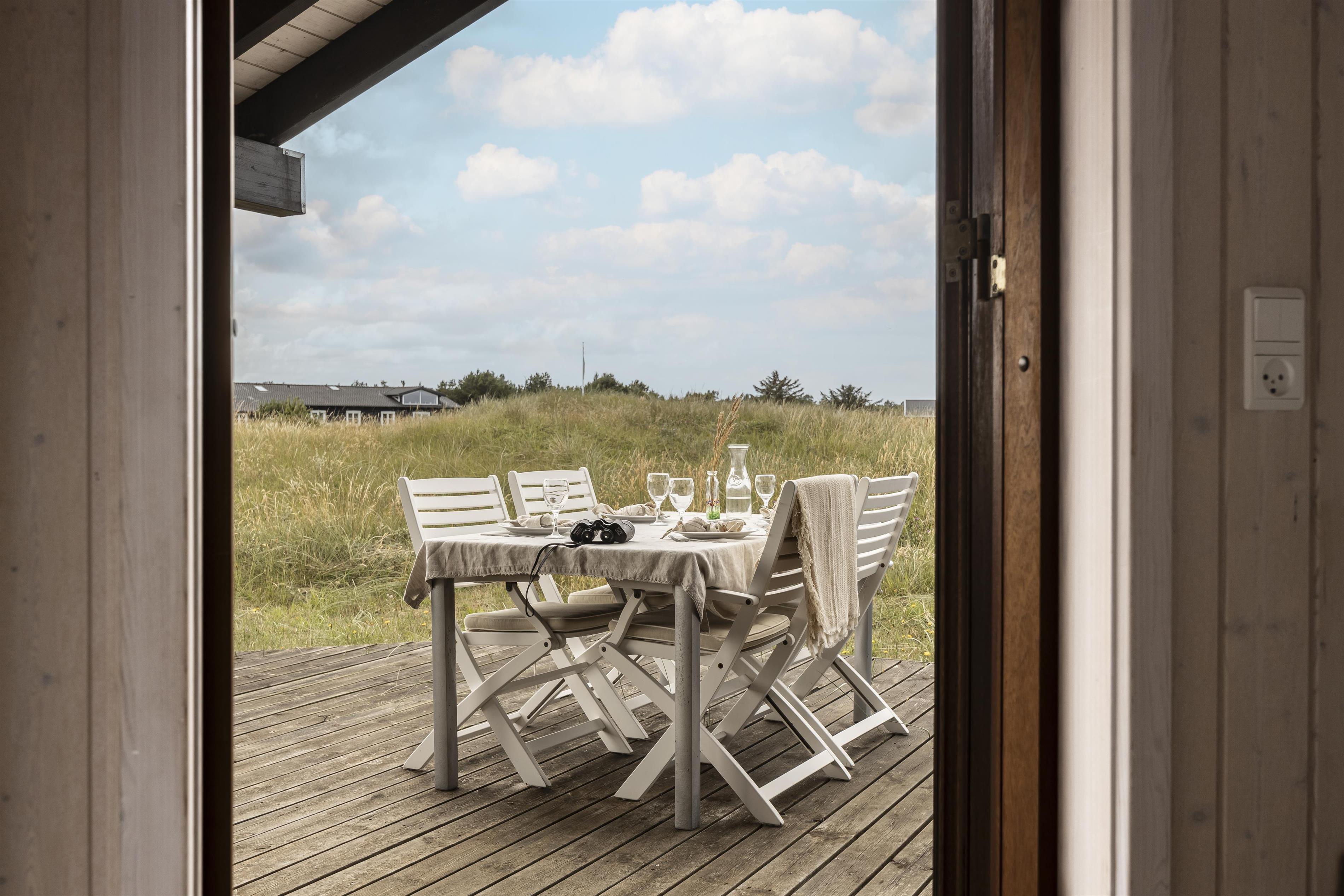 De udendørs faciliteter er mindst lige så tiltalende som indenfor. Feriehuset har dejlige terrasser på begge sider, så der altid er mulighed for at finde sol og læ – eller bare nyde en stille stund med kaffe og bøger. Den overdækkede terrasse giver ekstra komfort, uanset vejret, og her kan I sidde ugeneret med udsigt til klitterne. Med kun 125 meter til stranden kan I høre havets brusen og tage aftenture til klitternes top for at opleve solnedgangen over Vesterhavet.