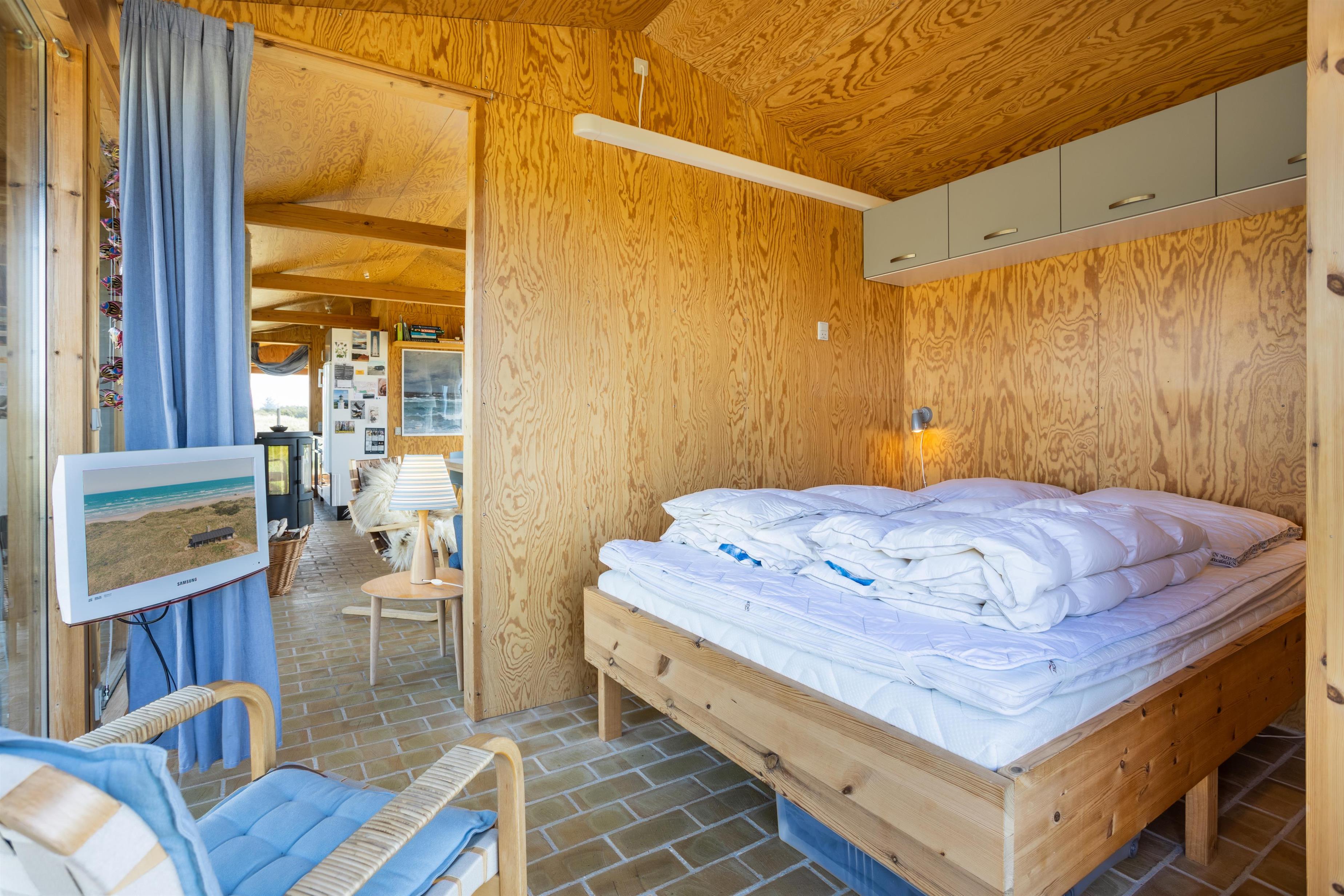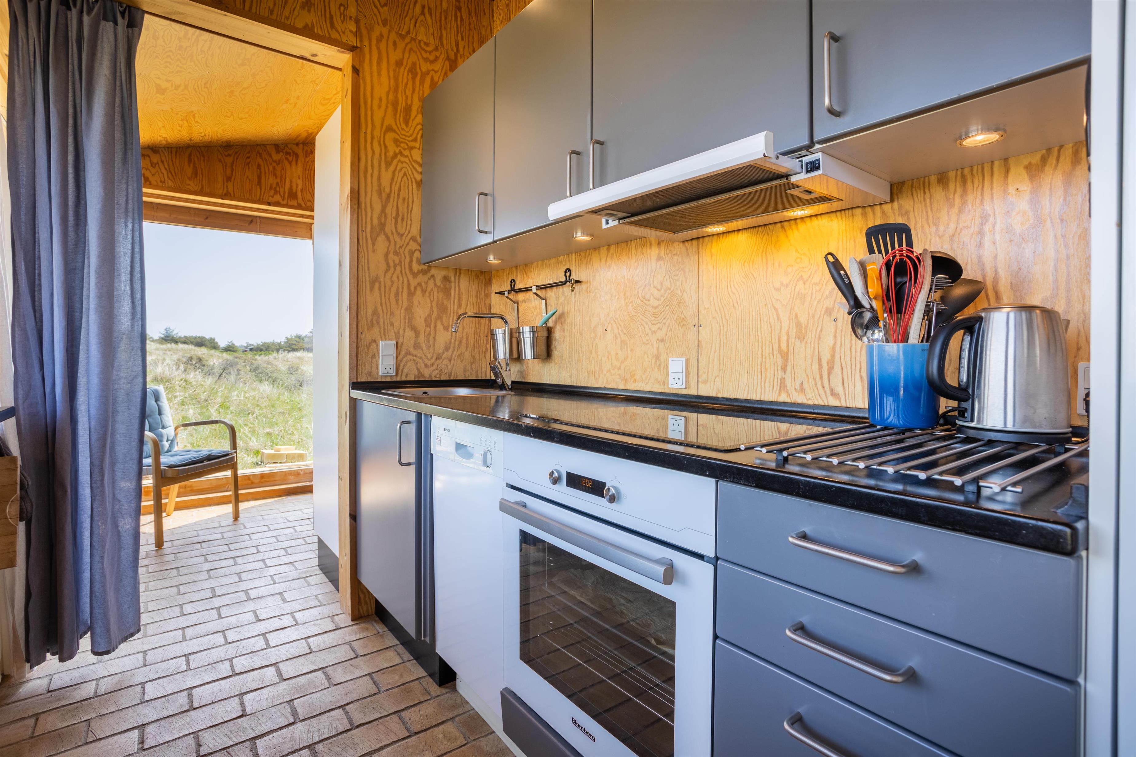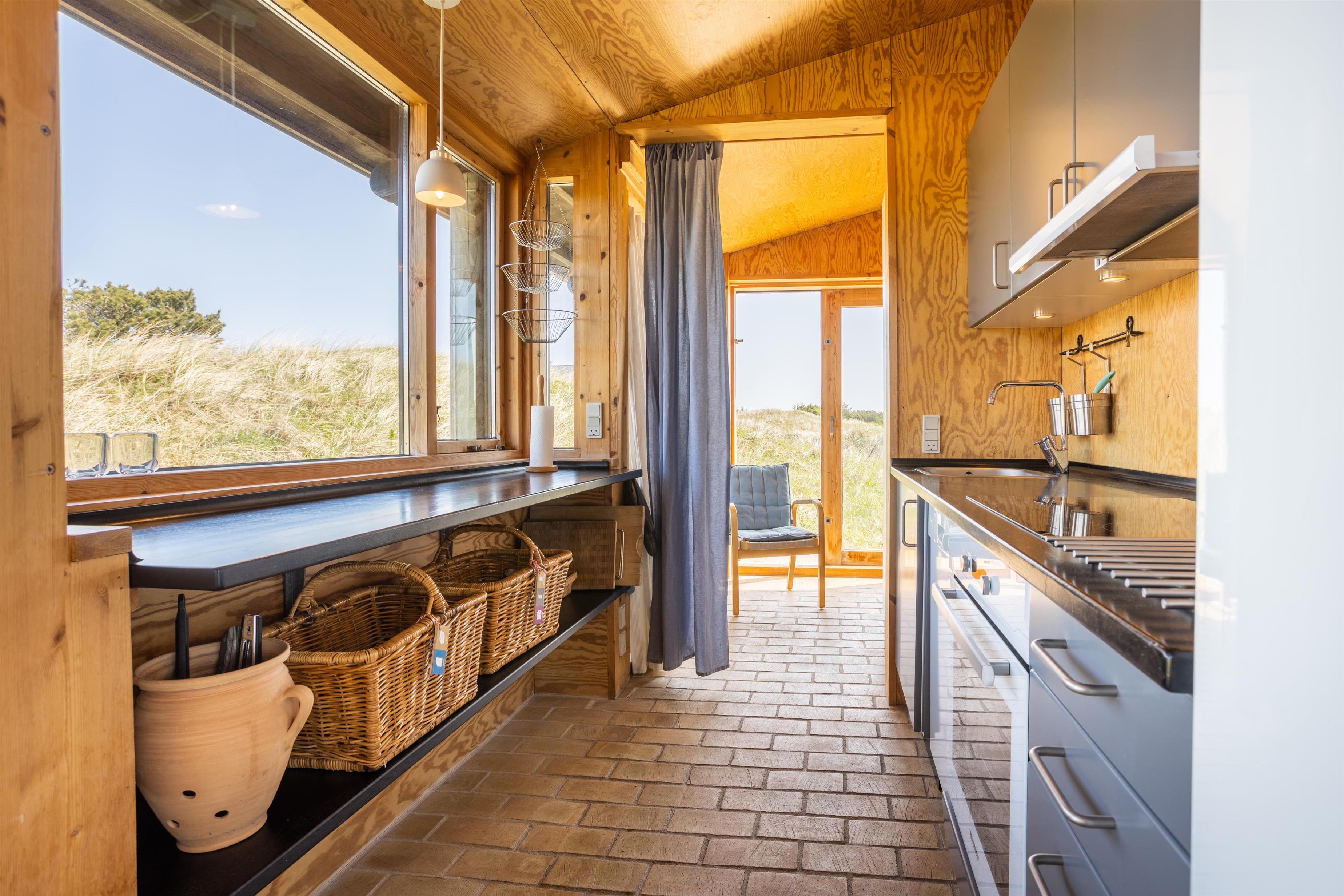 Feriehuset på 50 m² er skabt til at danne rammerne for en uforglemmelig ferie. Med loft til kip, rustikke klinkegulve og en stemningsfuld brændeovn oser huset af charme. De rustikke klinkegulve føres videre ud på de udvendige terrasser, så man får fornemmelsen af at være i et med naturen, selvom man færdes inde i huset. De store vinduespartier i alle rum lukker både lys og natur ind i huset og skaber en helt særlig stemning. Det åbne opholdsrum med stue, spiseplads og funktionelt køkken er hjertet i huset, mens to hyggelige soverum sikrer plads til afslapning for op til 5 personer. Det ene soverum har en dobbeltseng, og det andet har en dobbeltseng samt enkeltseng arrangeret som køje. Badeværelset er funktionelt med bruseniche og byder på direkte adgang til terrassen – perfekt efter en dag på stranden.