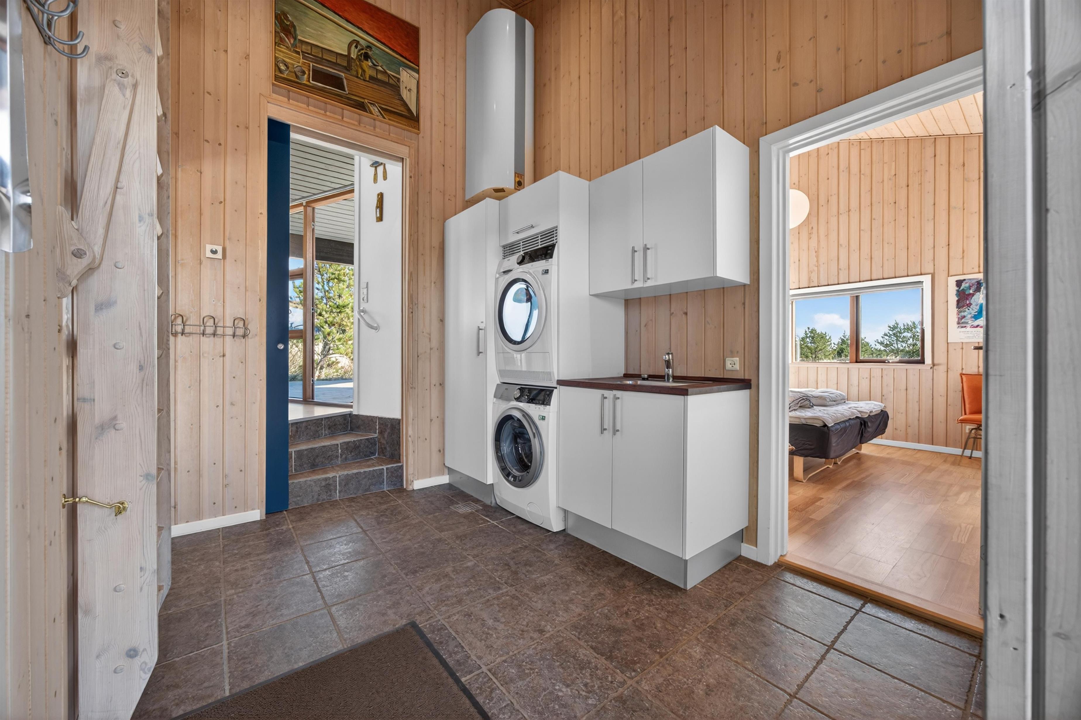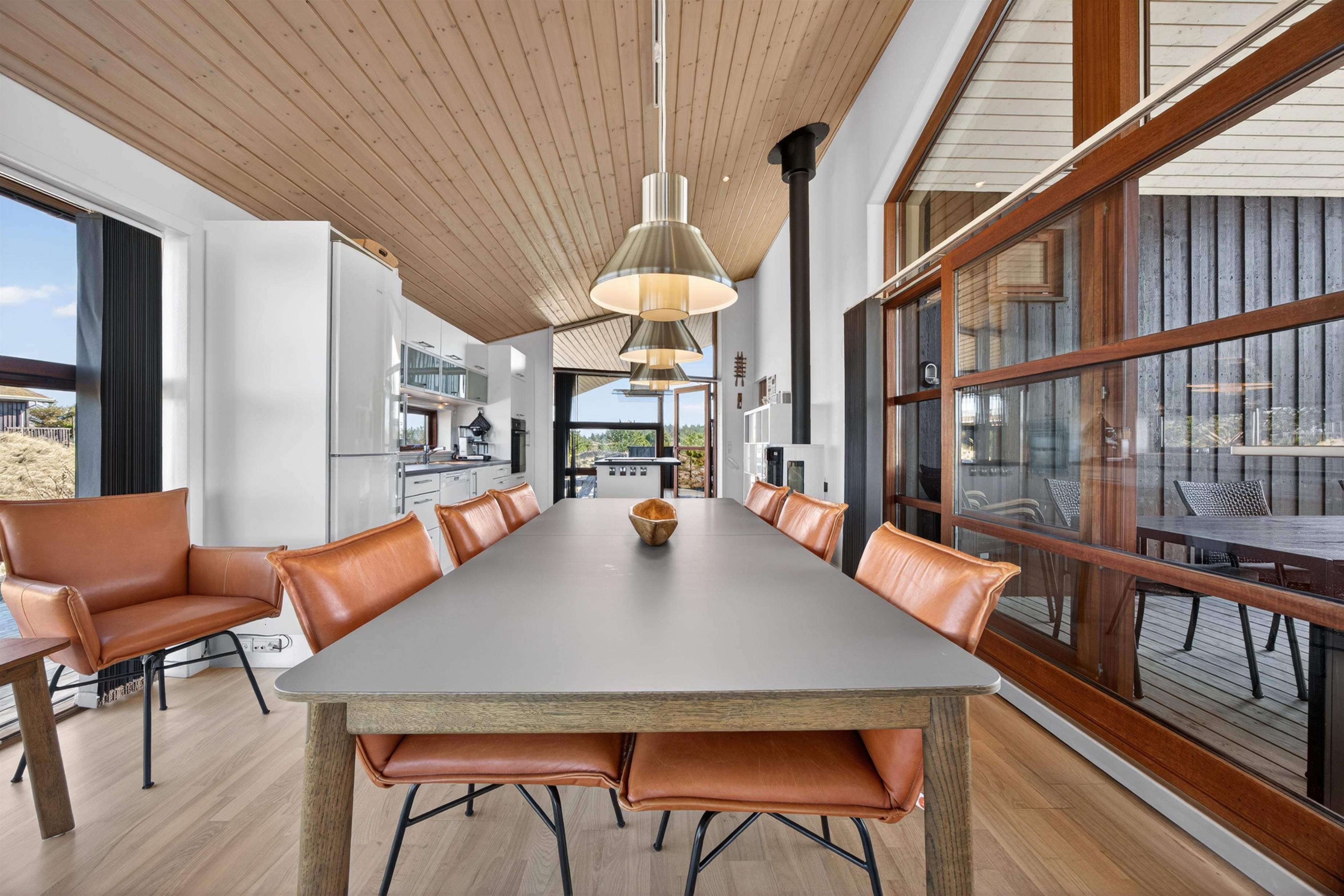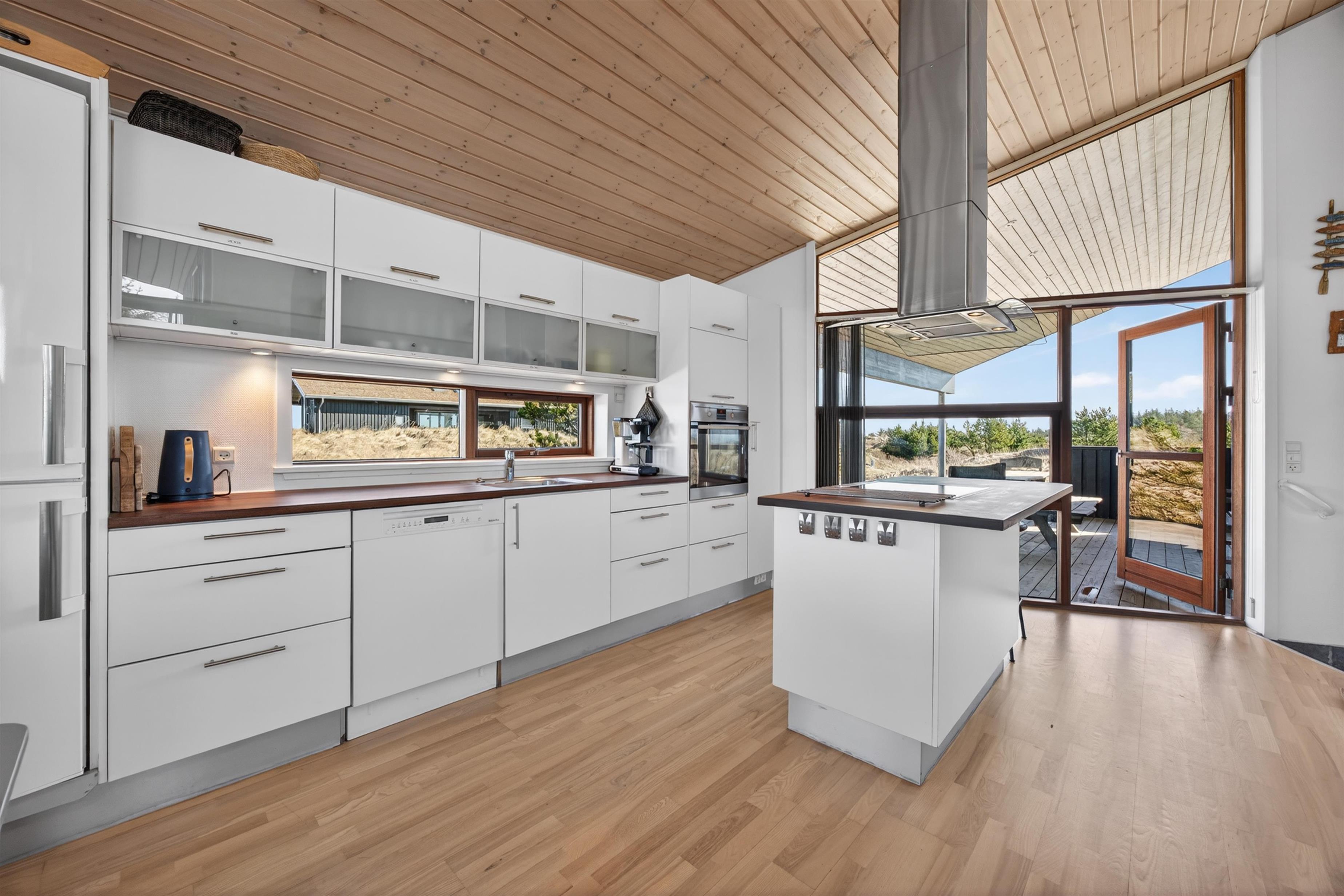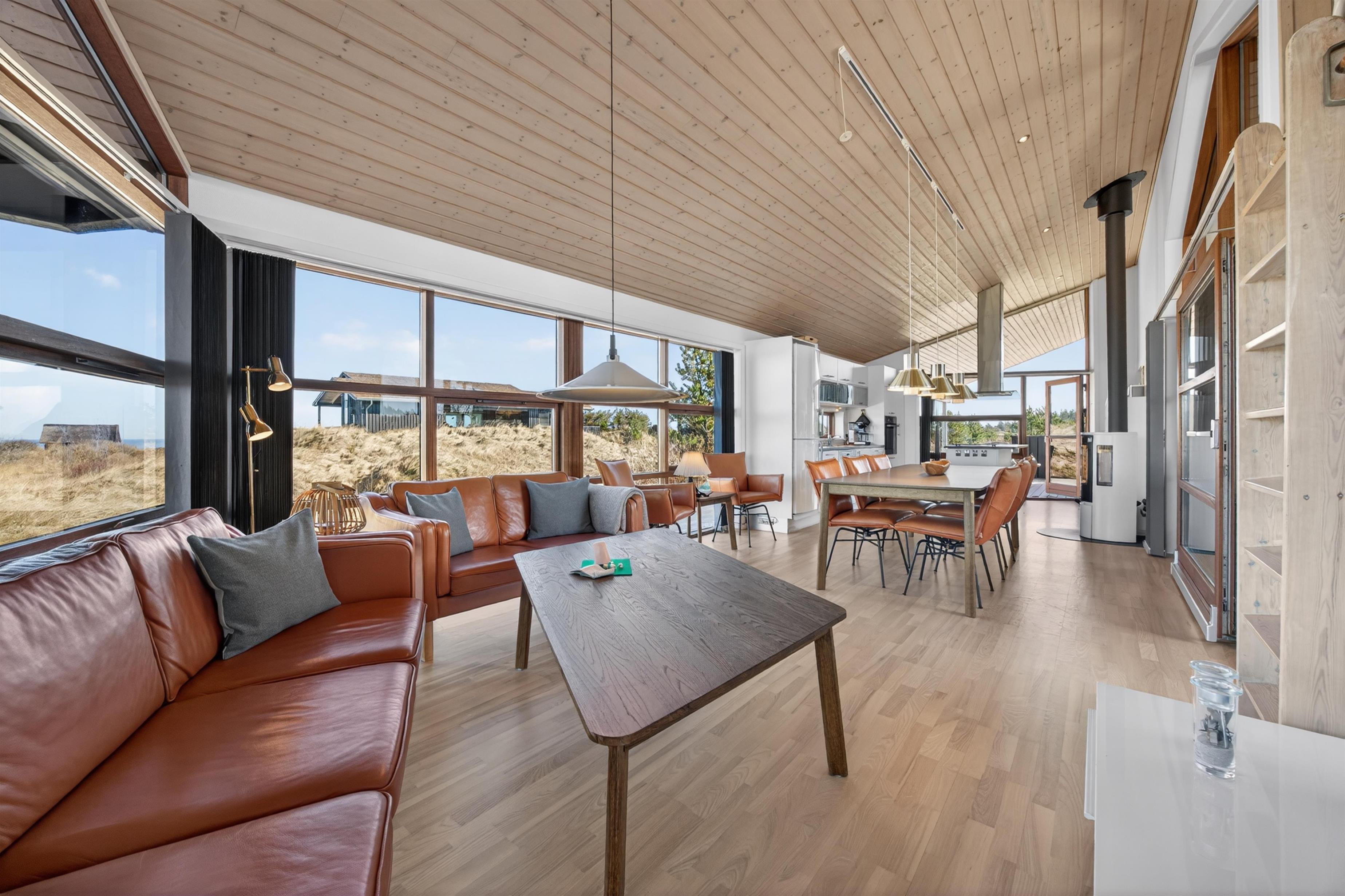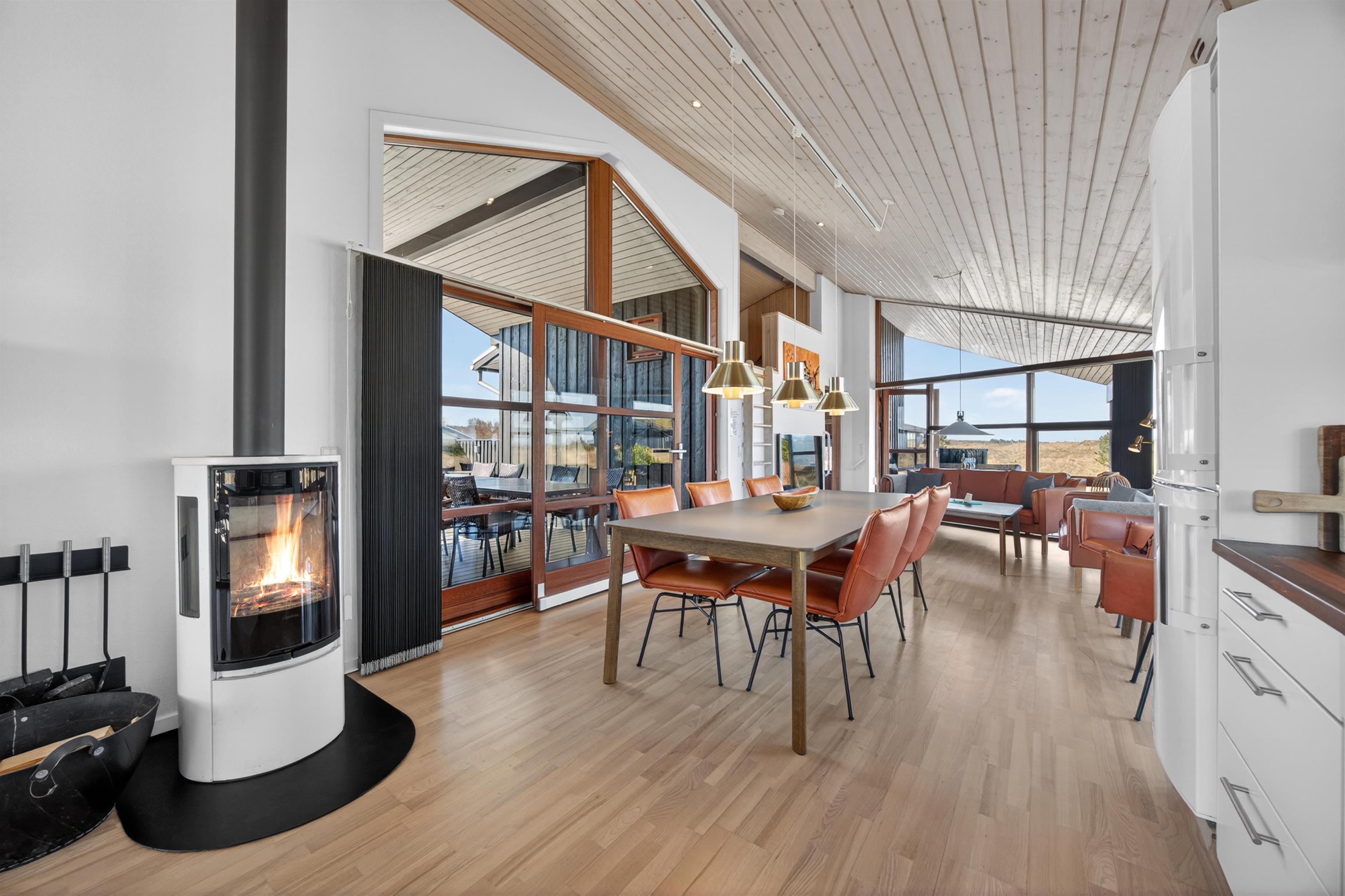 Husets naturlige samlingspunkt er det store opholdsrum, hvor det veludstyrede køkken ligger i åben forbindelse med spiseområdet. Her kan I samles om hyggelige måltider efter en dag ved stranden, mens udsigten sætter den perfekte stemning. I sofahjørnet venter ægte sommerhushygge foran brændeovnen – perfekt til brætspil, gode samtaler eller en stille stund med en bog.