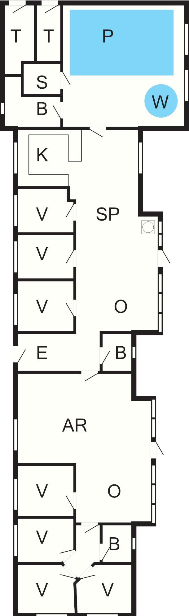 Huset er yderst rummeligt og veldimensioneret og bygget op omkring to separate soveafdelinger. Hver afdeling har et badeværelse, og der er et ekstra badeværelse i forbindelse med poolafdelingen. I alt tre badeværelser, der selvfølgelig alle har gulvvarme. Huset opvarmes i øvrigt med el-varme og energibesparende varmepumpe.