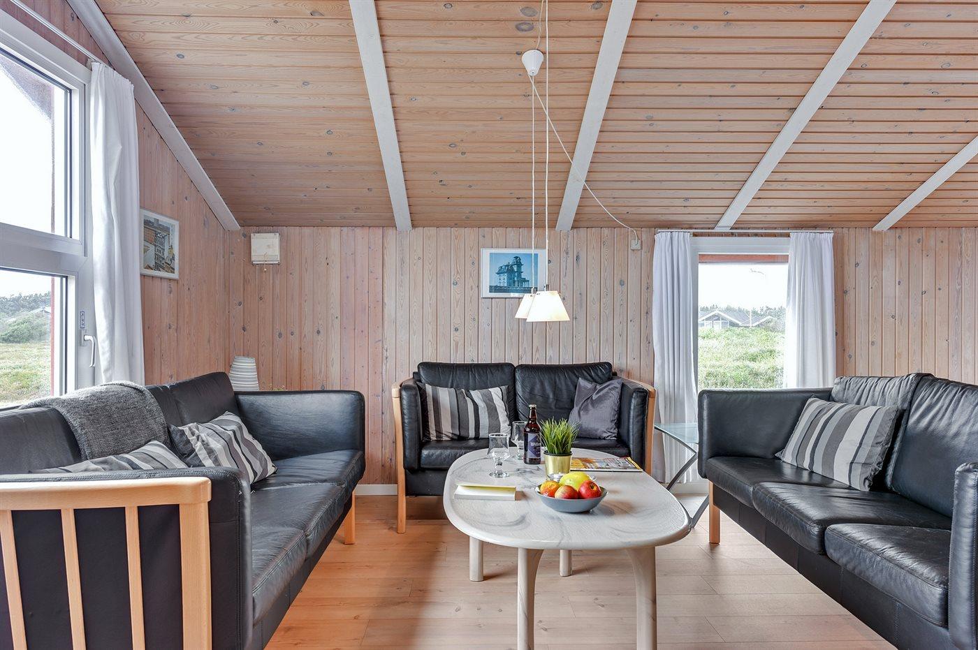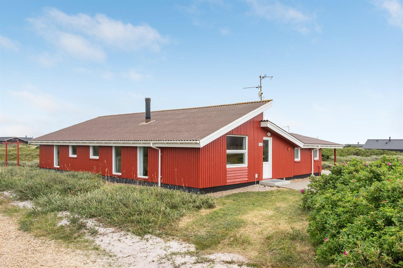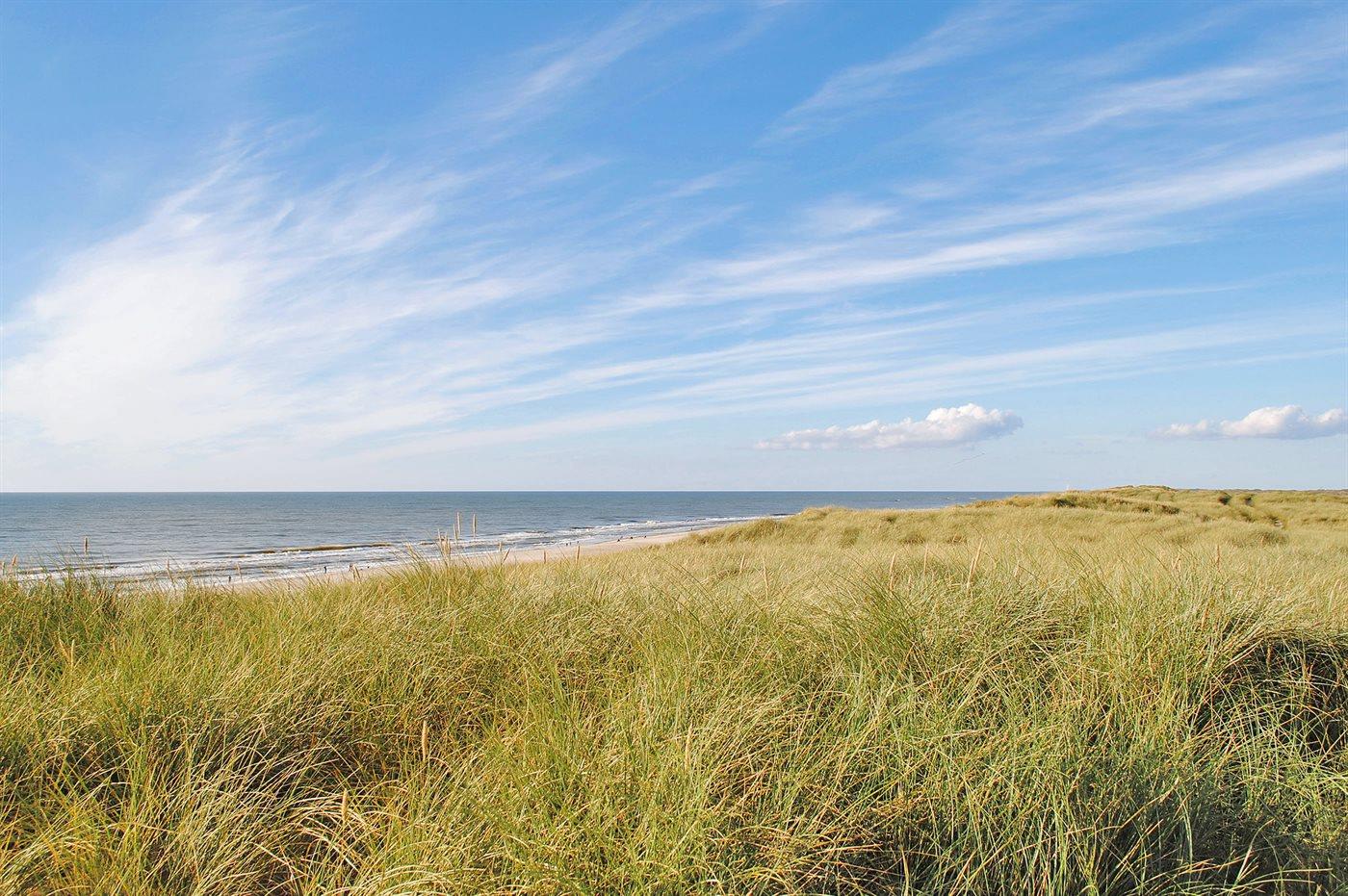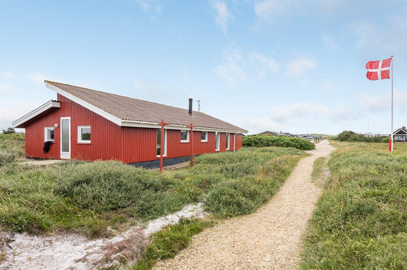Godt og rummeligt sommerhus med forskudt tag beliggende mellem hav og fjord på en let kuperet grund med lyng og græs. Huset ligger nær høje klitter, der strækker sig ned til stranden i et område med gode aktivitetsmuligheder. Der er ca. 5 min. kørsel til badebyen Søndervig, hvor der er stort supermarked, restauranter, butikker m.m.