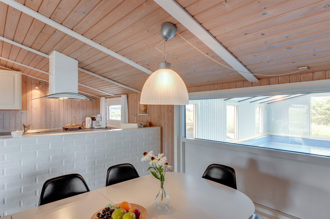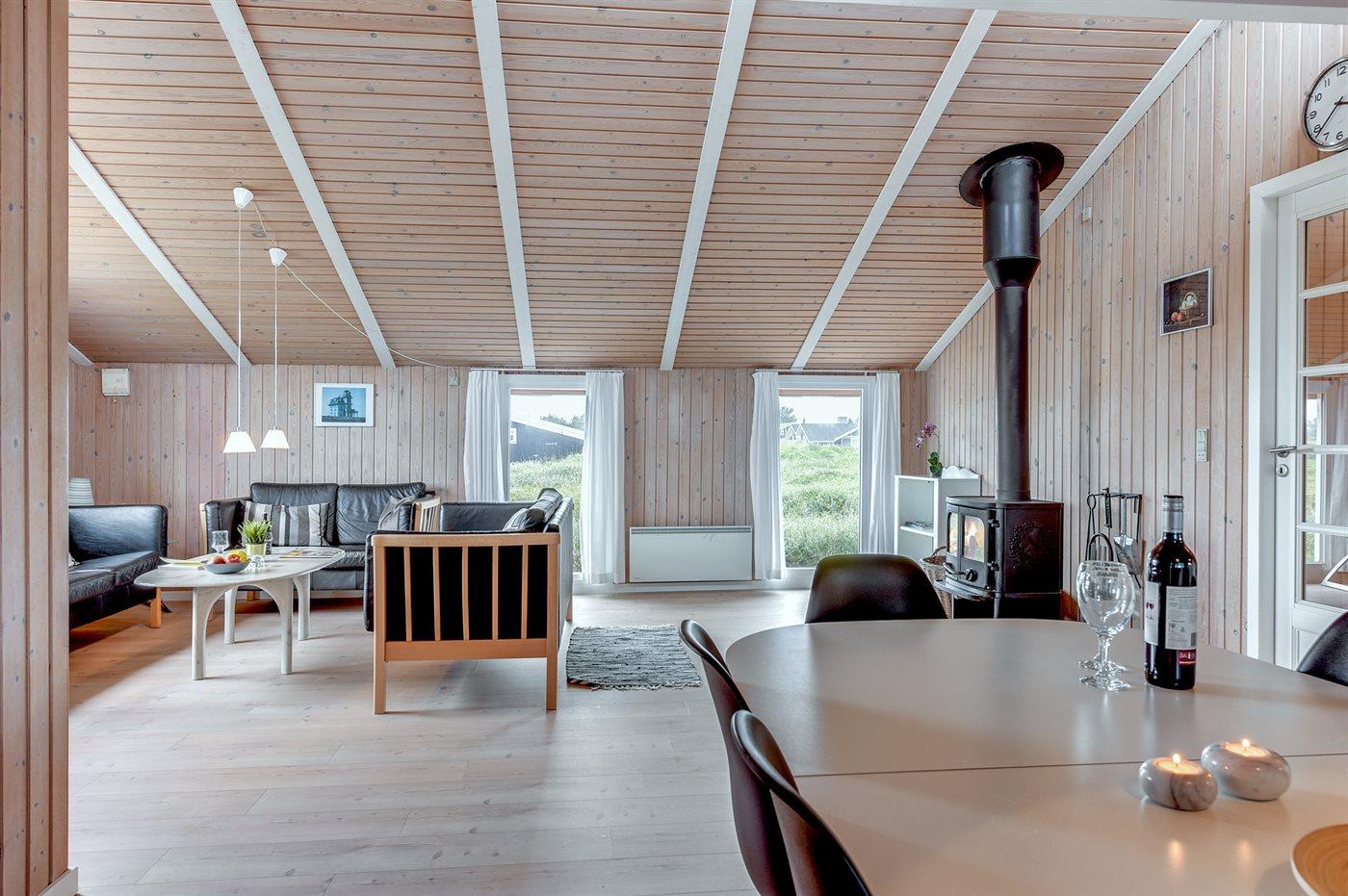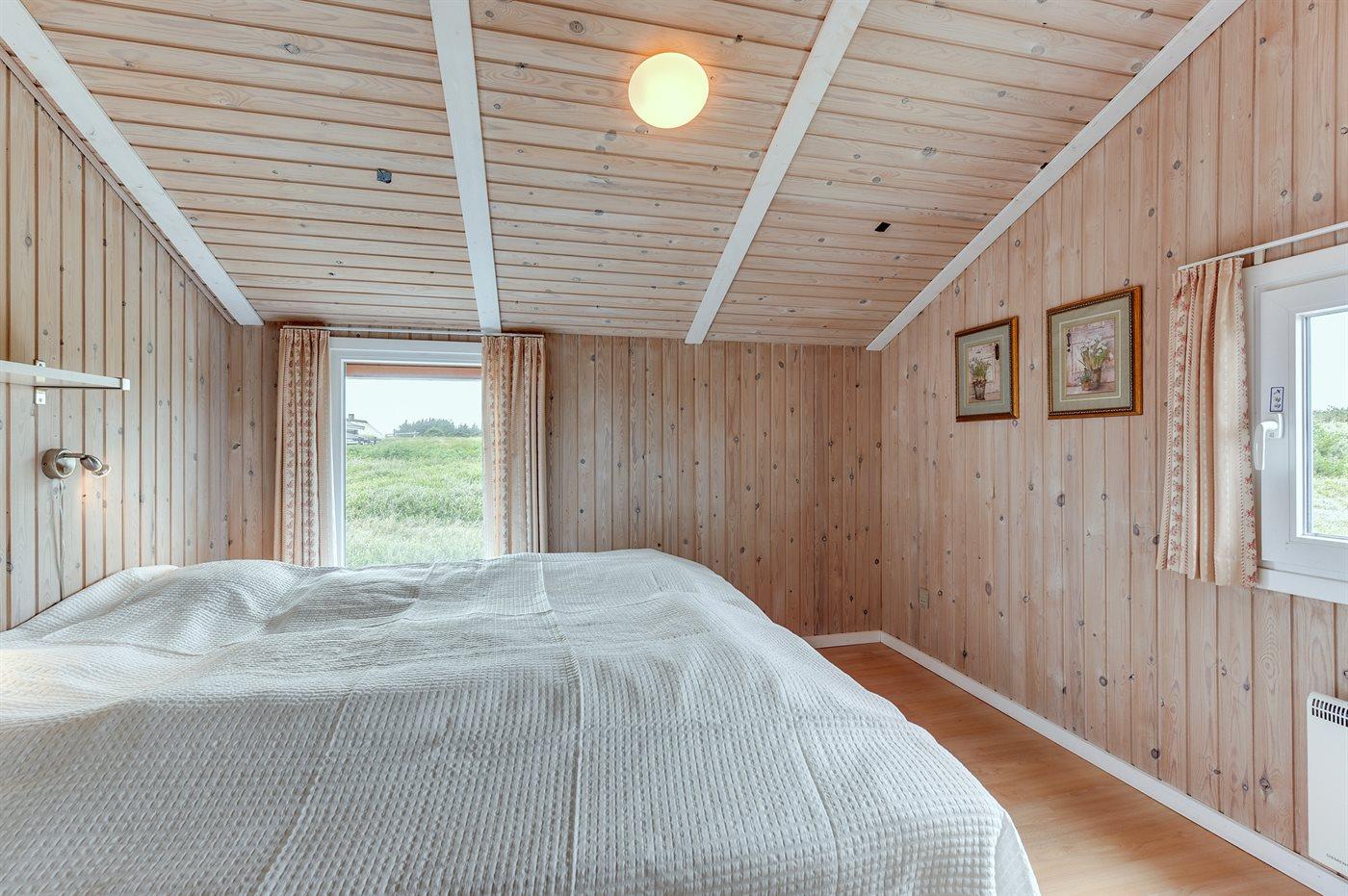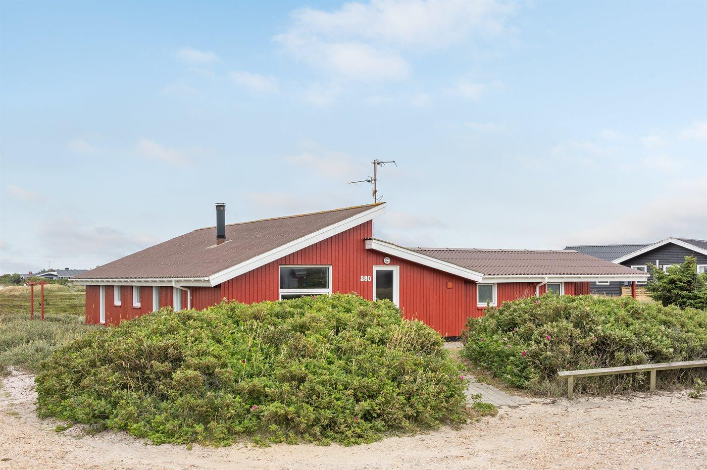 Godt og rummeligt sommerhus med forskudt tag beliggende mellem hav og fjord på en let kuperet grund med lyng og græs. Huset ligger nær høje klitter, der strækker sig ned til stranden i et område med gode aktivitetsmuligheder. Der er ca. 5 min. kørsel til badebyen Søndervig, hvor der er stort supermarked, restauranter, butikker m.m.