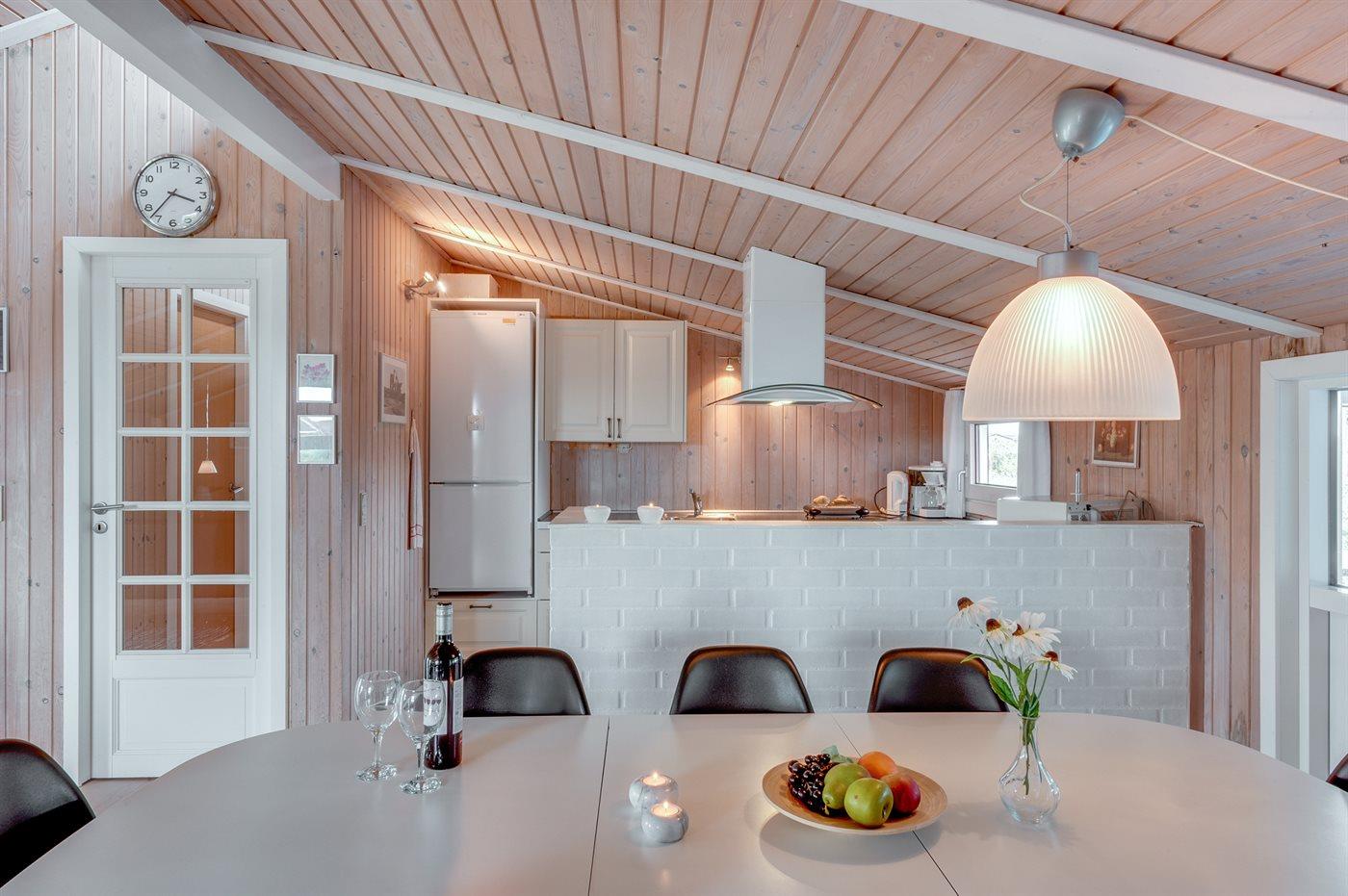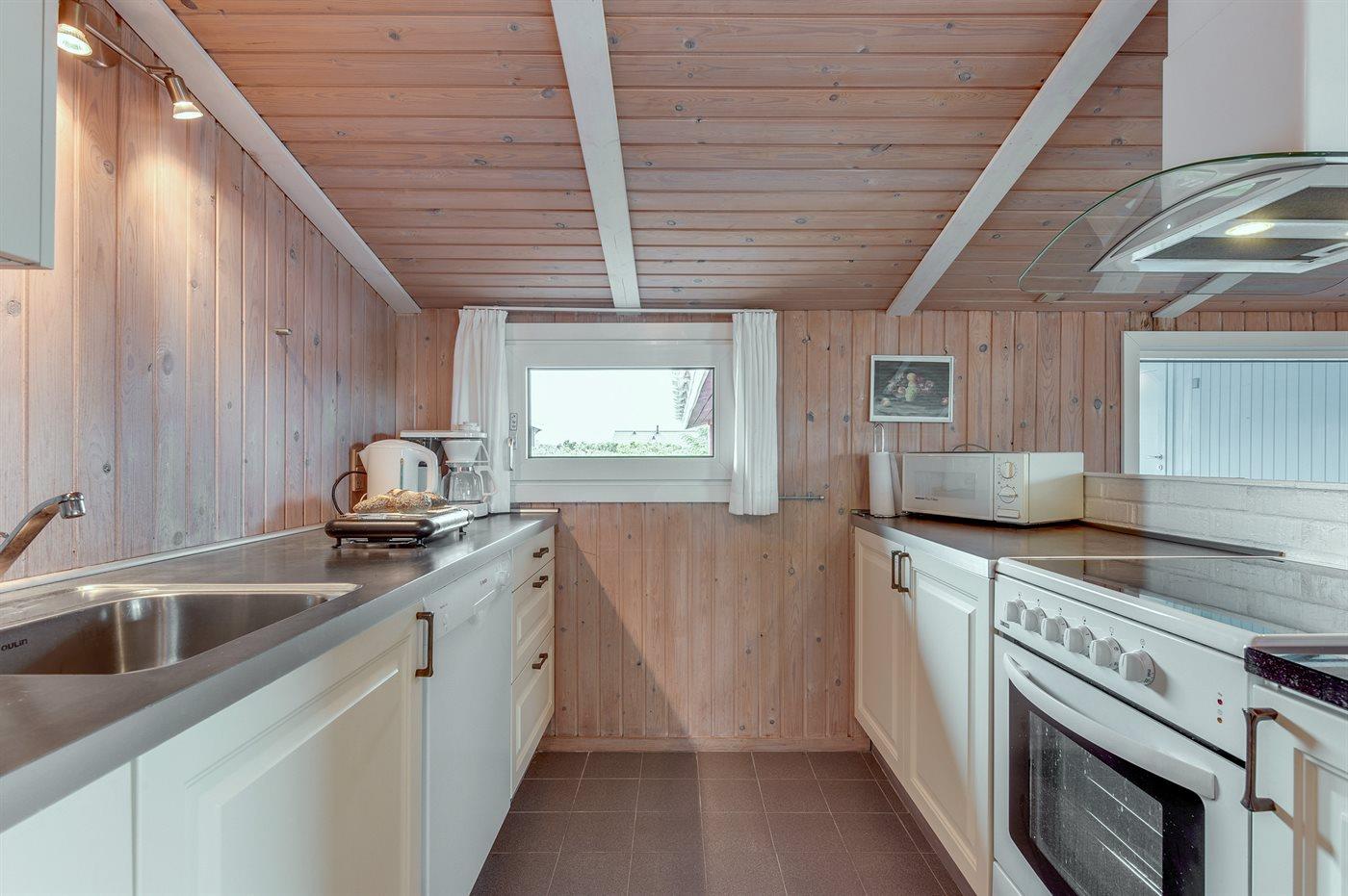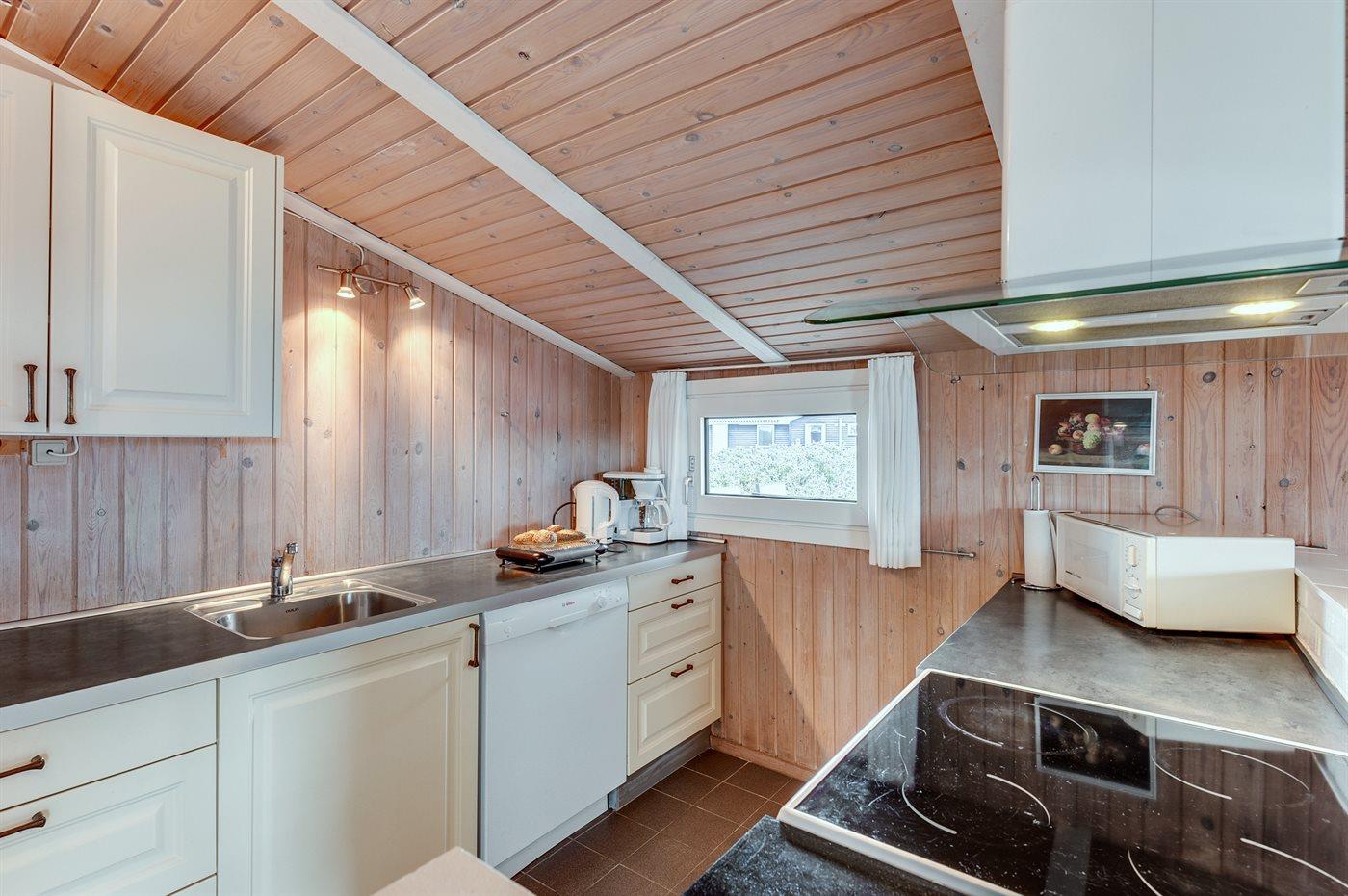 Køkkenet er udstyret med 1 køleskab. Der er 4 keramiske kogeplader, bageovn, mikrobølgeovn samt opvaskemaskine.