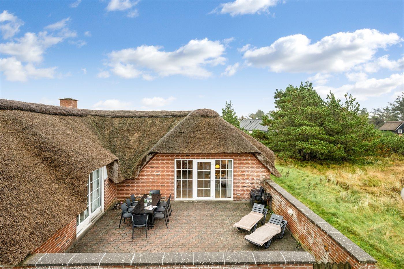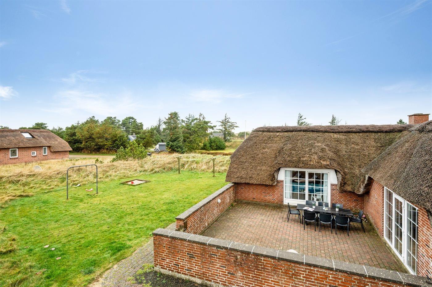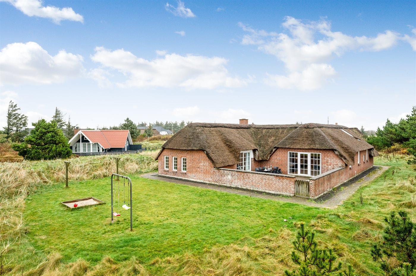 Dette charmerende sommerhus med stråtag ligger på en klitgrund nær Vesterhavet. Her kan man nyde afslappende stunder med familie og venner – både udendørs, på den helt lukkede og indhegnede terrasse, samt indendørs i de hyggelige omgivelser.