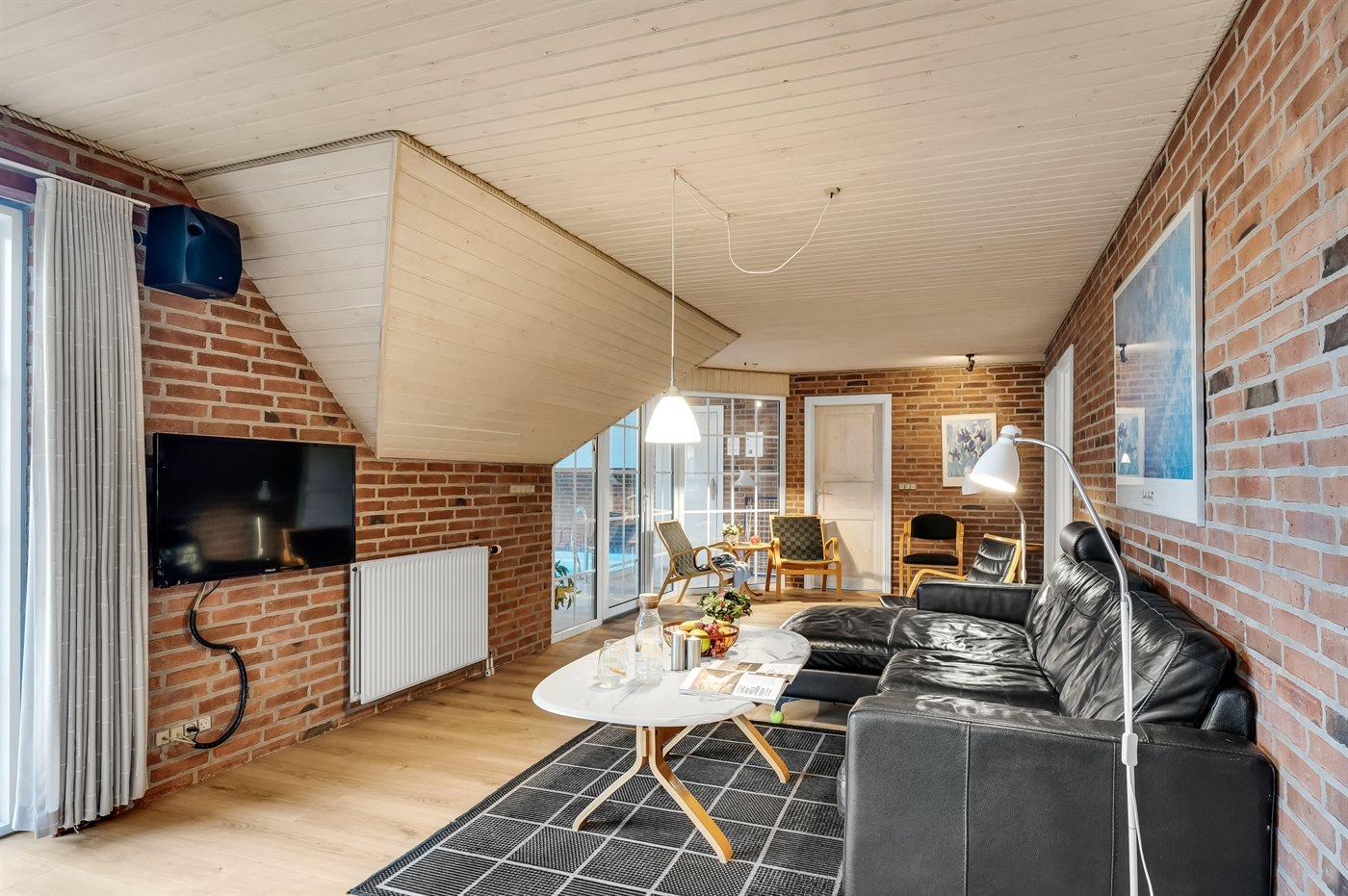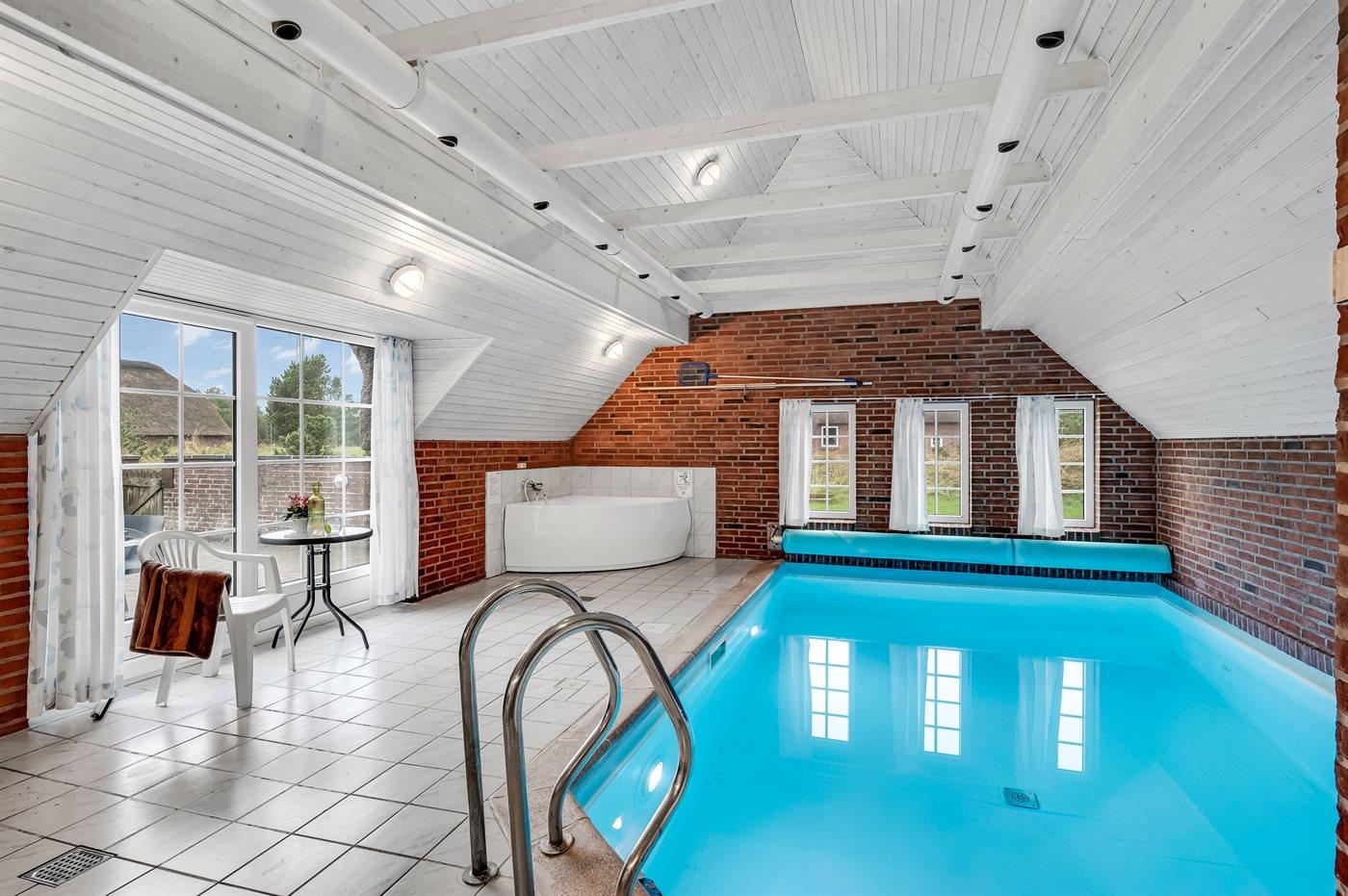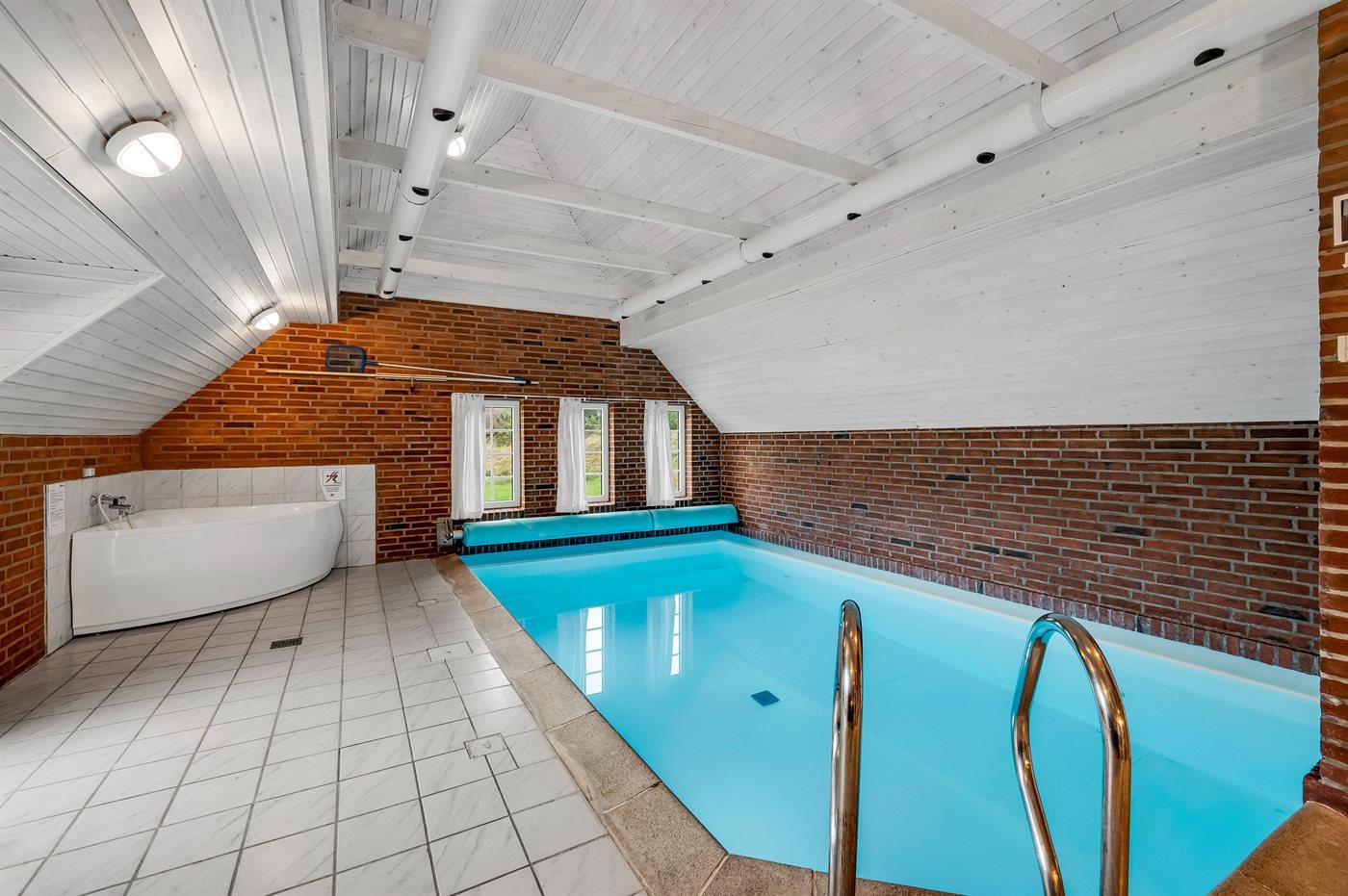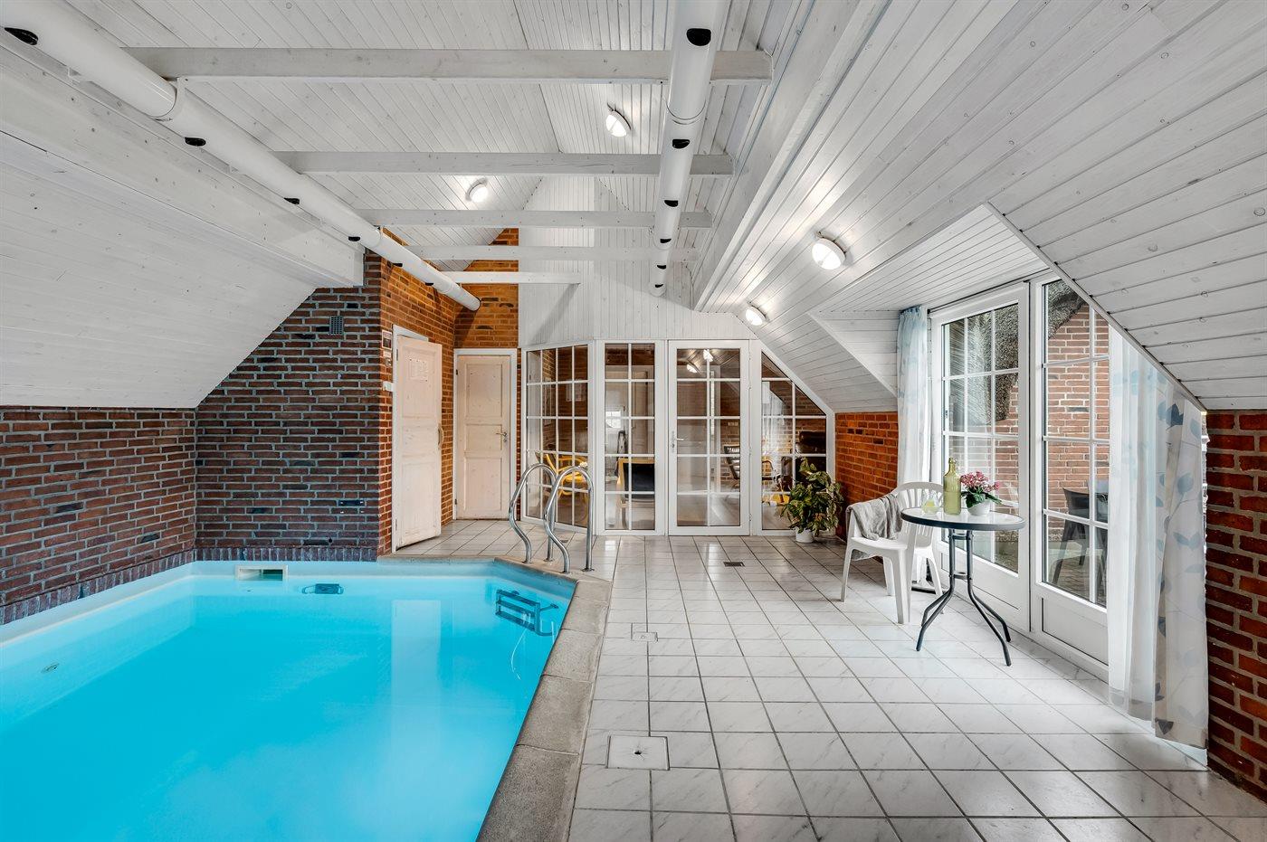 I den indendørs swimmingpool er der mulighed for leg og hyggeligt samvær. Swimmingpoolen måler op til 3,3 m i bredden, 5,6 m i længden og den er op til 1,4 m dyb. Vandet er mellem 24 og 28° C varmt. Der er gulvvarme i swimmingpoolområdet.
