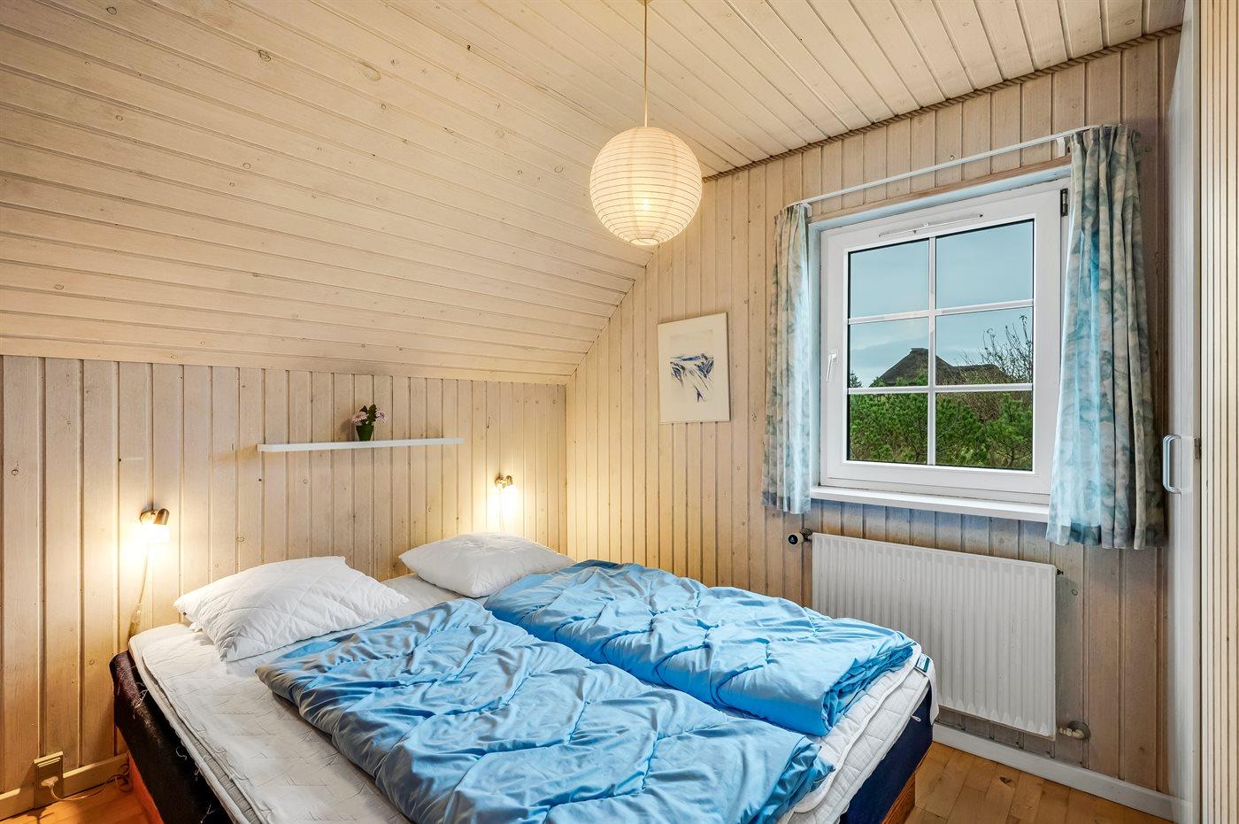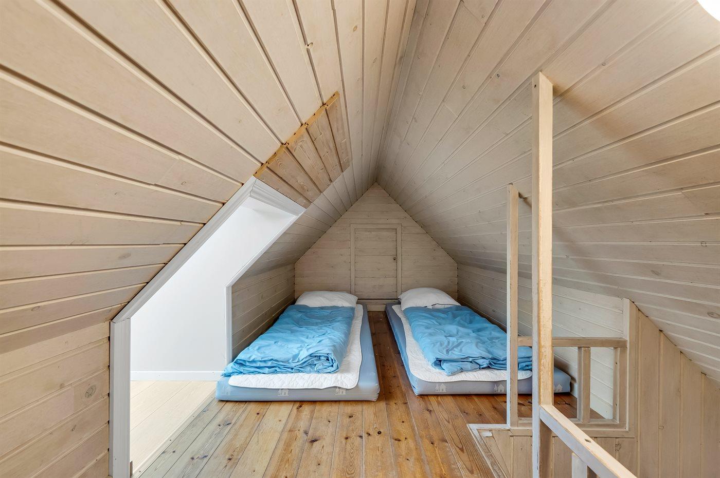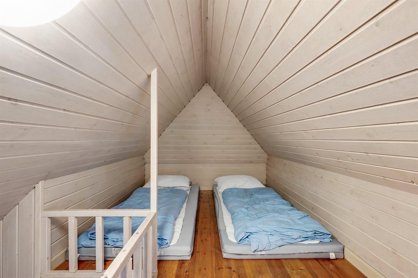 Der er i alt 5 soveværelser. Sovepladserne fordeler sig på: 8 sovepladser i dobbeltsenge. 1 soveplads i enkeltseng. 4 sovepladser på madrasser. 4 af disse sovepladser befinder sig på husets hems. Derudover er der 1 stk. barneseng.