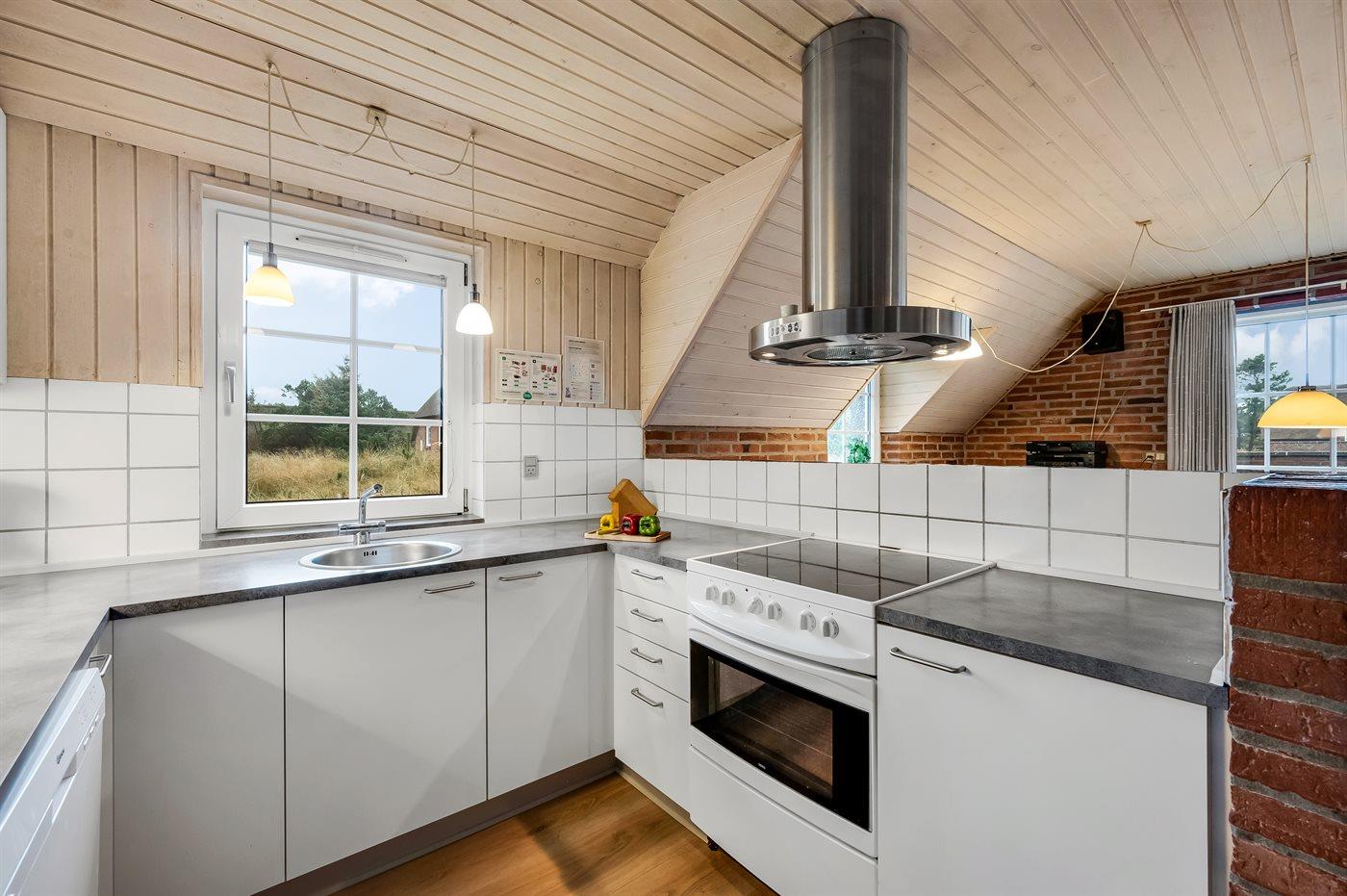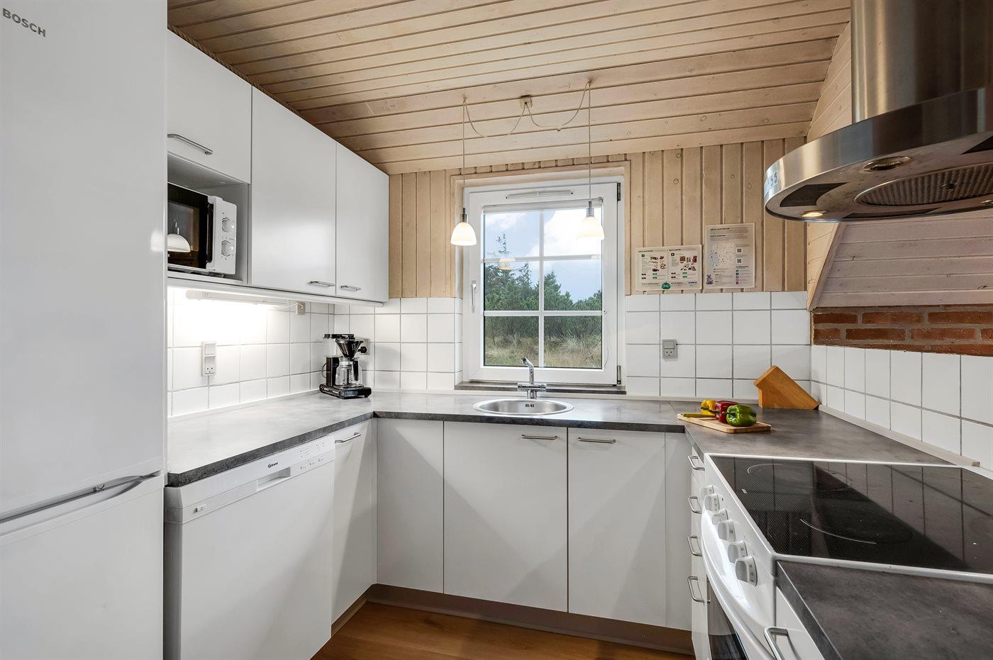Køkkenet er udstyret med 1 køleskab. Der er 4 keramiske kogeplader, varmluftovn, mikrobølgeovn samt opvaskemaskine.