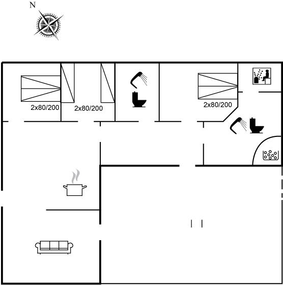 Der er i alt 3 soveværelser. Sovepladserne fordeler sig på: 4 sovepladser i dobbeltsenge. 2 sovepladser i enkeltsenge. Derudover er der 1 stk. barneseng.