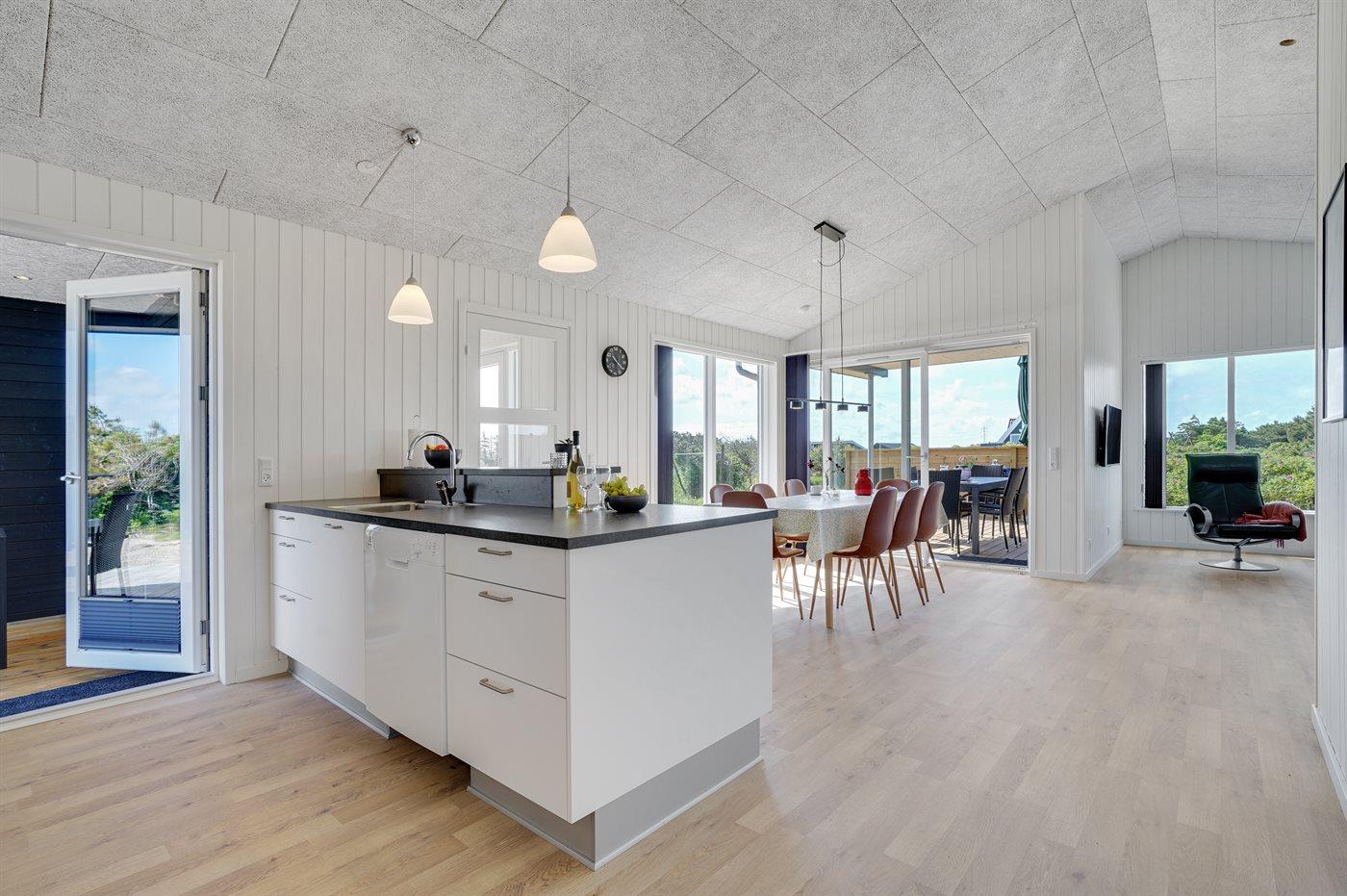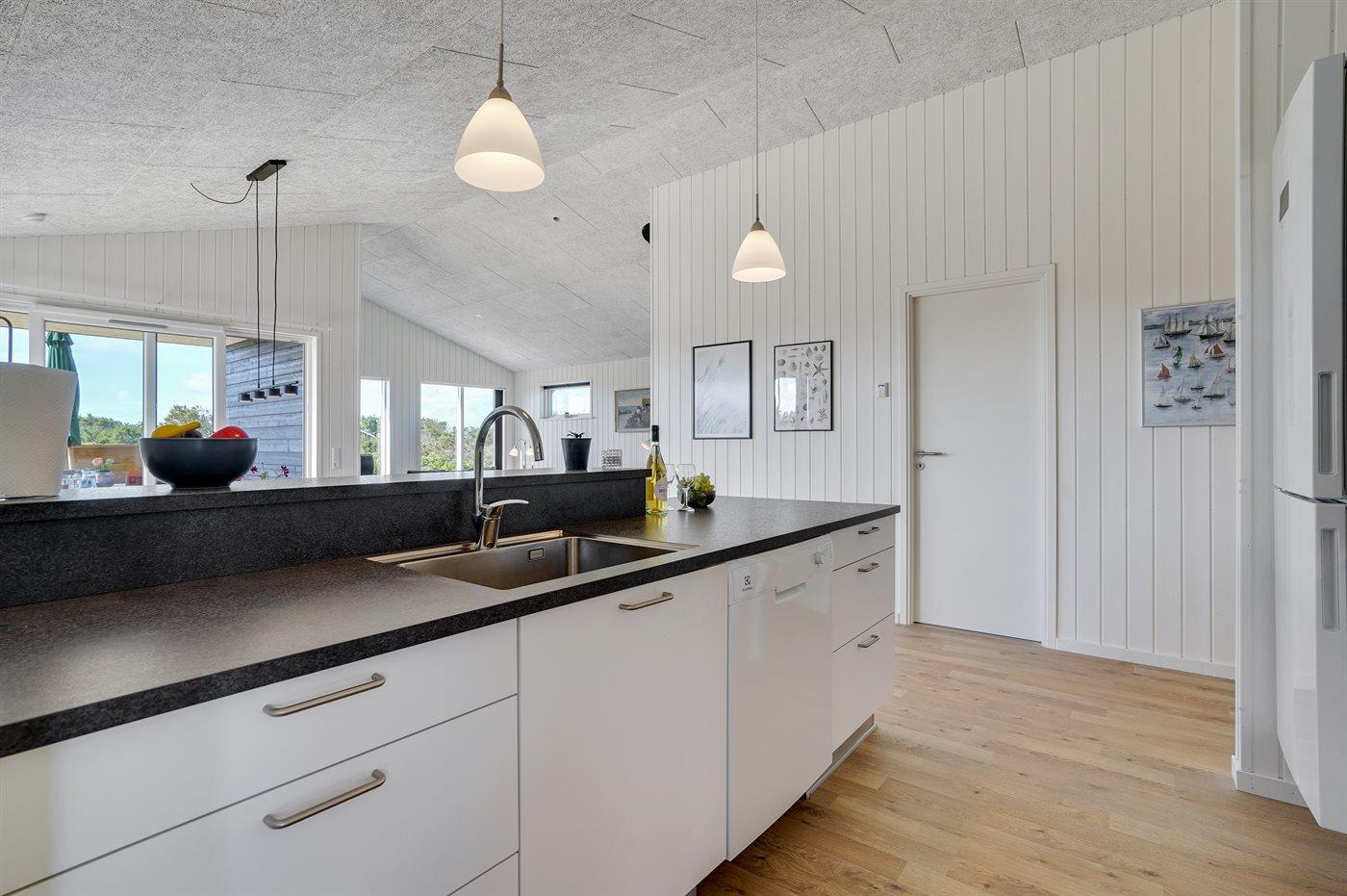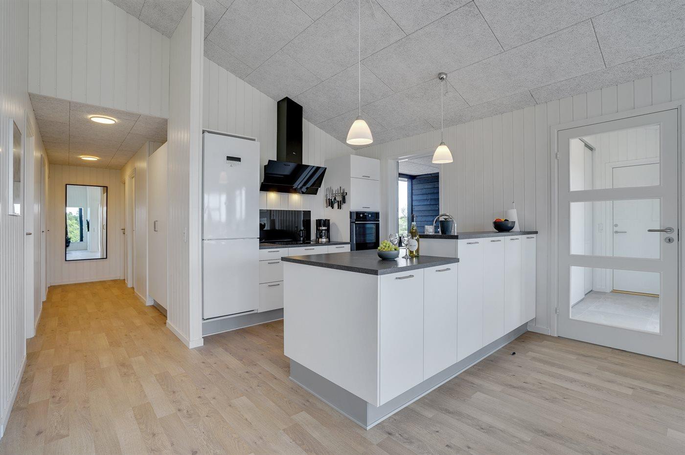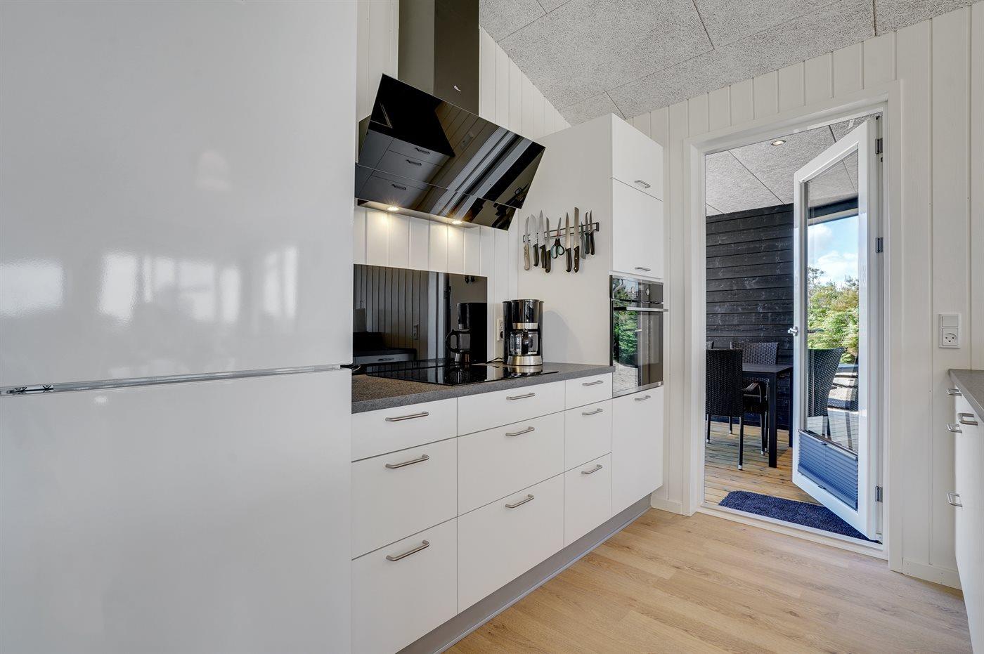 Køkkenet er udstyret med 1 køleskab. Der er 4 induktionskogeplader, varmluftovn, mikrobølgeovn samt opvaskemaskine.