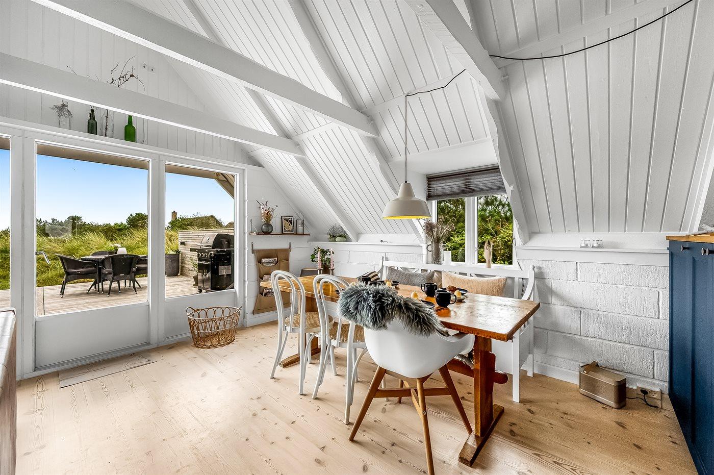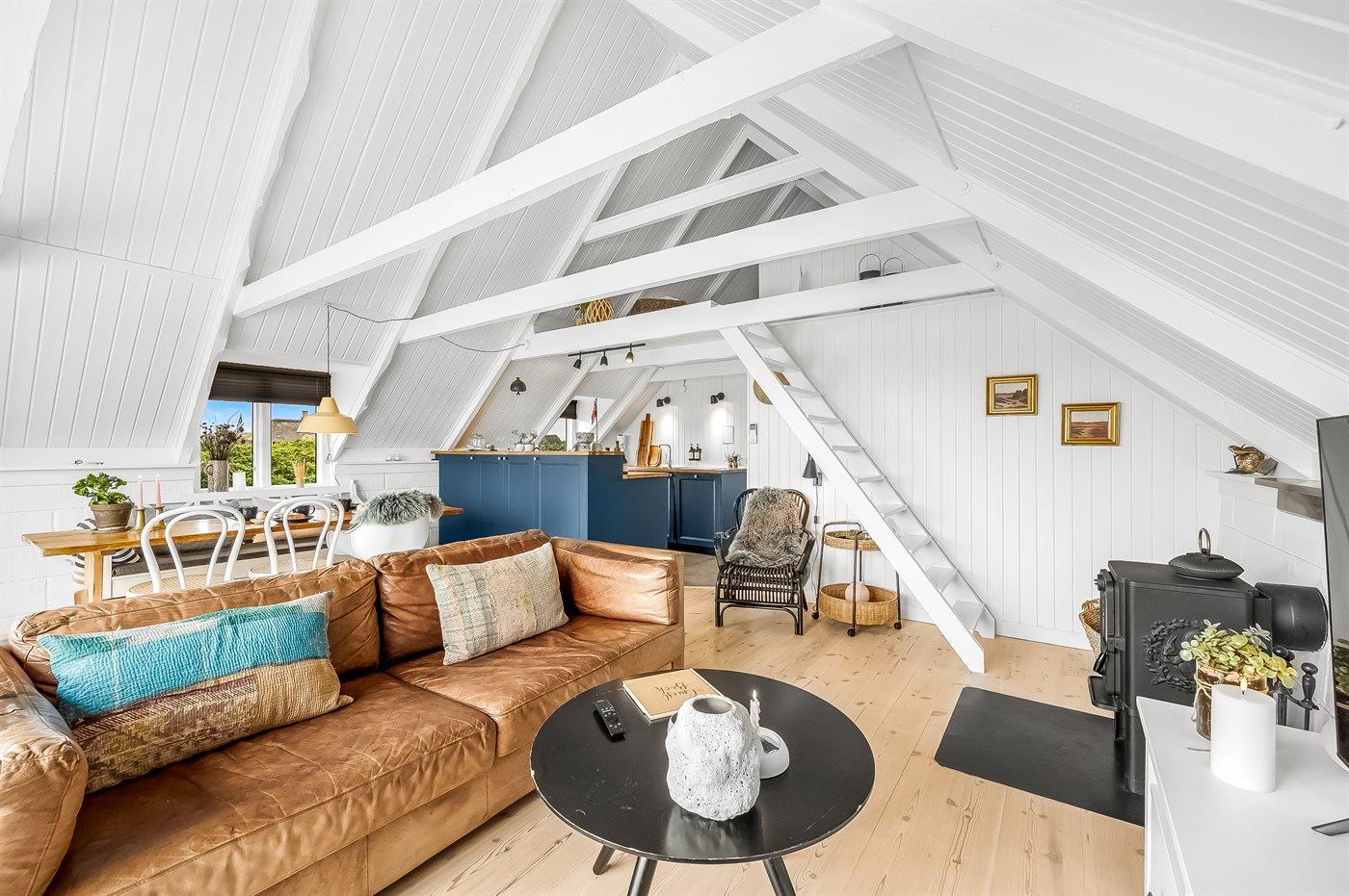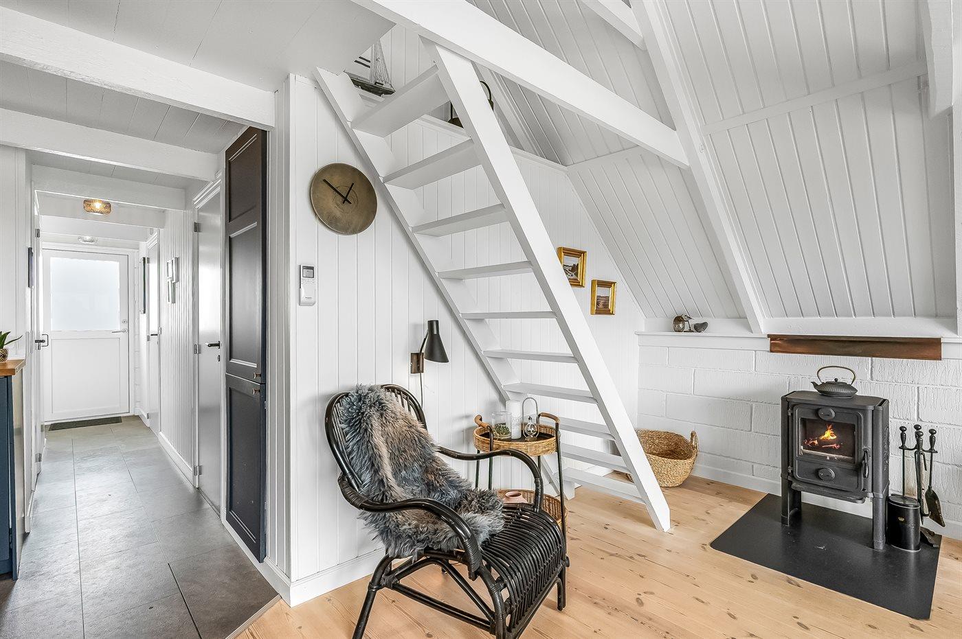 Totalrenoveret sommerhus med velafstemt indretning og brændeovn på stor åben grund i naturskønt sommerhusområde imellem hav og fjord