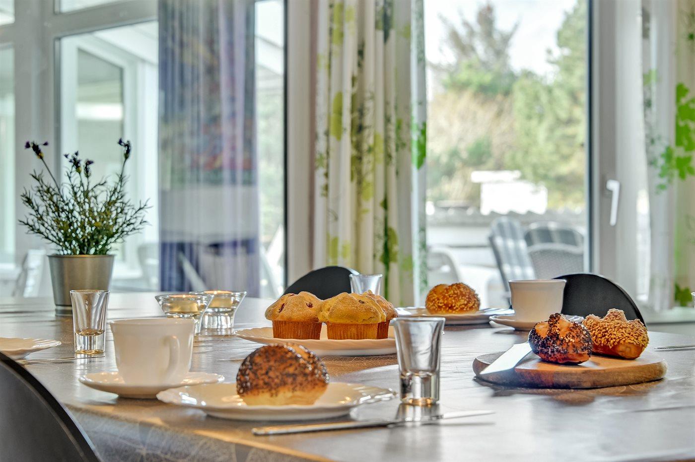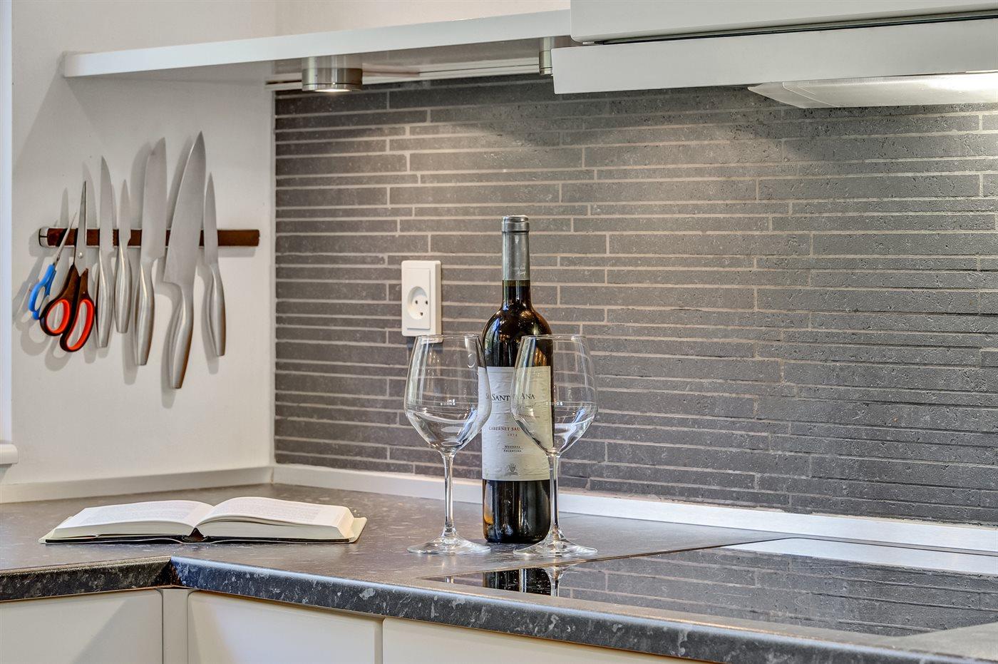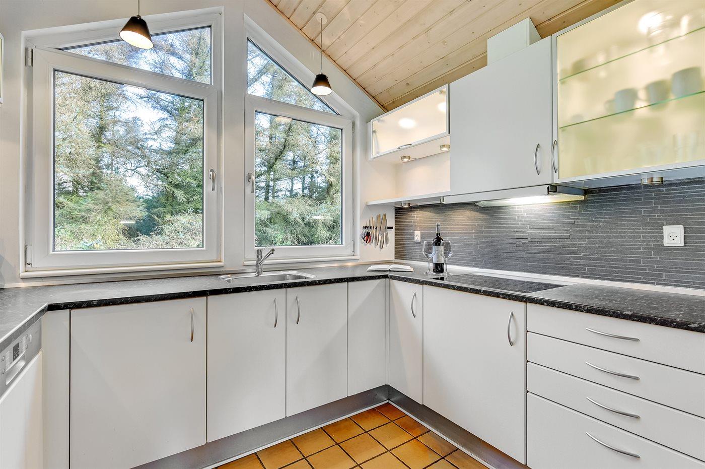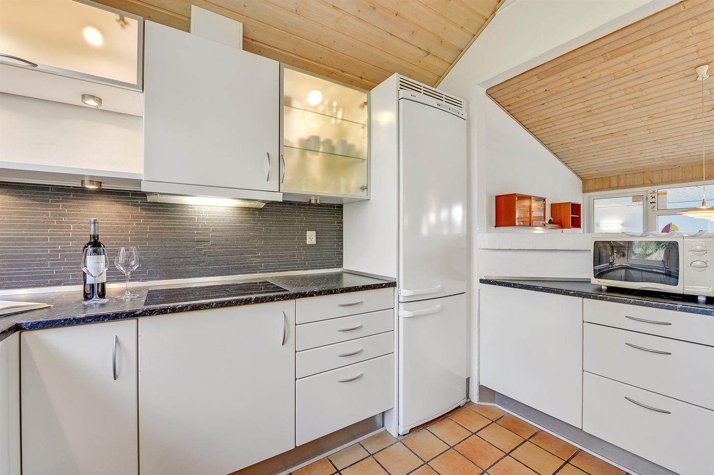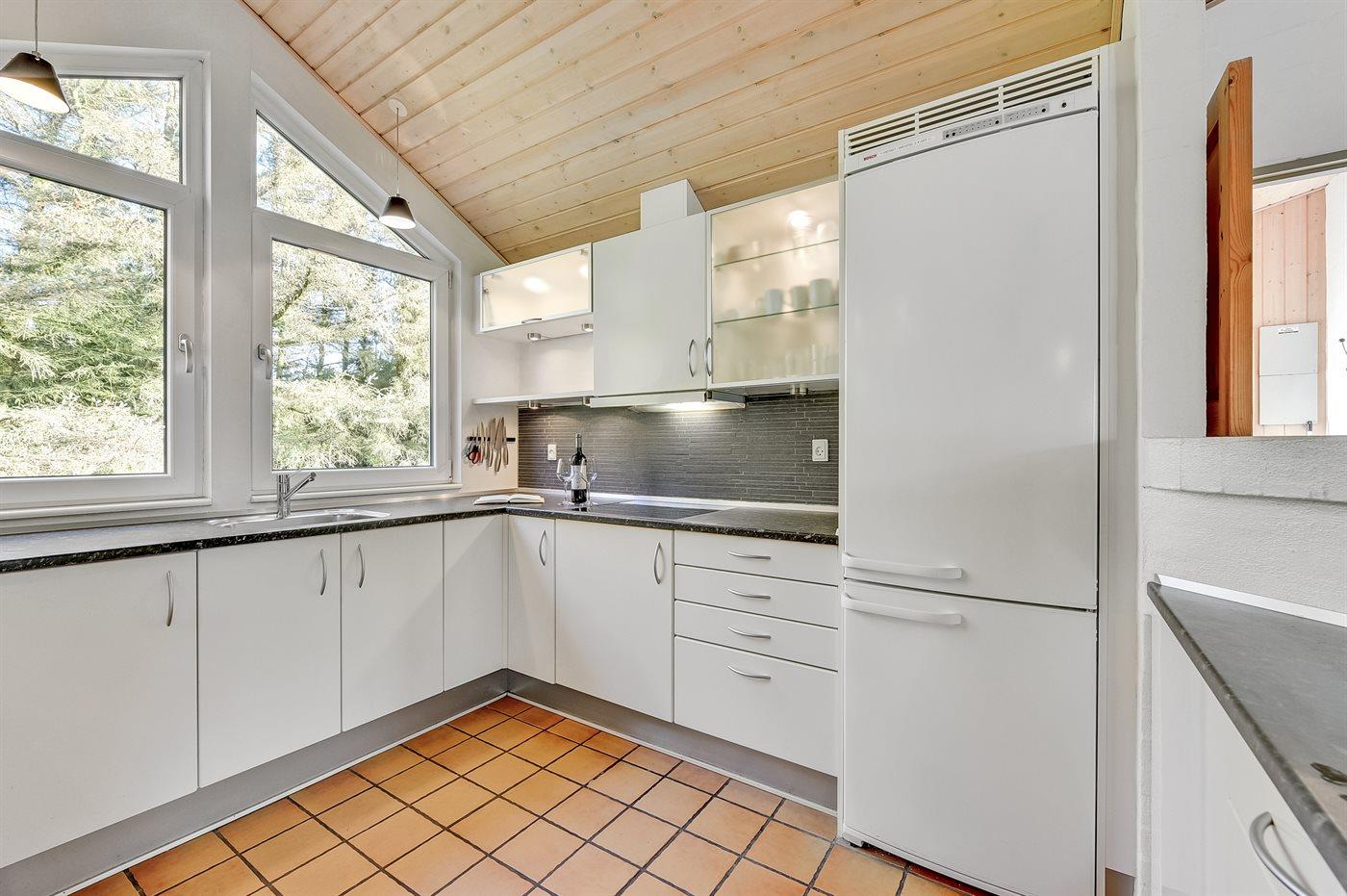 Køkkenet er udstyret med 1 køleskab. Der er 4 keramiske kogeplader, varmluftovn, mikrobølgeovn samt opvaskemaskine.