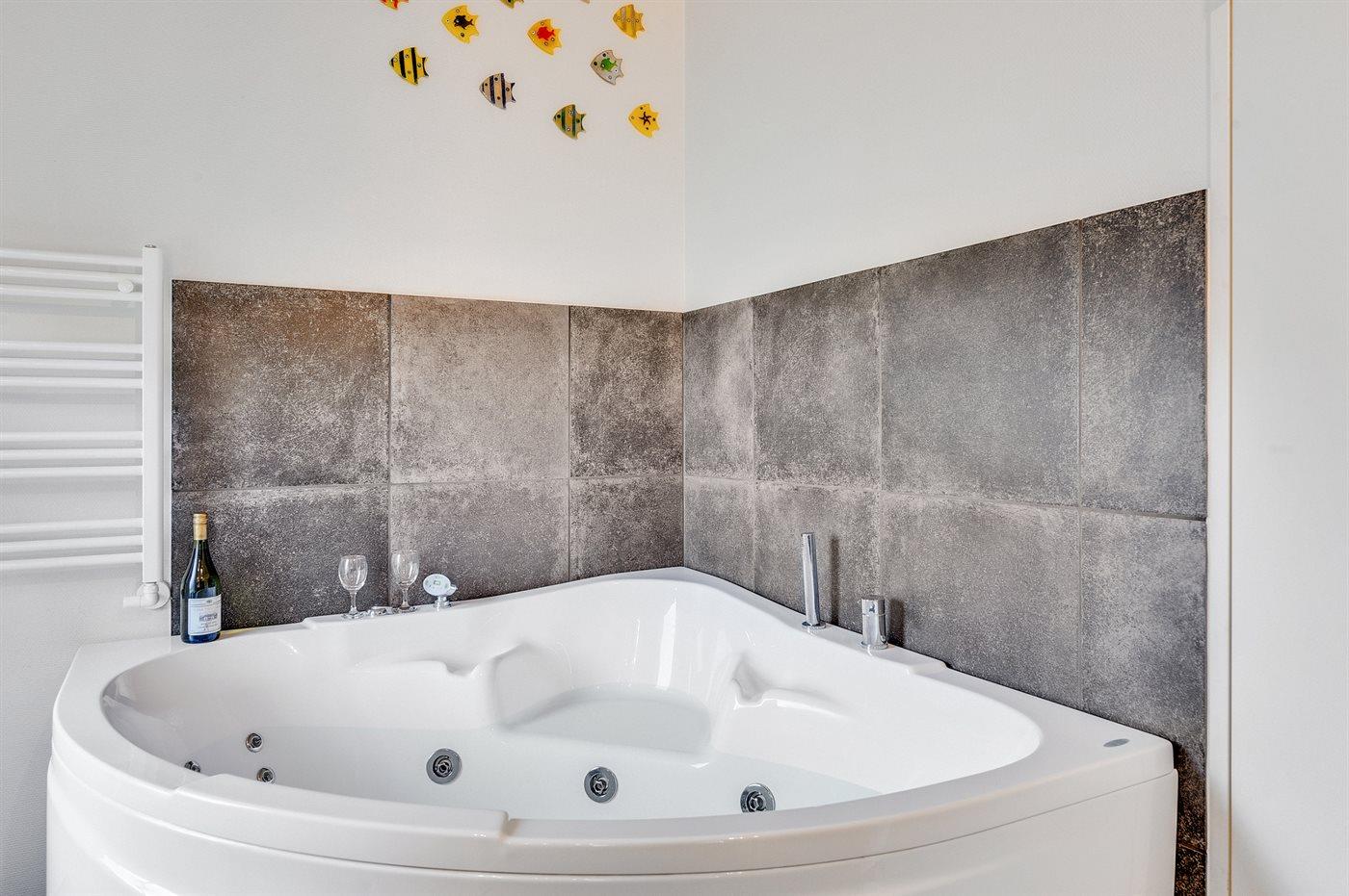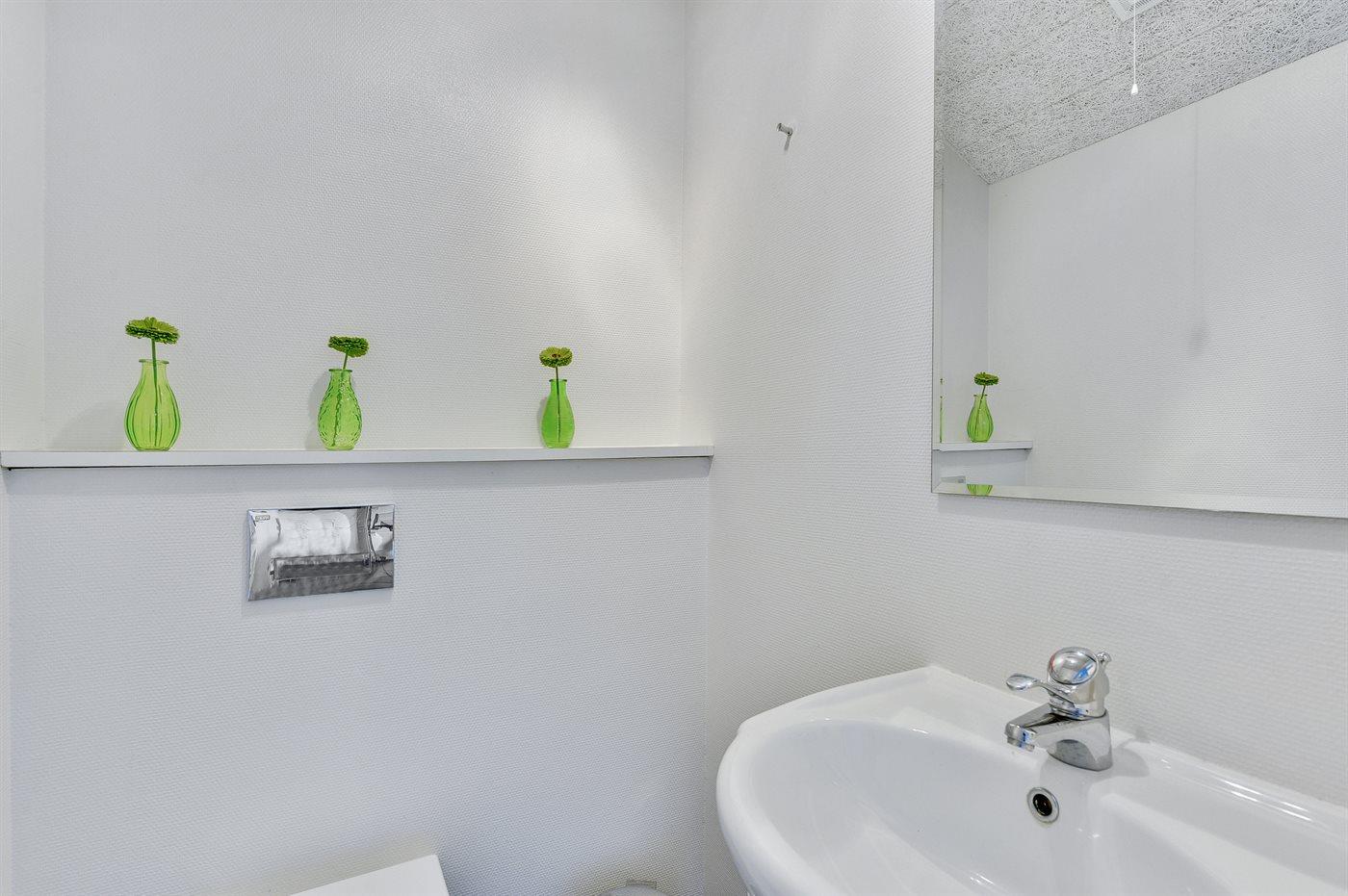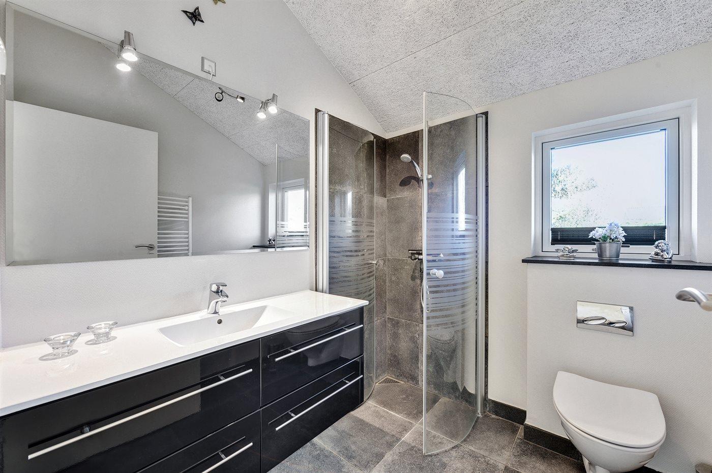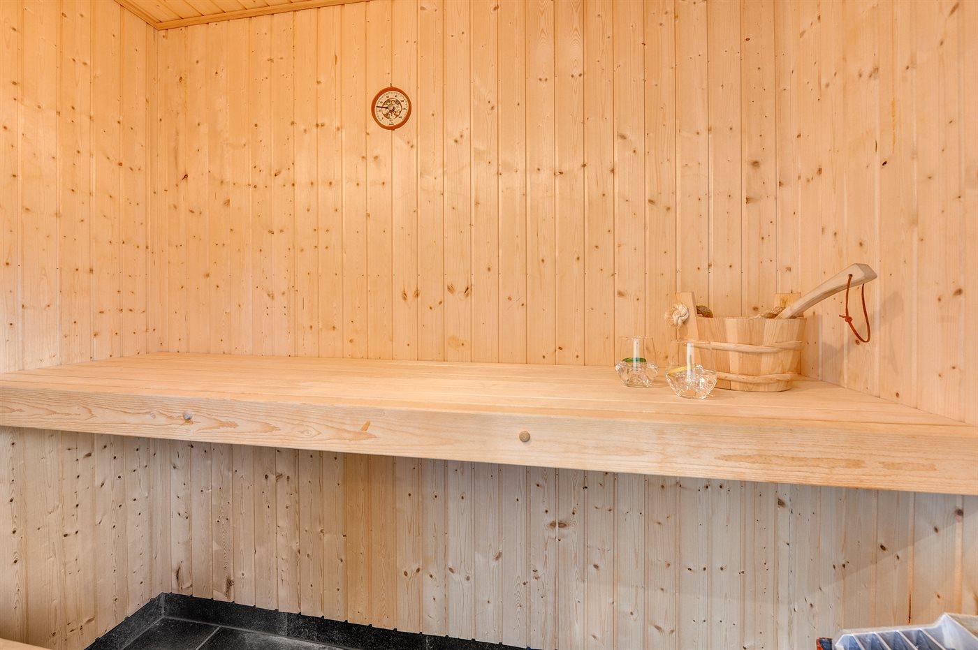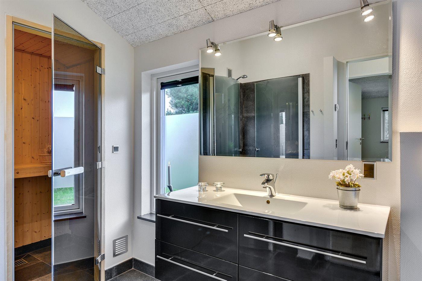 Huset har 2 badeværelser med bruseniche og gulvvarme, hvoraf det ene har adgang til sauna og 2 personers spa. Gæstetoilet findes ved aktivitetsrummet.