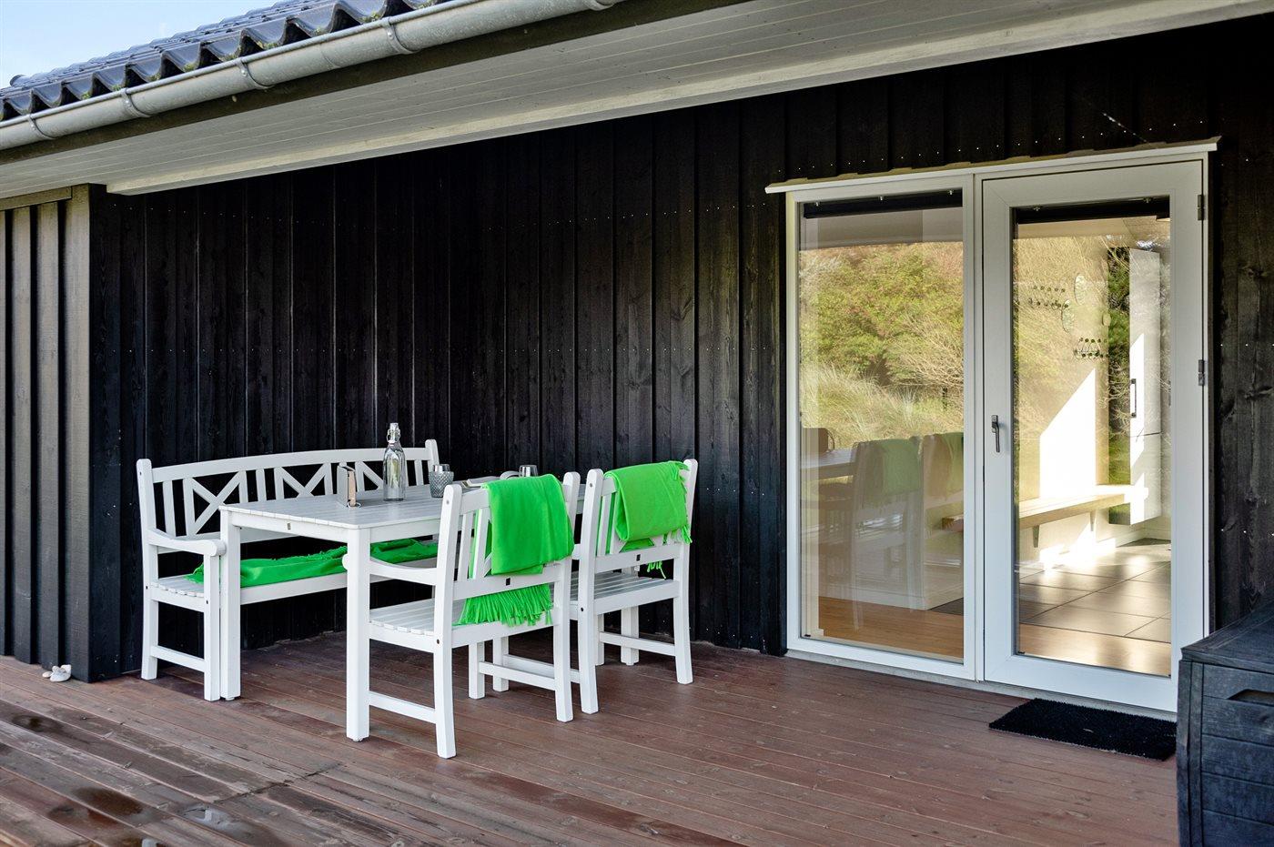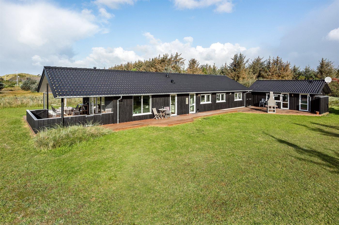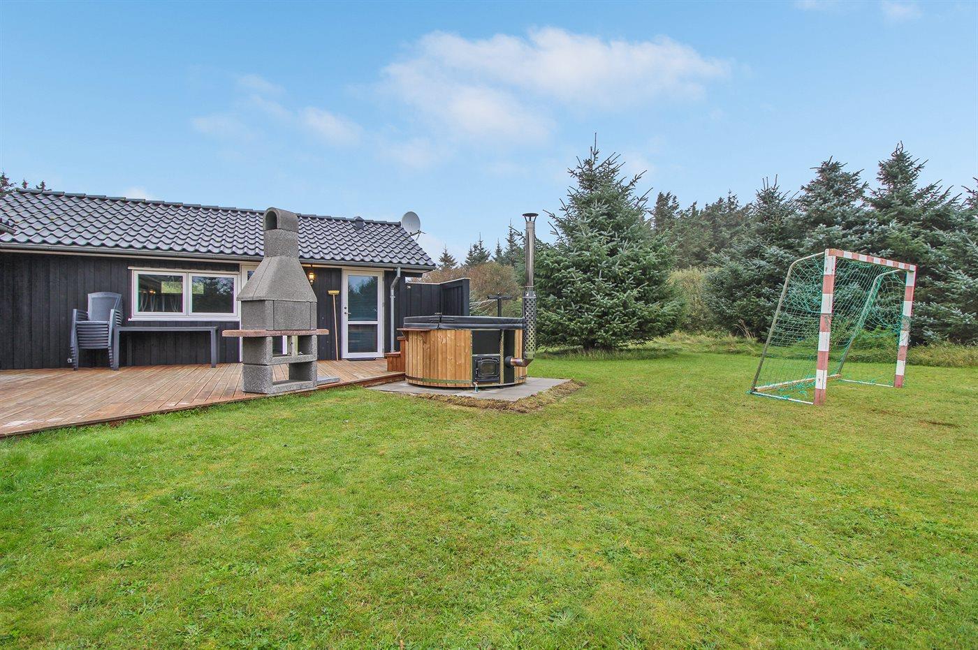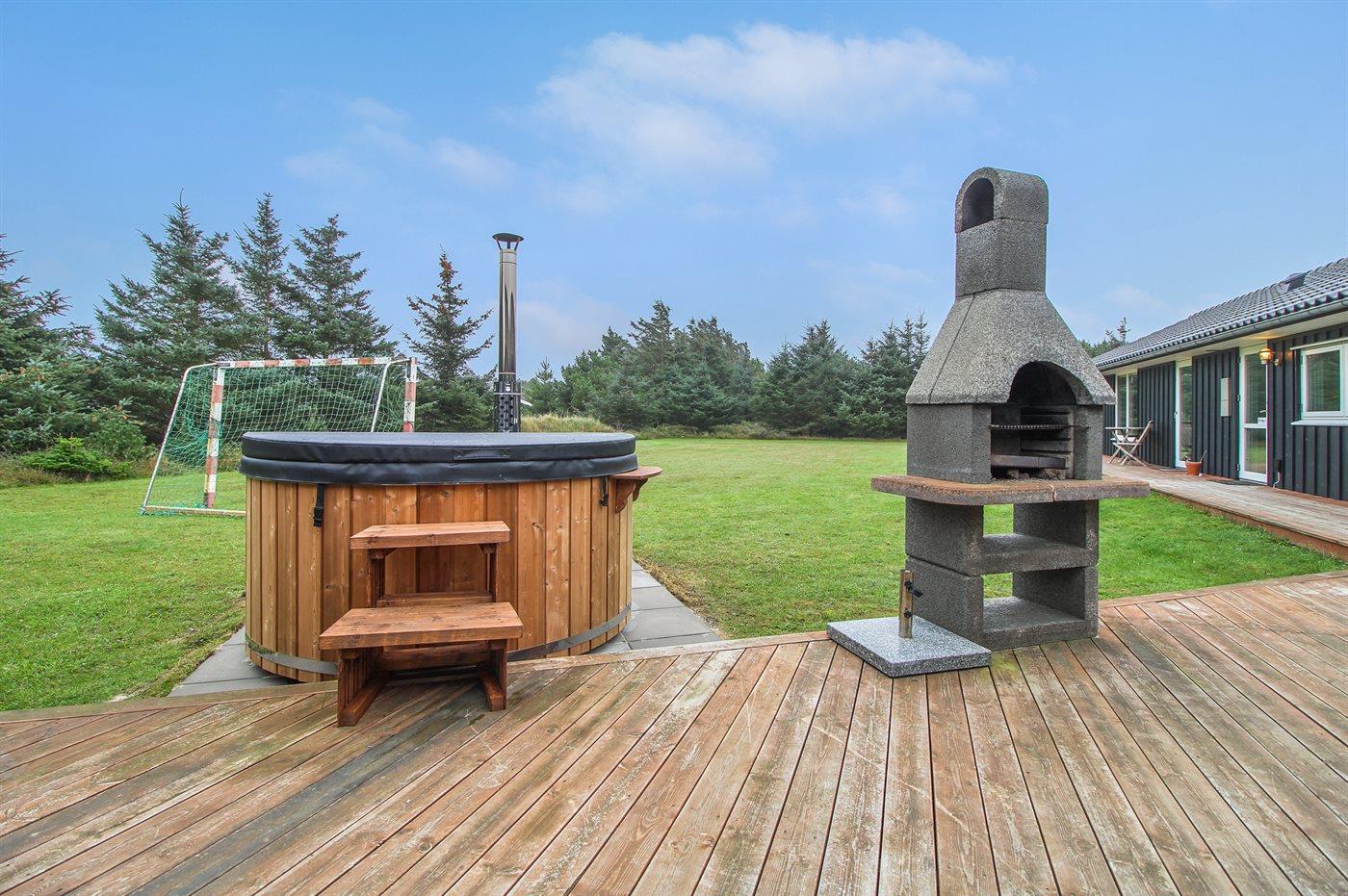 Huset ligger på en stor natur/klitgrund, som er afskærmet af sandvolde og hegn mod syd. Der kan altid findes læ på de i alt 130 m2 terrasser, hvoraf 40 m2 er overdækket, og heraf er de 28 m2 indhegnet. Et vildmarksbad til 6 personer samt havemøbler står til rådighed sammen med udendørs bruser og pejs til hygge på terrassen. Desuden afskærmet udekøkken som gør huset ideelt for lystfiskere. Weber gasgrill kan benyttes. Der er installeret lader til opladning af elbil (type 2).