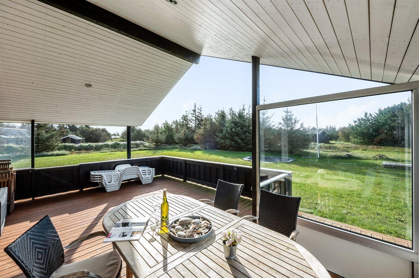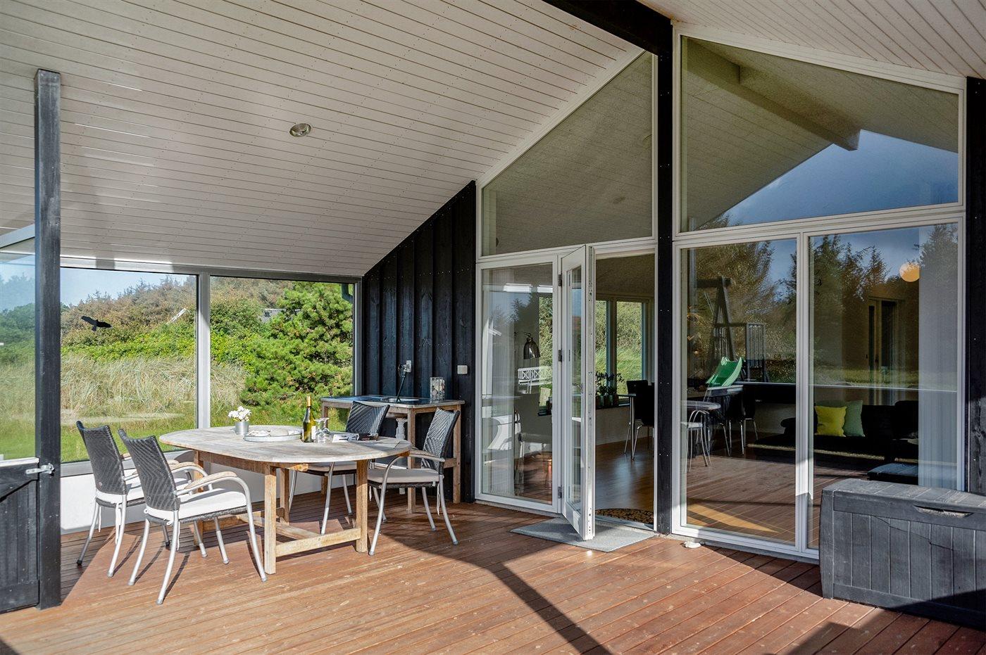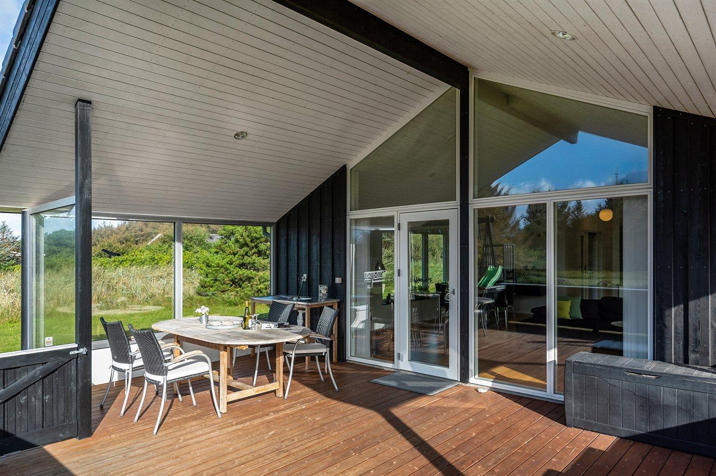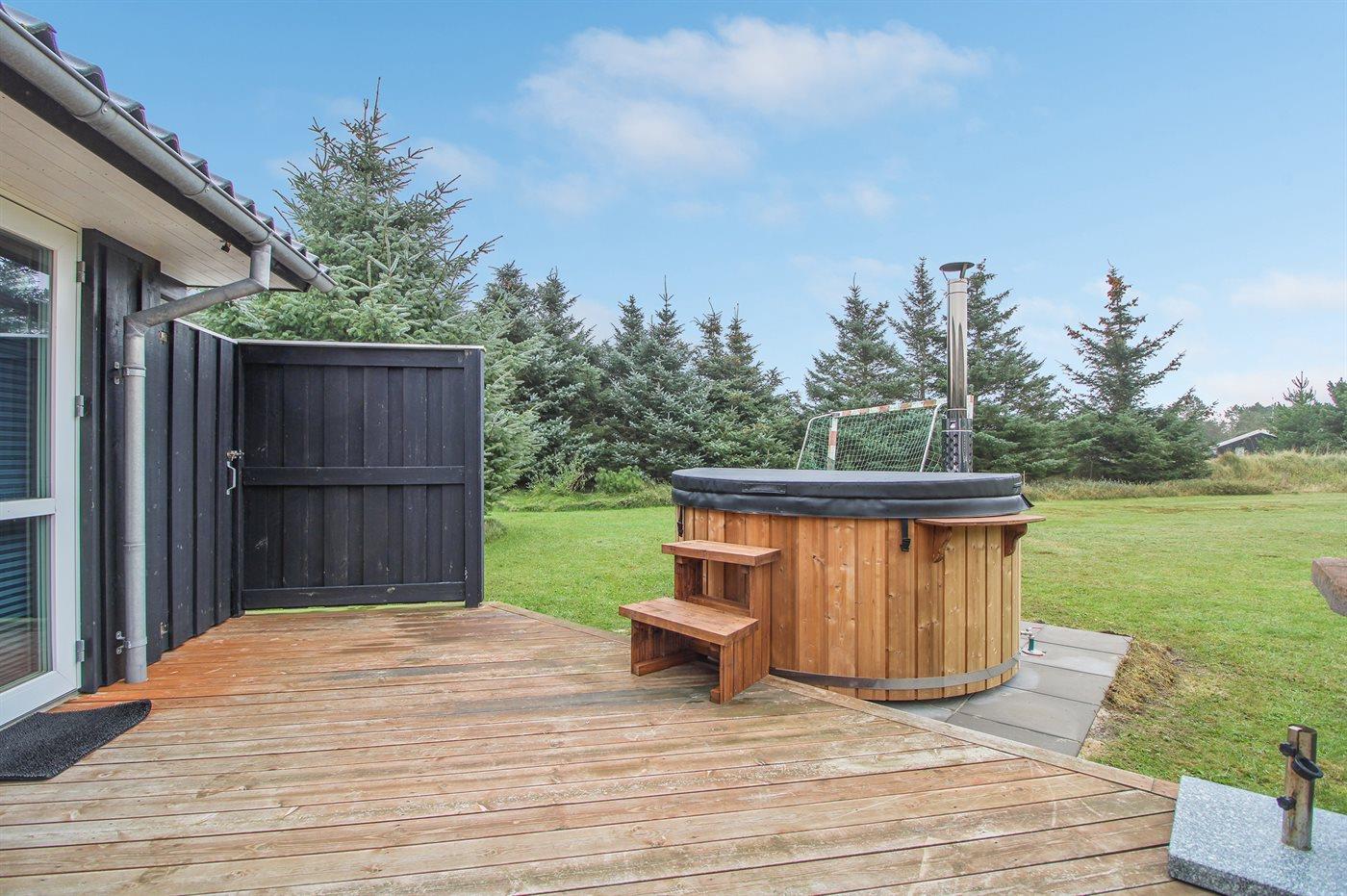 Huset ligger på en stor natur/klitgrund, som er afskærmet af sandvolde og hegn mod syd. Der kan altid findes læ på de i alt 130 m2 terrasser, hvoraf 40 m2 er overdækket, og heraf er de 28 m2 indhegnet. Et vildmarksbad til 6 personer samt havemøbler står til rådighed sammen med udendørs bruser og pejs til hygge på terrassen. Desuden afskærmet udekøkken som gør huset ideelt for lystfiskere. Weber gasgrill kan benyttes. Der er installeret lader til opladning af elbil (type 2).