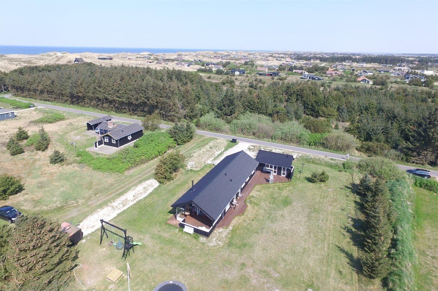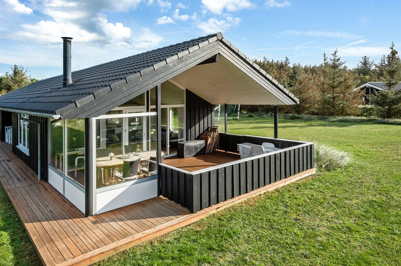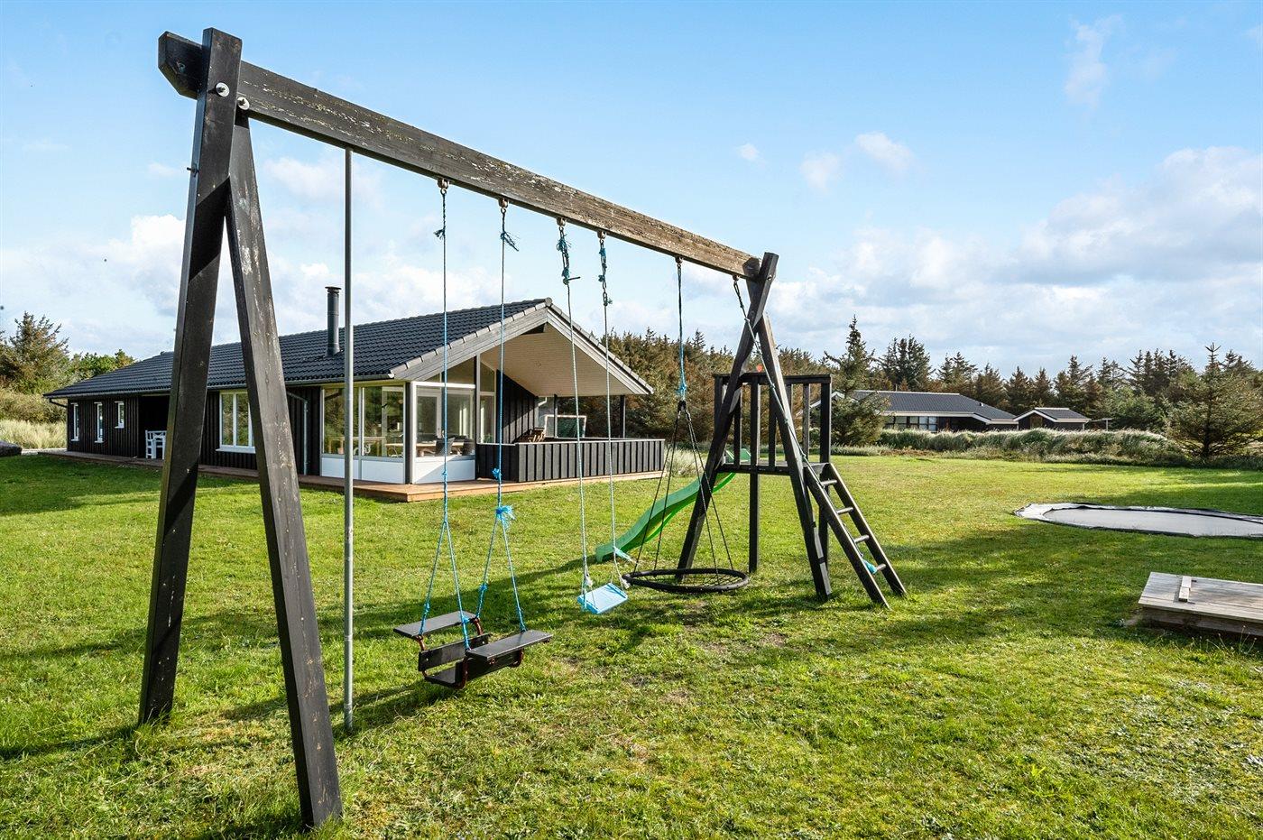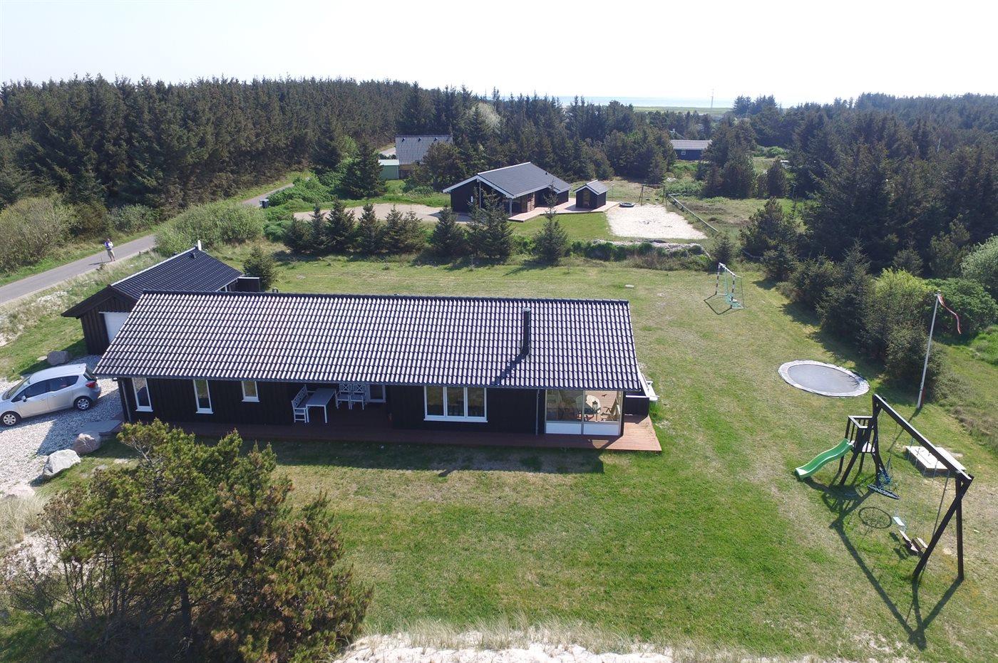 Huset ligger på en stor natur/klitgrund, som er afskærmet af sandvolde og hegn mod syd. Der kan altid findes læ på de i alt 130 m2 terrasser, hvoraf 40 m2 er overdækket, og heraf er de 28 m2 indhegnet. Et vildmarksbad til 6 personer samt havemøbler står til rådighed sammen med udendørs bruser og pejs til hygge på terrassen. Desuden afskærmet udekøkken som gør huset ideelt for lystfiskere. Weber gasgrill kan benyttes. Der er installeret lader til opladning af elbil (type 2).
