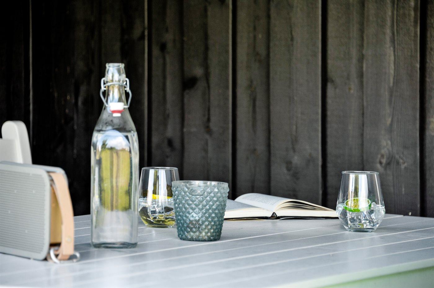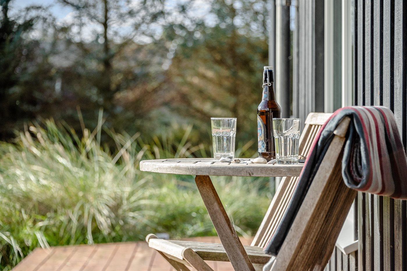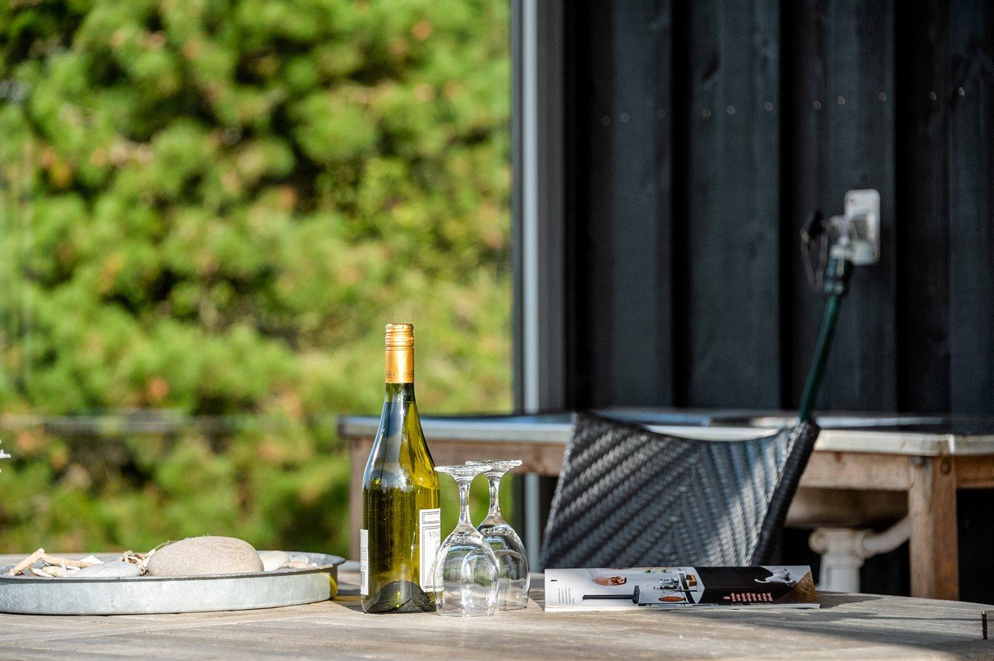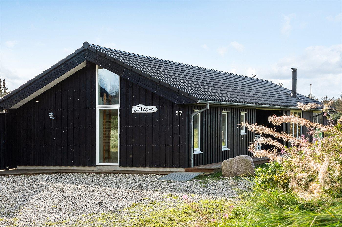 Huset ligger på en stor natur/klitgrund, som er afskærmet af sandvolde og hegn mod syd. Der kan altid findes læ på de i alt 130 m2 terrasser, hvoraf 40 m2 er overdækket, og heraf er de 28 m2 indhegnet. Et vildmarksbad til 6 personer samt havemøbler står til rådighed sammen med udendørs bruser og pejs til hygge på terrassen. Desuden afskærmet udekøkken som gør huset ideelt for lystfiskere. Weber gasgrill kan benyttes. Der er installeret lader til opladning af elbil (type 2).