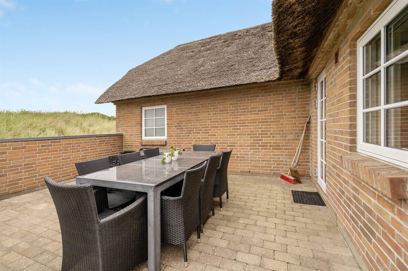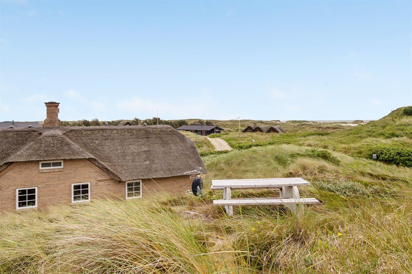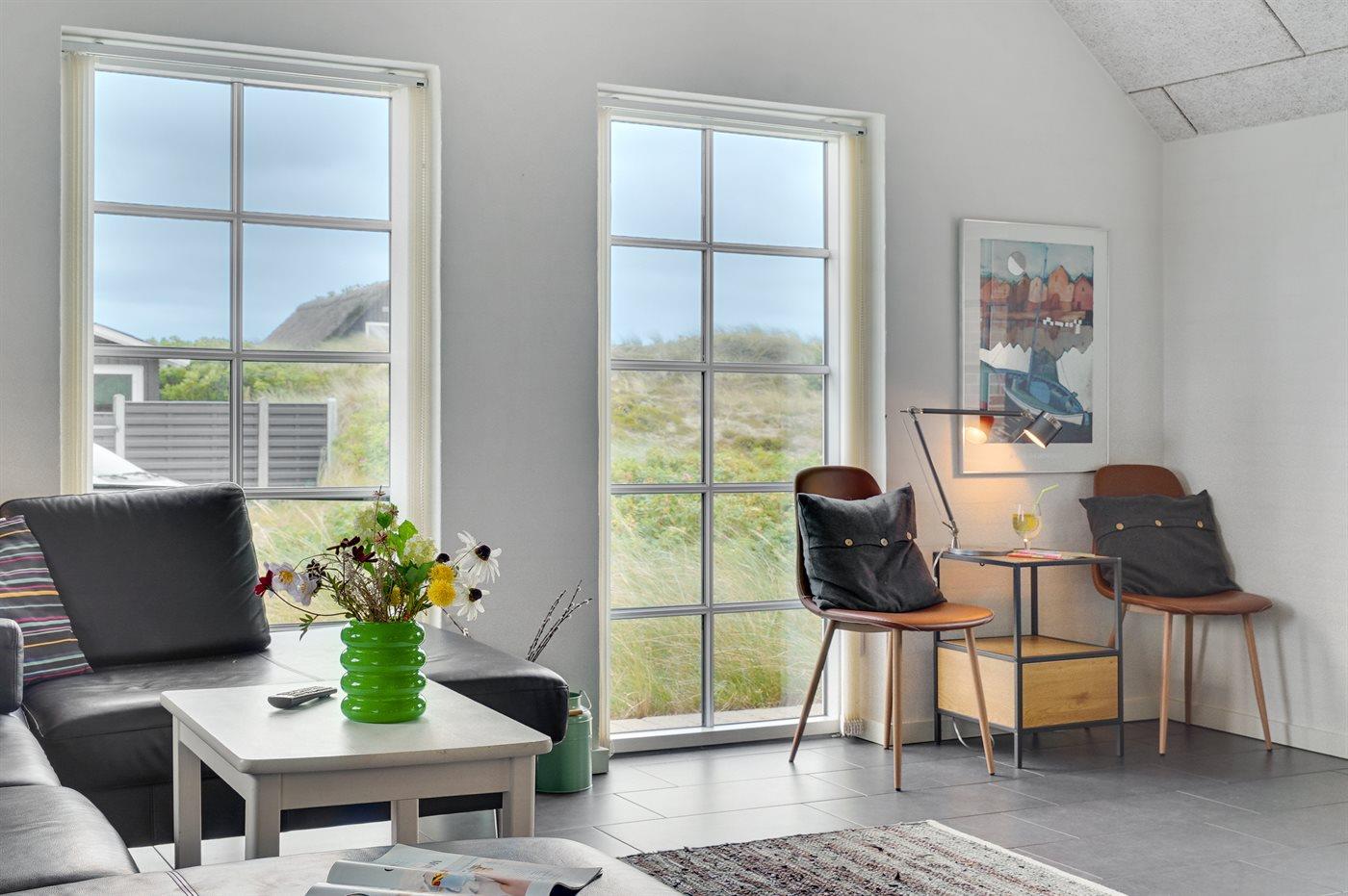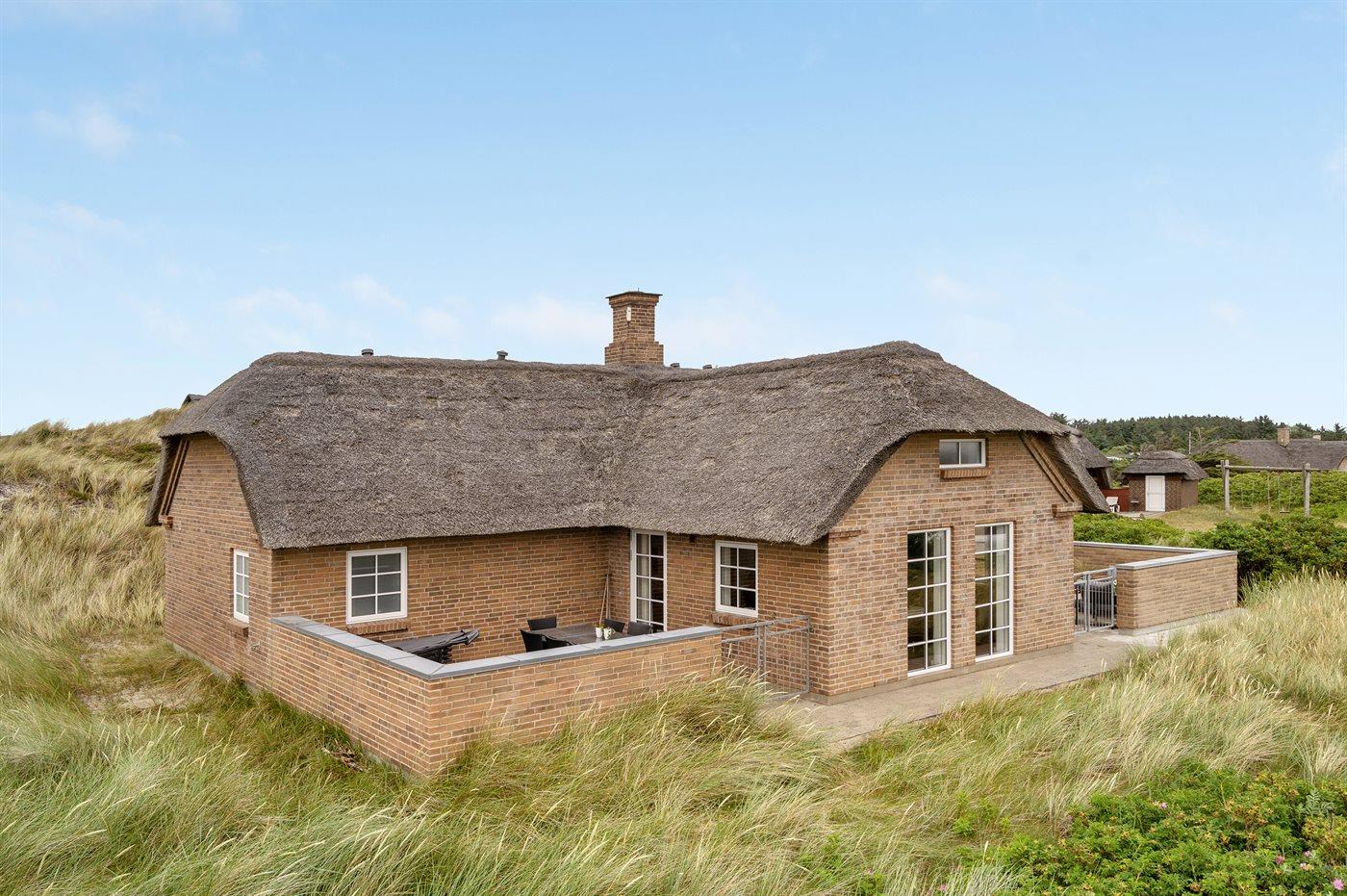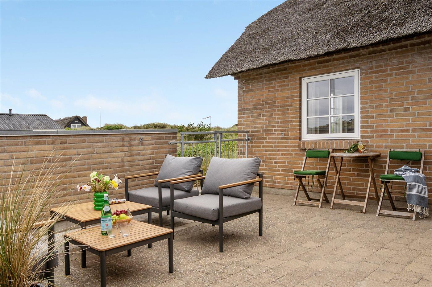 Kun 250 meter fra Vesterhavet, ligger dette lyse og lækkert indrettede sommerhus på en stille og rolig blind vej. Huset er opført i de bedste materialer og ligger på en skøn grund, hvorfra et stisystem fører ned til stranden. Til huset hører sydøst- og sydvestvendte terrasser med havemøbler – her kan i sidde og læse en god bog eller nyde en grillaften sammen med familien eller gode venner. Fra en lille bænk på grunden kan I desuden nyde udsigten over havet.