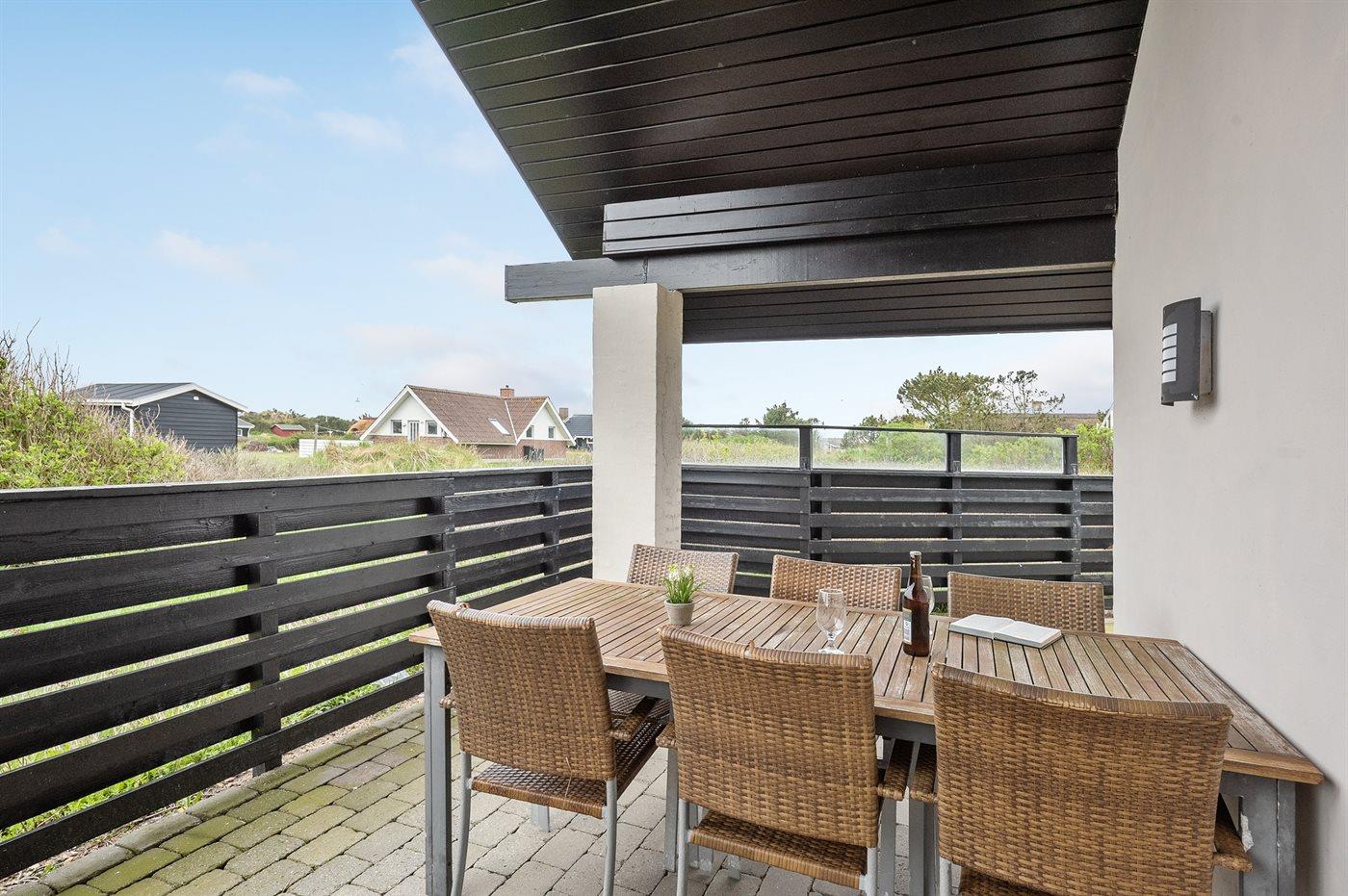 Ferieboligen er beliggende på en 1207 m² stor naturgrund. Der er 850 m til havet. Der er 500 m til fjorden. Nærmeste forretning er beliggende i en afstand af 4000 m. Der er en golfbane i en afstand af 8000 m. Til ferieboligen hører 50 m² terrasseareal. Desuden er der 20 m² overdækket terrasse. Heraf i alt 70 m² lukket terrasse. Der er redskabsrum. Parkering ved ferieboligen.