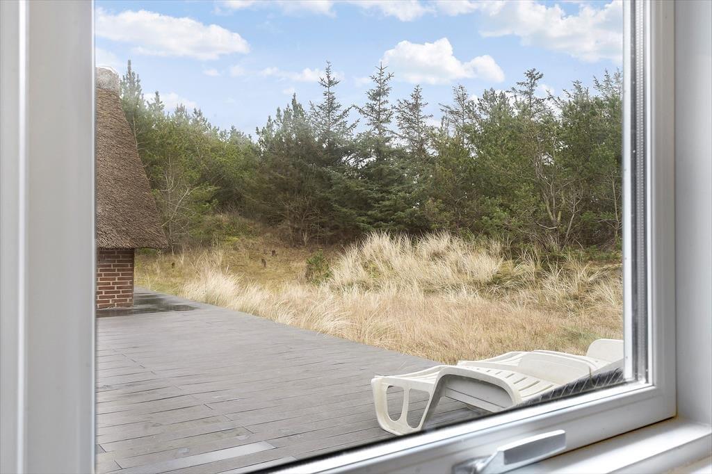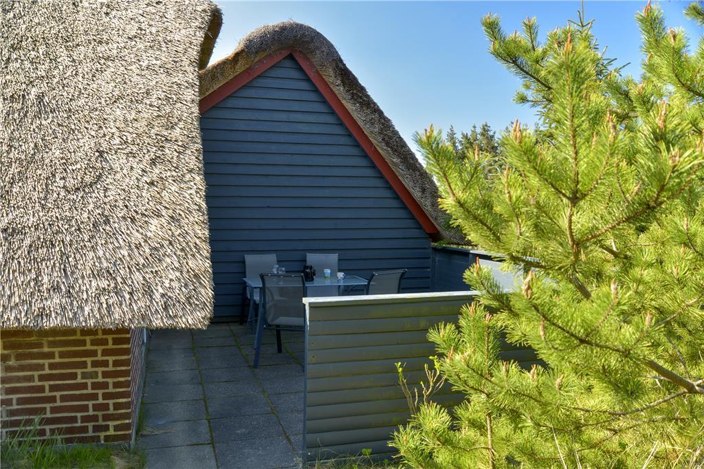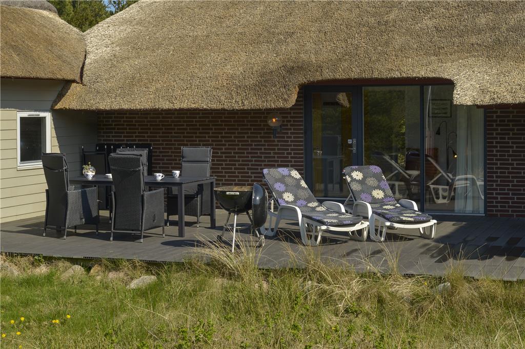 Det store, sydvendte terrassemiljø er stedet, hvor I kan hygge jer og slappe af i solen. Terrassen afskærmes af huset og tilbygningen til tre sider, mens en plantage mod syd også giver læ for brisen og forhindrer indkig, så I kan nyde fridagene komplet ugeneret. Her er god plads til at slappe af i liggestolene eller hygge omkring terrassebordet med lækker mad fra grillen. Familiens yngste kan lege og bygge huler på den skønne naturgrund, og en vestvendt terrasse giver jer mulighed for at nyde solnedgangen.
