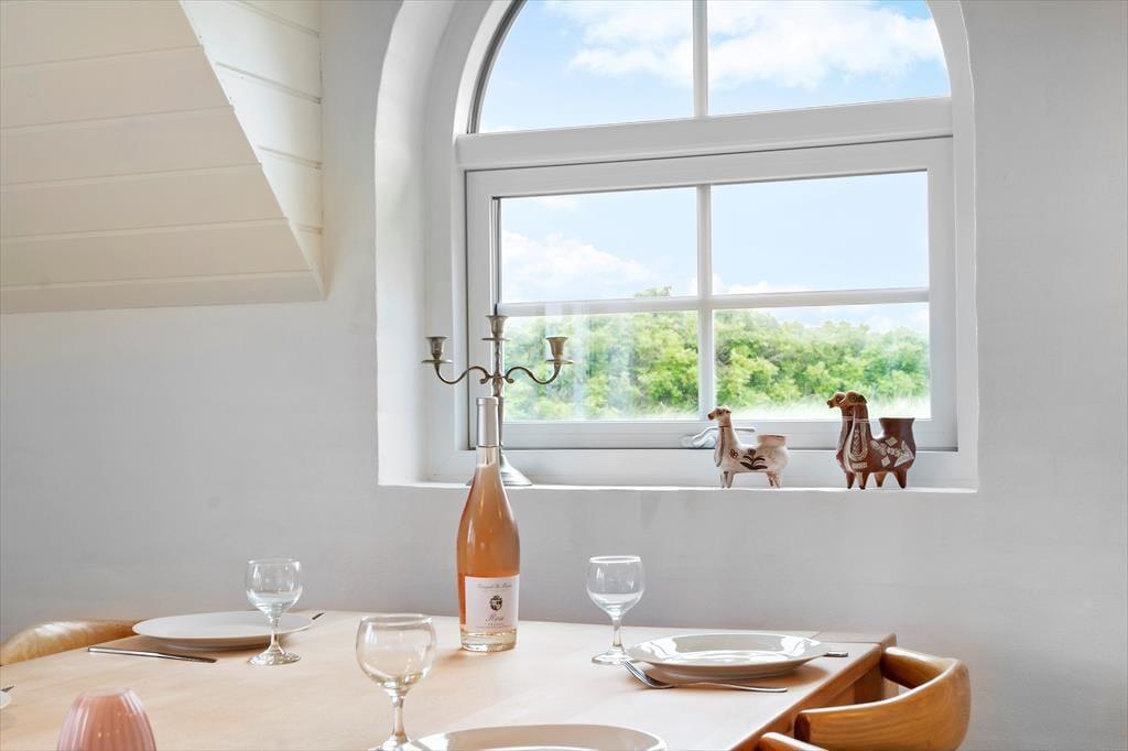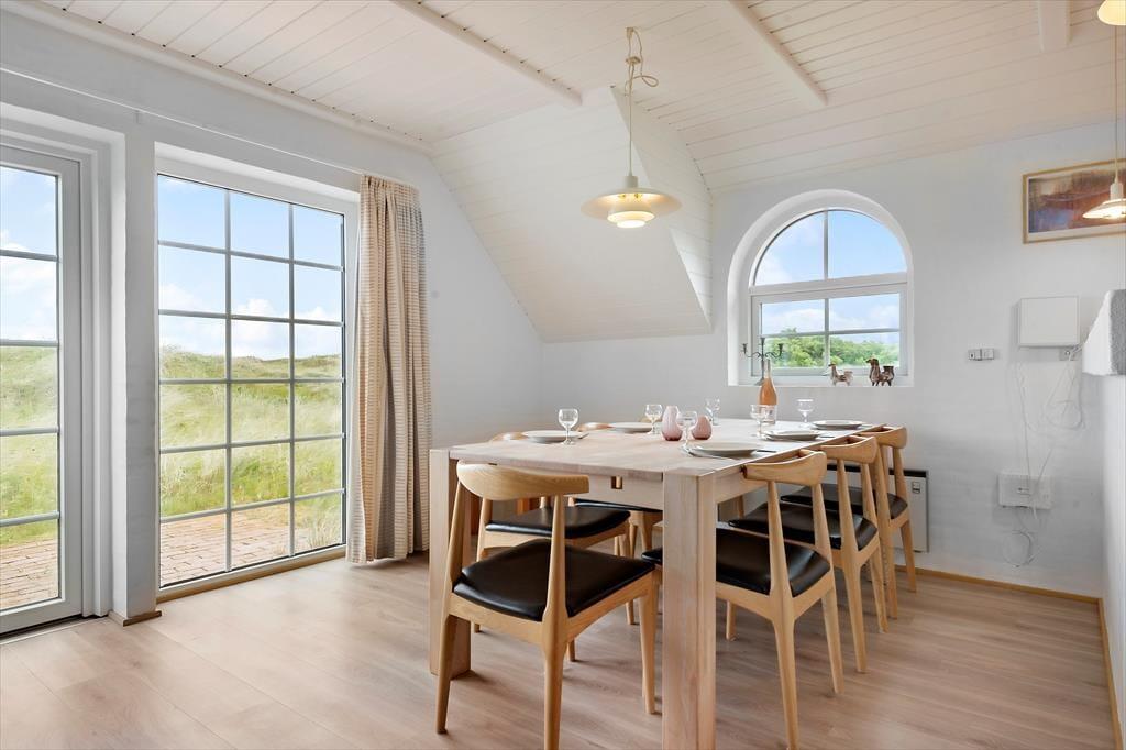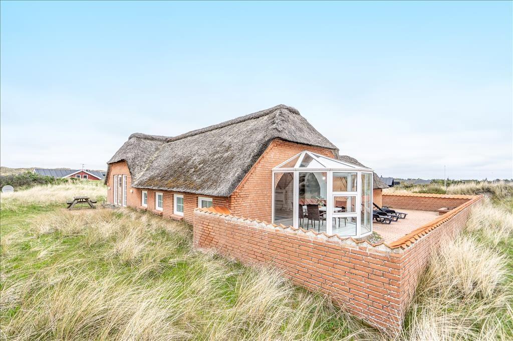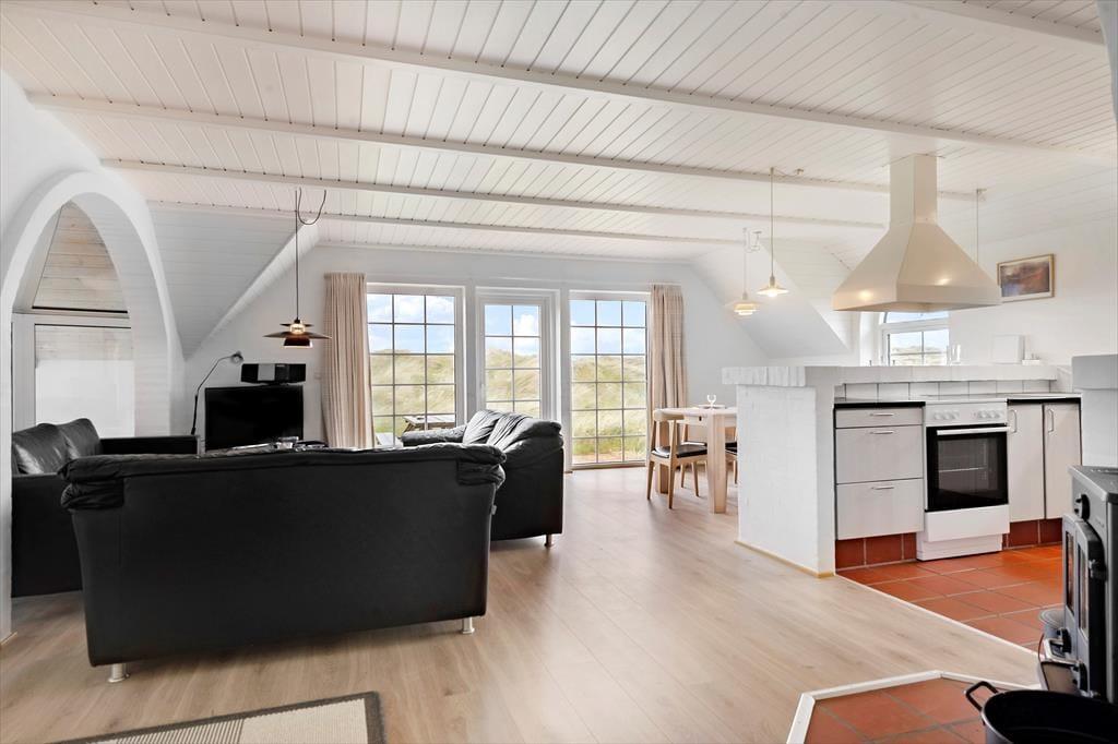 Det ældre sommerhus byder på i alt fem soveværelser, så her er god plads til at være to børnefamilier eller venner på ferie sammen. I værelsesafdelingen findes også et badeværelse med bruseniche og gulvvarme. I opholdsafdelingen glider køkkenet og stuen i ét, og store vinduespartier giver en skøn udsigt til omgivelsernes klitter og skønne natur. I køkken har I god plads til at være sammen om at lave mad, og retterne serveres let ved det store spisebord. Aftenkaffen kan I nyde i sofaarrangementet ved tv’et, og hyggen er i top, når ilden knitrer i brændeovnen. Endelig byder feriehuset på pool afdelingen, hvor I kan nyde den 24 m2 store pool med svømmetræner eller slappe af i spabadet. Ligeledes er her et badeværelse med bruseniche, sauna og vaskesøjle, og i den sydvendte glaskarnap kan I nyde en kølig forfriskning i solen med udsigt til naturen.