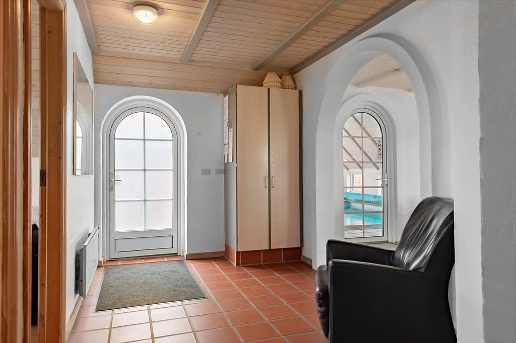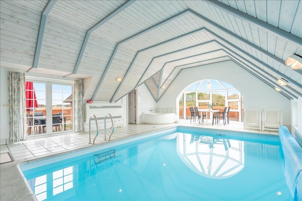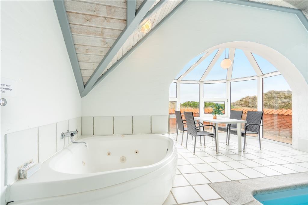 I dette rummelige, stråtækte sommerhus i Klegod kan I tage på badeferie året rundt, for huset byder på indendørs pool, ligesom her med spabad og sauna. Huset ligger i første række ud til fredet natur og den yderste klitrække, så det er også oplagt at bruge feriedagene på stranden ved Vesterhavet.