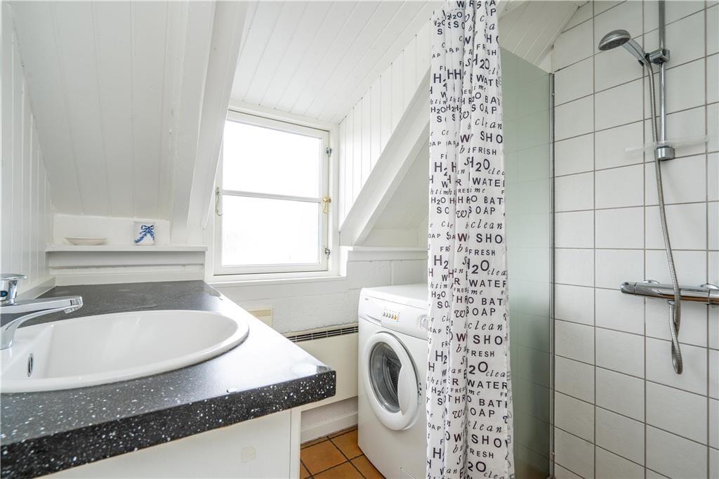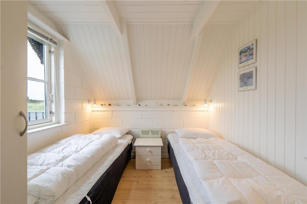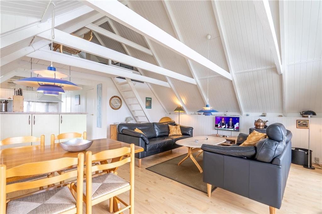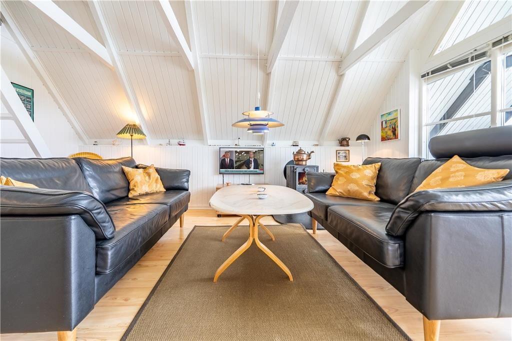 Den stråtækte feriebolig er charmerende indrettet med skråvægge og fritlagte bjælker. Stuen har loft til kip og bades i naturligt lys fra store vinduespartier, som strækker sig fra gulv til loft i hele endevæggen. Både ved spisebordet og i sofaarrangementet med tv kan I nyde en lys og luftig atmosfære, og varmepumpen sørger for en behagelig temperatur, mens hyggen er helt i top, når ilden knitrer i brændeovnen. Køkkenet ligger i åben forbindelse til stuen, og her har I alt det nødvendige udstyr inklusiv opvaskemaskine. Feriehuset byder på sengepladser til seks personer fordelt på en stor hems samt to gode soveværelser, og planløsningen fuldendes af et badeværelse med bruseniche og vaskemaskine samt en sauna.