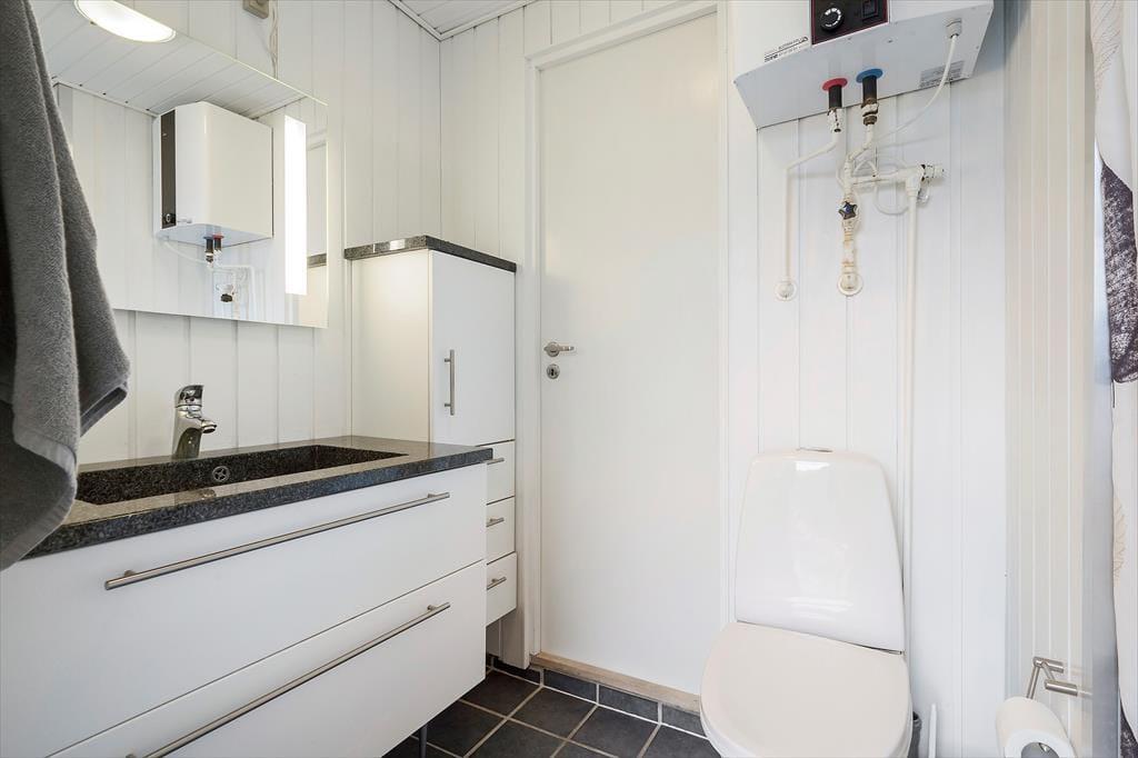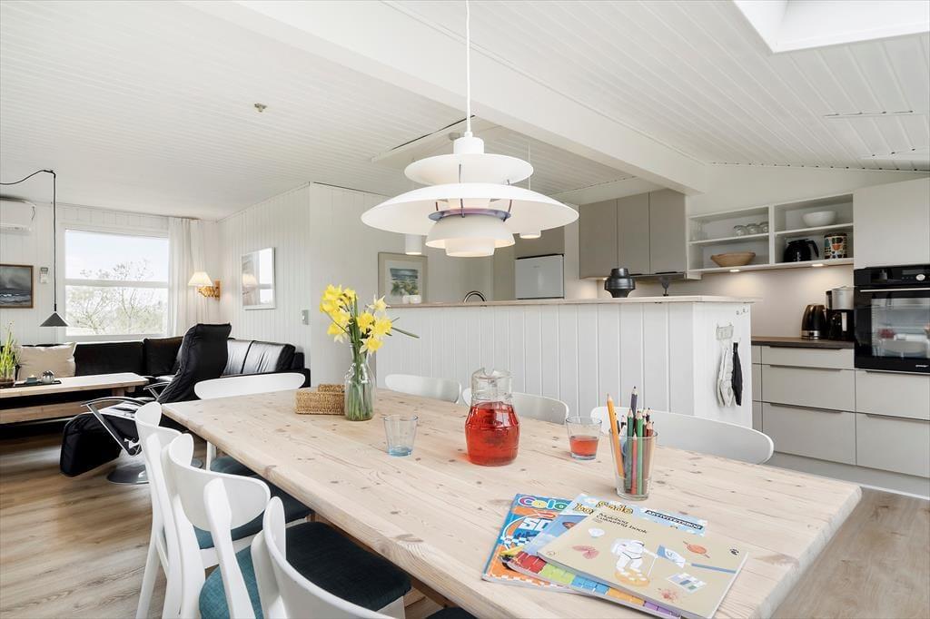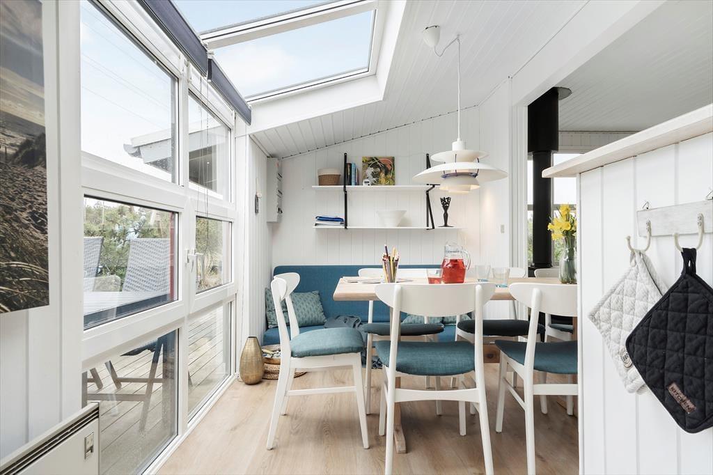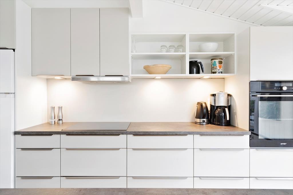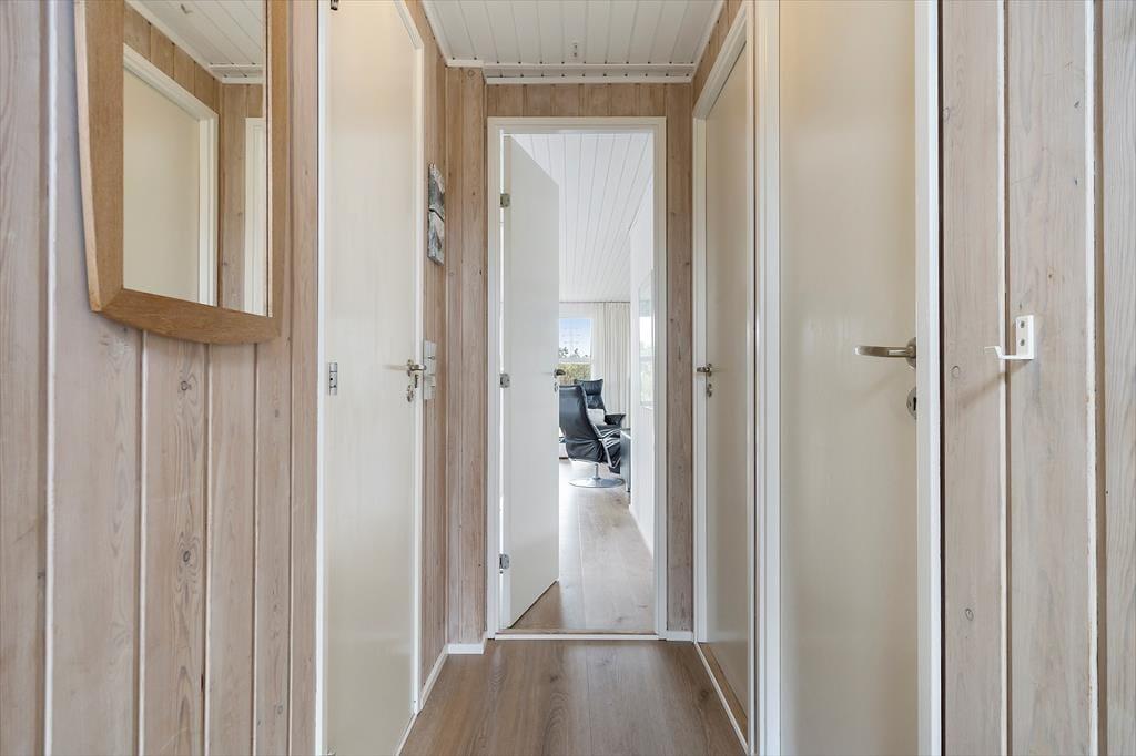 I sommerhuset går en klassisk, hyggelig atmosfære hånd i hånd med en moderne indretning. I det åbne opholdsområde kan I glæde jer over et skønt lysindfald og en luftig atmosfære, og varmepumpen holder en behagelig temperatur, mens brændeovnen giver aftenstunderne ekstra hygge. Køkkenet er indrettet med opvaskemaskine og andet ønskeligt udstyr, og her er god plads til at være sammen om at lave mad. Retterne serveres let ved spisebordet, og stuen byder også på et sofaarrangement med tv med Chromecast, mens her også er en hyggelig læsekrog med en daybed. De tre soveværelser kan rumme seks personer, og derudover er her et lyst badeværelse med bruseniche samt et tilstødende vaskerum med vaskesøjle.