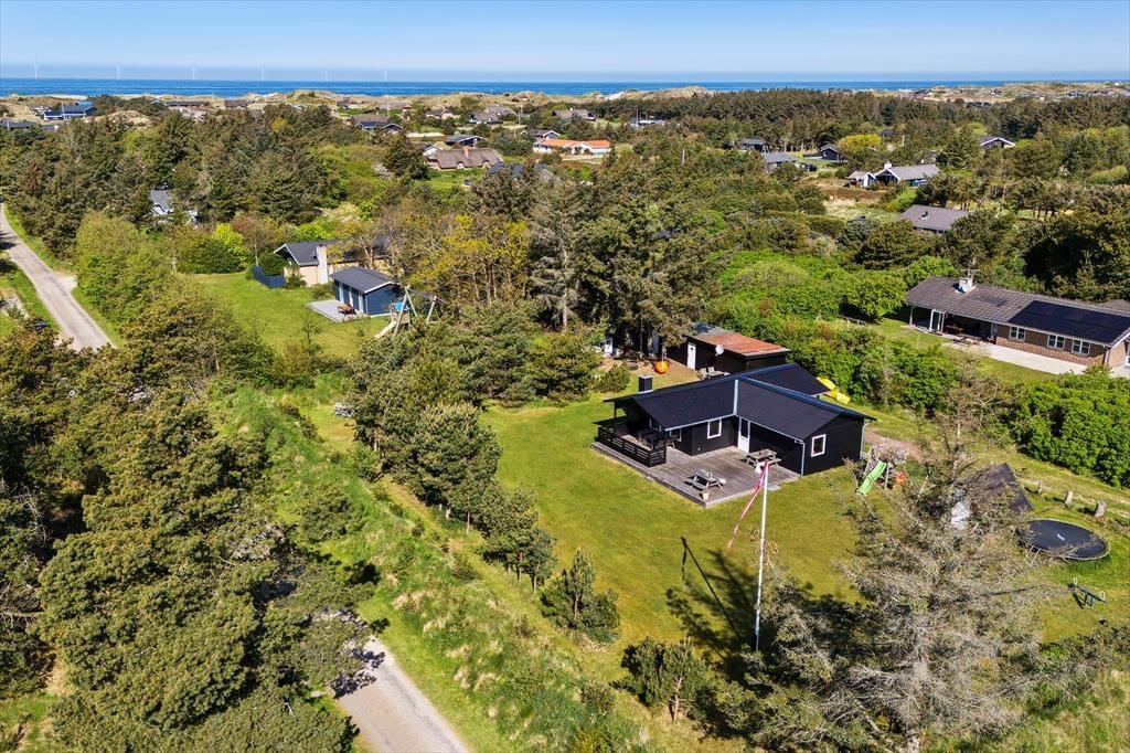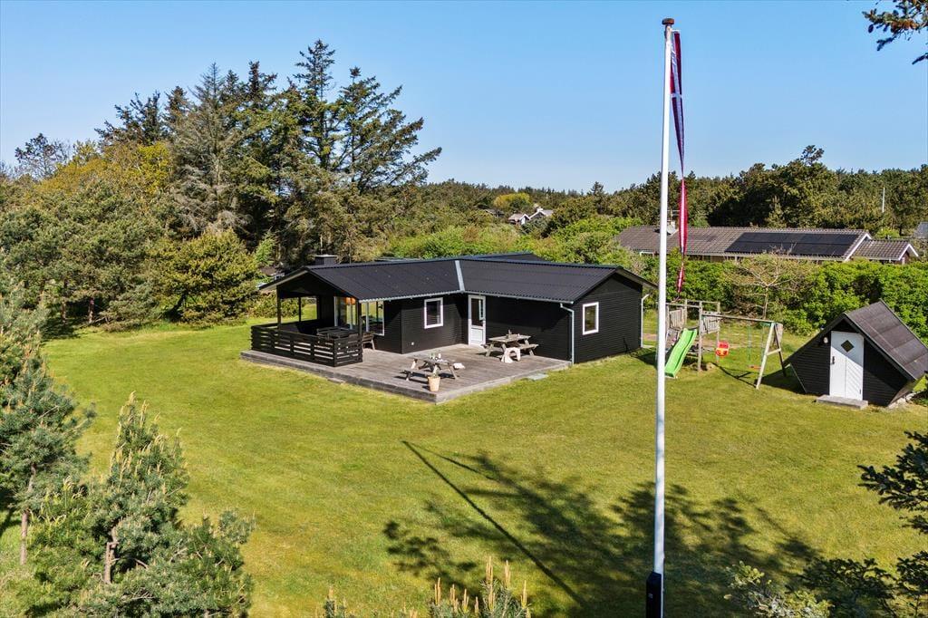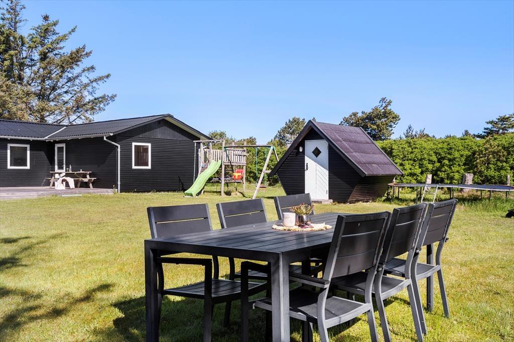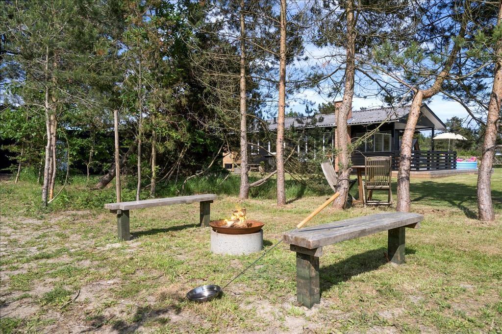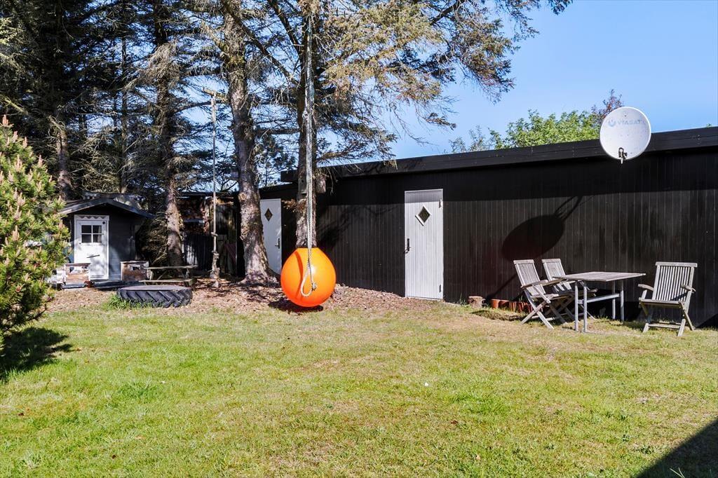 Det sydvendte terrassemiljø er stedet, hvor I kan servere sommerens måltider i solen. Da det er delvist overdækket og afskærmet af høje træer, kan I også finde skygge og læ. Den store græsplæne og legeredskaberne giver børnene masser af muligheder for leg og boldspil, og rundt på grunden findes hyggelige kroge, hvor de voksne imens kan slappe af under solen eller i skyggen fra et af træerne. Hele familien vil elske udesaunaen, der har forrum til omklædning. Her er også en udebruser, så sand og saltvand fra dukkerten i Vesterhavet let kan vaskes af. Endelig byder grunden på en bålplads, hvor I kan bruge feriens hyggelige aftenstunder på at bage snobrød og riste skumfiduser eller lave lækker bålmad.