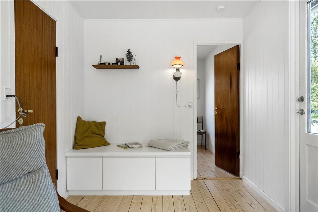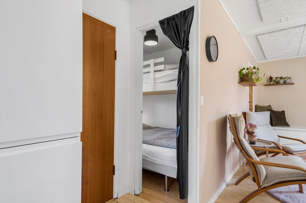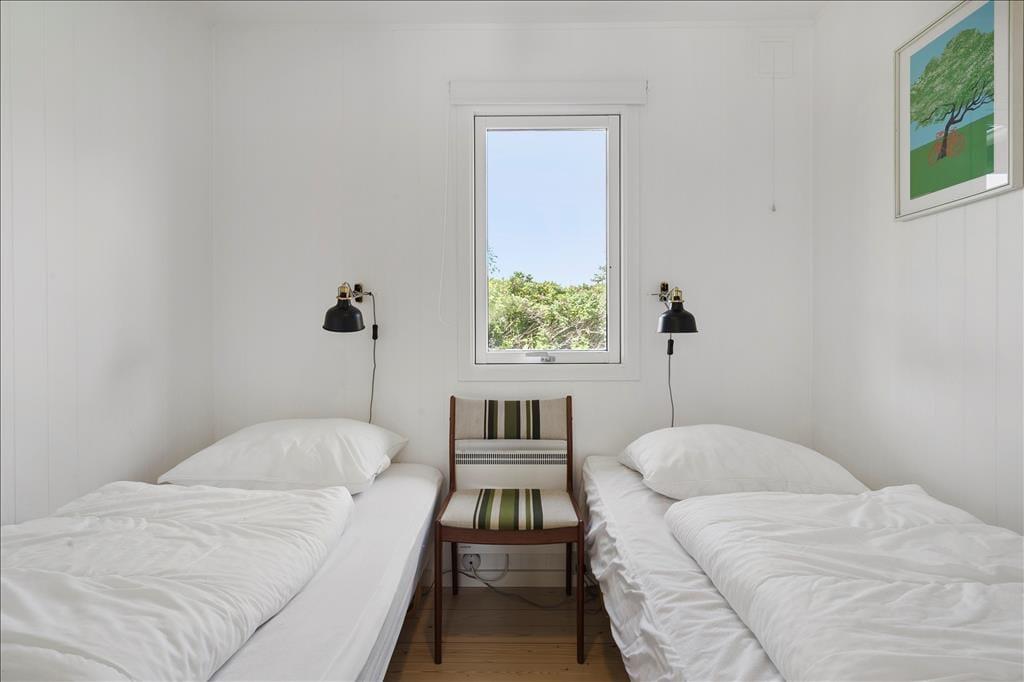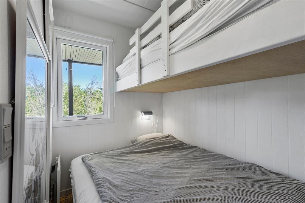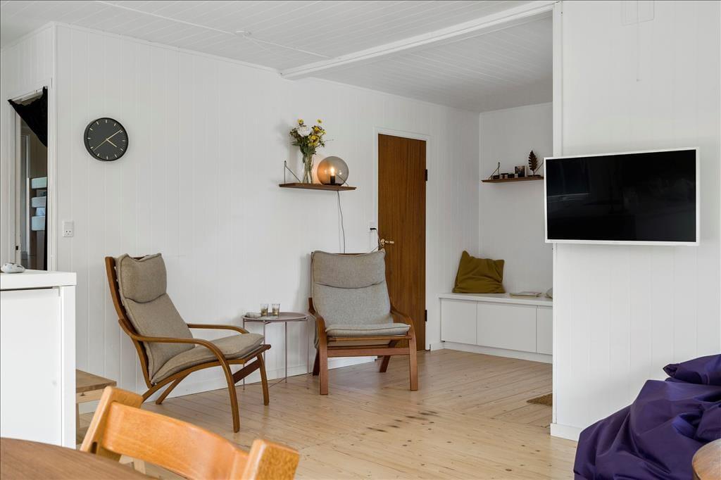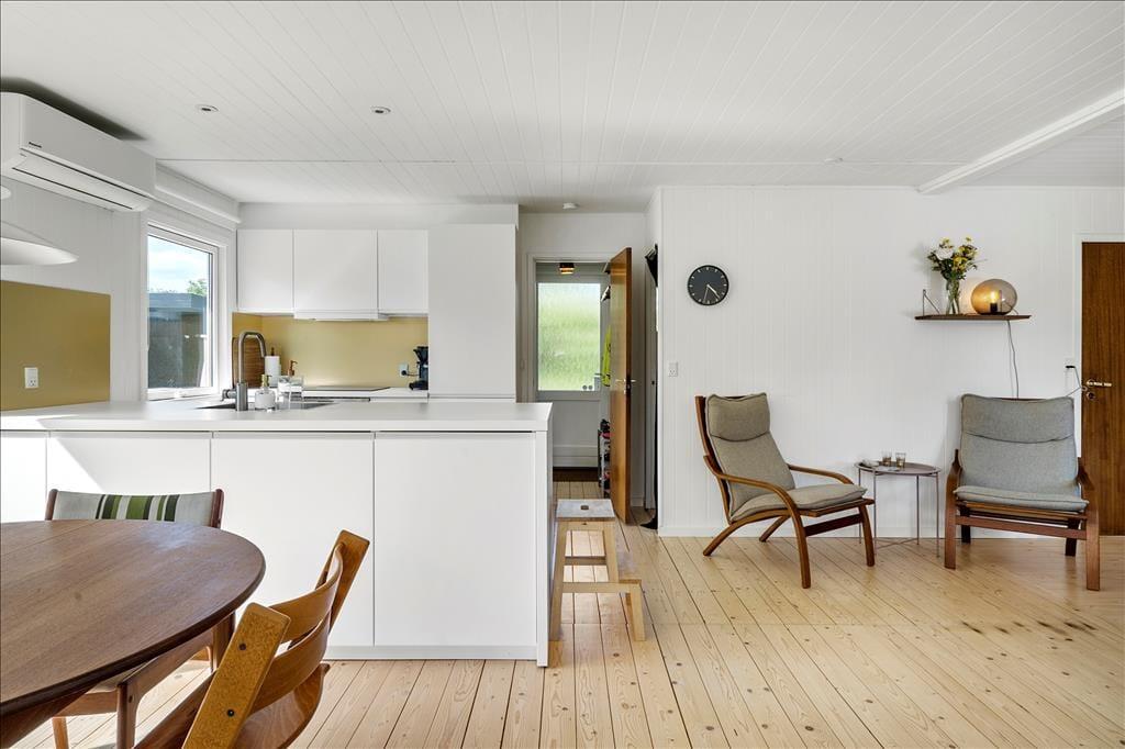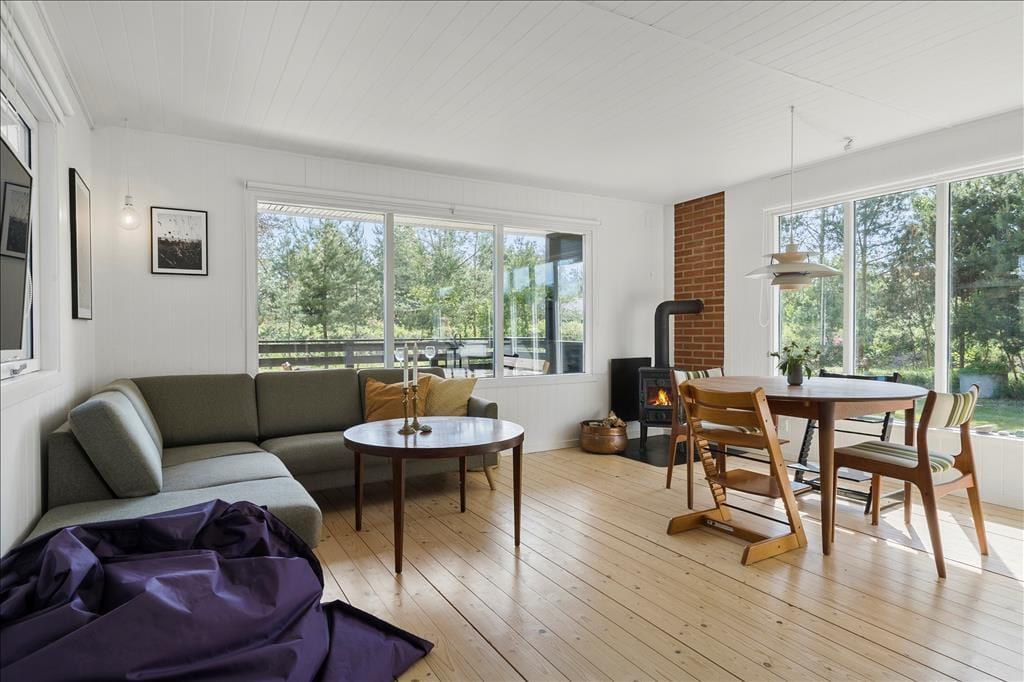 Sommerhuset byder på tre soveværelser, som tilsammen giver sengepladser til fire voksne og to børn. Badeværelset er indrettet med bruseniche, og foruden entréen består resten af ferieboligen af et åbent opholdsområde, hvor køkkenet og stuen ligger i åben forbindelse. Køkkenet er lækkert indrettet med alt ønskeligt udstyr inklusiv opvaskemaskine, og i stuen danner spisebordet, lænestolene og sofaarrangementet rammen om gode måltider, hyggelige filmaftener og afslapning med brætspil eller gode bøger. Store vinduespartier bader rummet i naturligt lys og giver udsigt til de grønne omgivelser, og varmepumpen holder en behagelig temperatur, mens brændeovnen sørger for en hyggelig atmosfære.