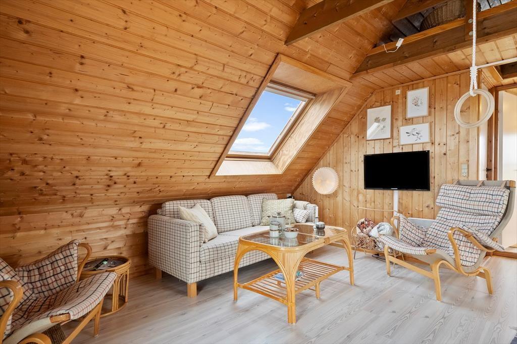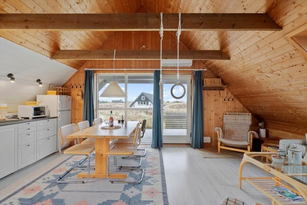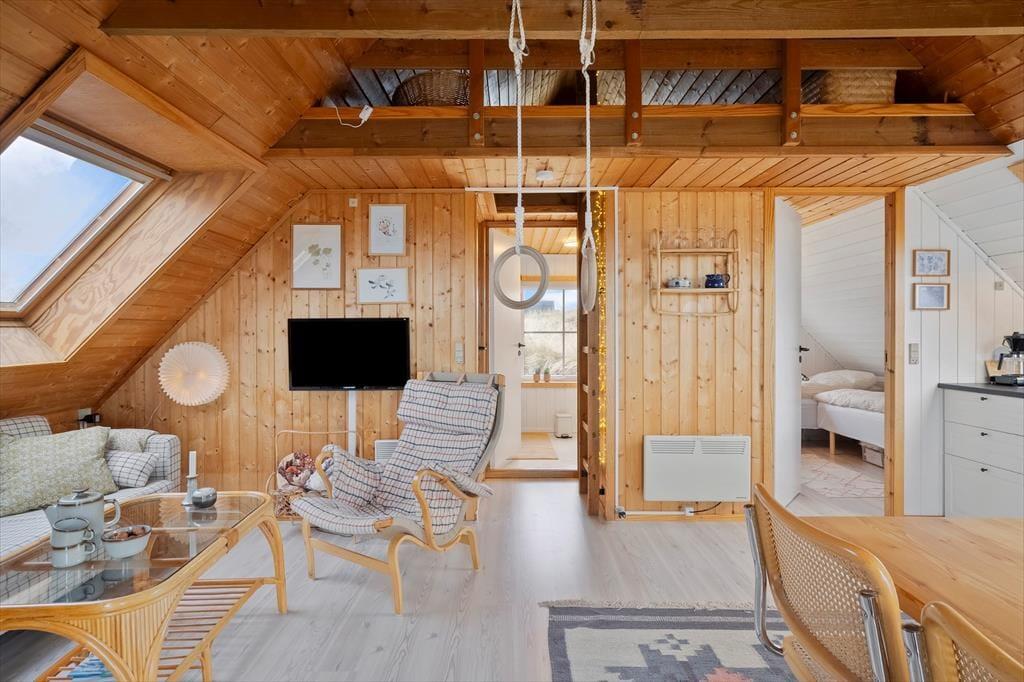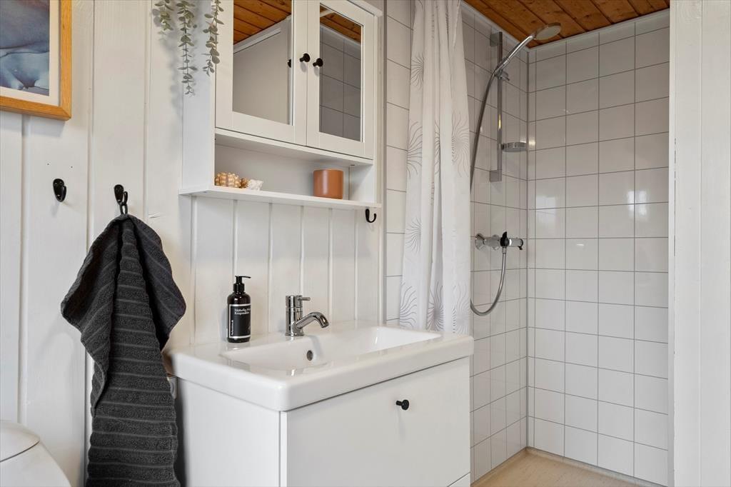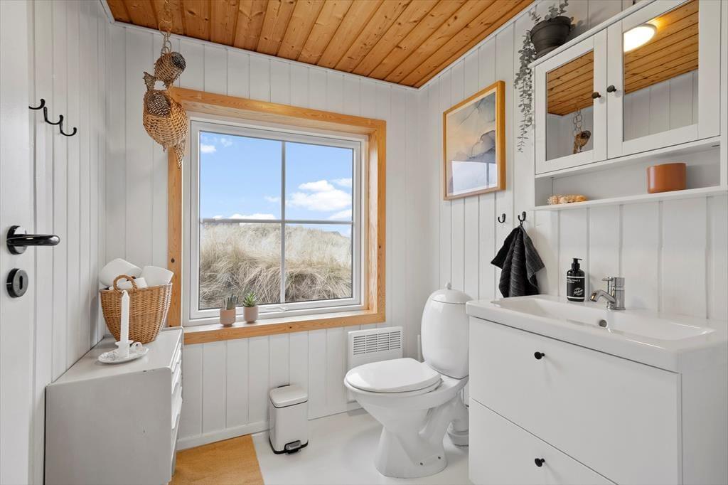Når du træder ind i sommerhuset, mødes du af en varm og indbydende atmosfære, hvor trævægge og -lofter straks sætter scenen for afslapning og feriehygge. Her er der tænkt i helheder, så rummene føles lyse, rolige og lette at finde sig til rette i. Opholdsområdet fungerer som husets naturlige samlingspunkt, hvor feriedagene flyder stille afsted med brætspil på bordet, en god bog i sofaen og snakke, der får lov at tage den tid, de tager. Vi holder især af den måde, lyset falder ind gennem vinduerne og binder inde- og udeliv sammen – en påmindelse om, at naturen altid er tæt på. Badeværelset fremstår lyst og velholdt, så dagen kan begynde og slutte i rolige rammer efter timer i den friske havluft.