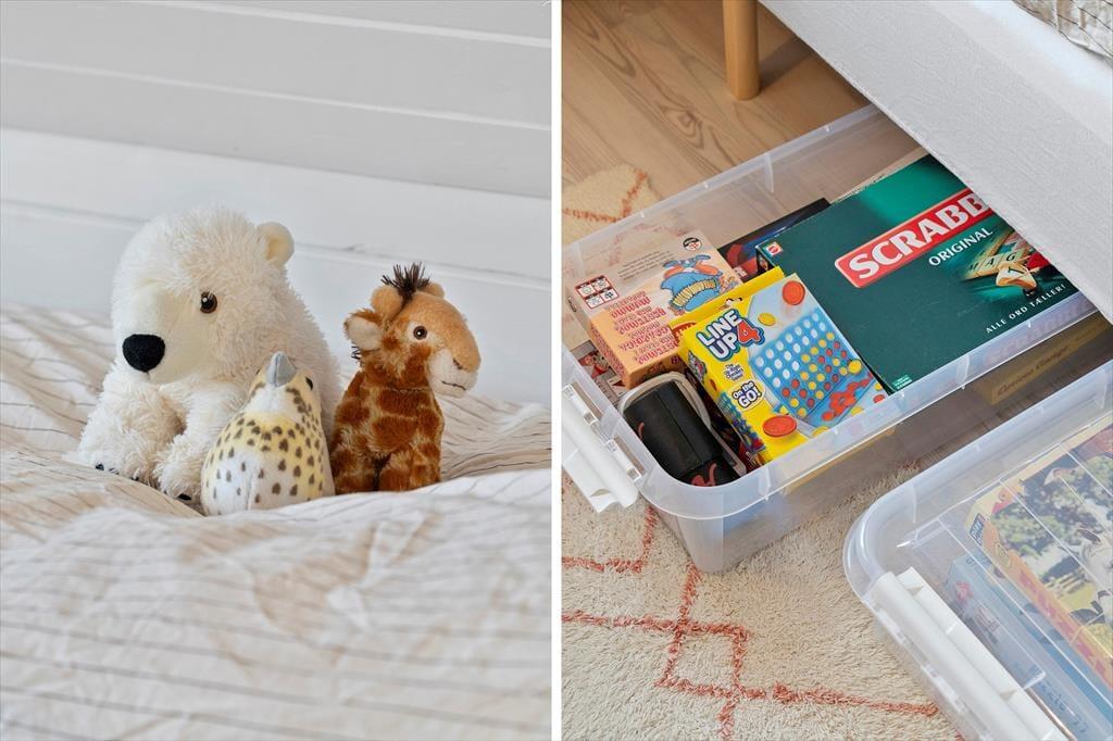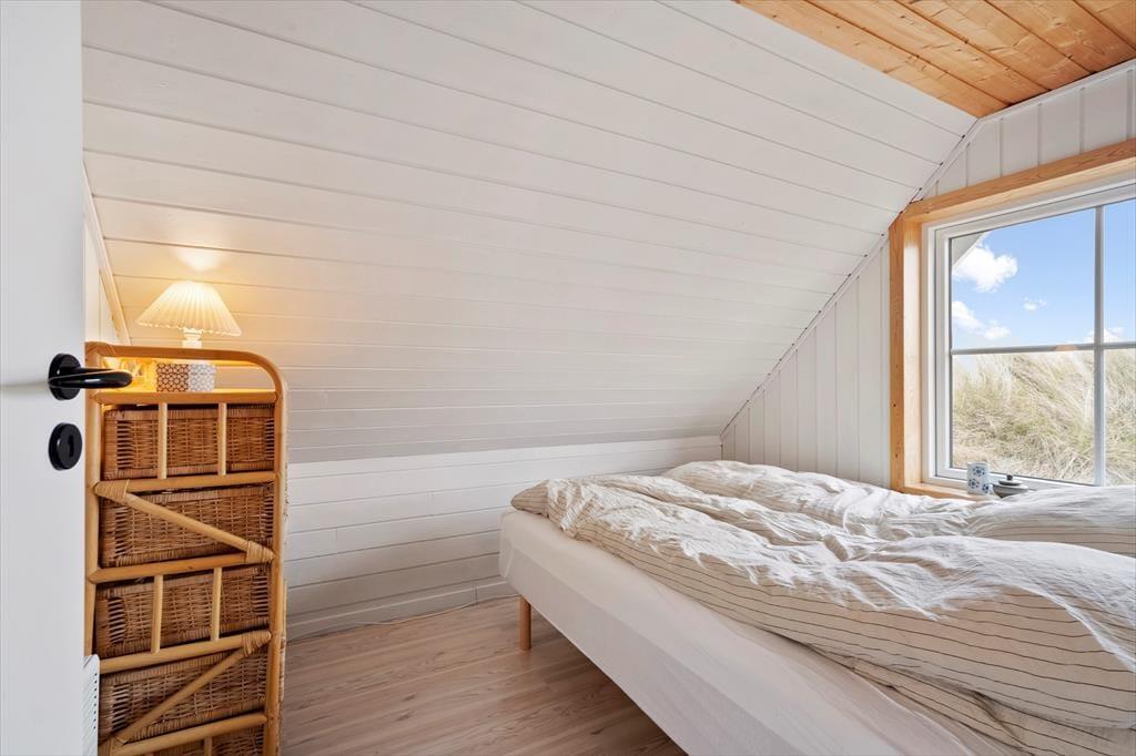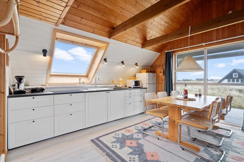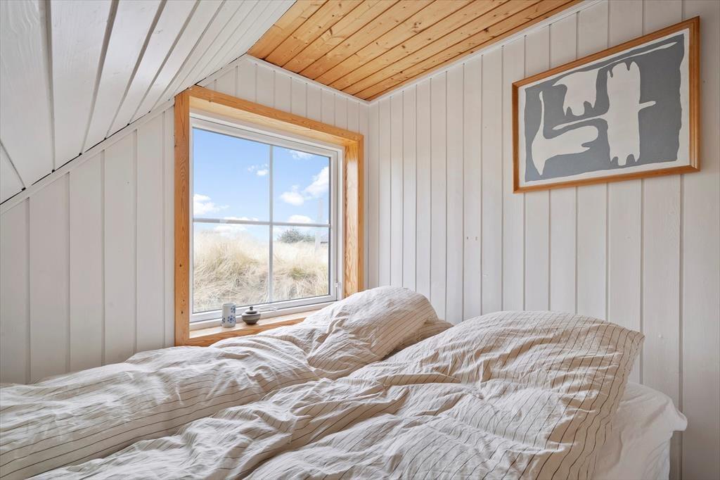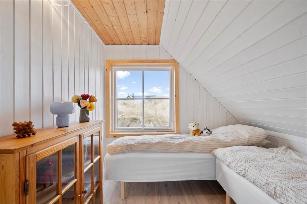 Når du træder ind i sommerhuset, mødes du af en varm og indbydende atmosfære, hvor trævægge og -lofter straks sætter scenen for afslapning og feriehygge. Her er der tænkt i helheder, så rummene føles lyse, rolige og lette at finde sig til rette i. Opholdsområdet fungerer som husets naturlige samlingspunkt, hvor feriedagene flyder stille afsted med brætspil på bordet, en god bog i sofaen og snakke, der får lov at tage den tid, de tager. Vi holder især af den måde, lyset falder ind gennem vinduerne og binder inde- og udeliv sammen – en påmindelse om, at naturen altid er tæt på. Badeværelset fremstår lyst og velholdt, så dagen kan begynde og slutte i rolige rammer efter timer i den friske havluft.