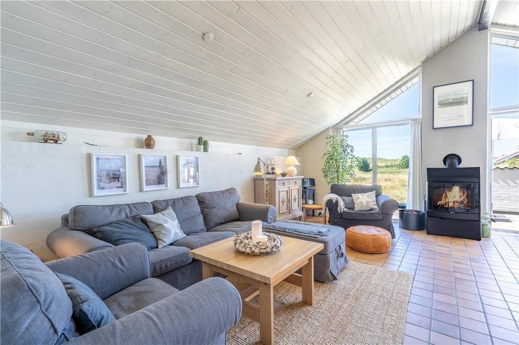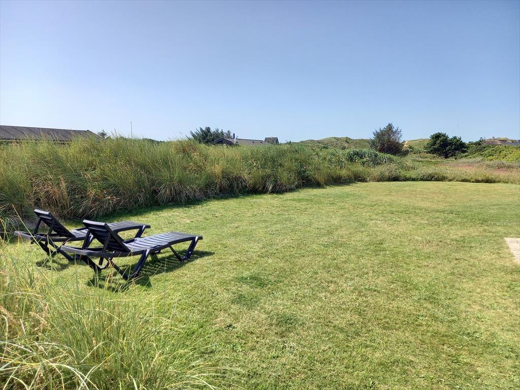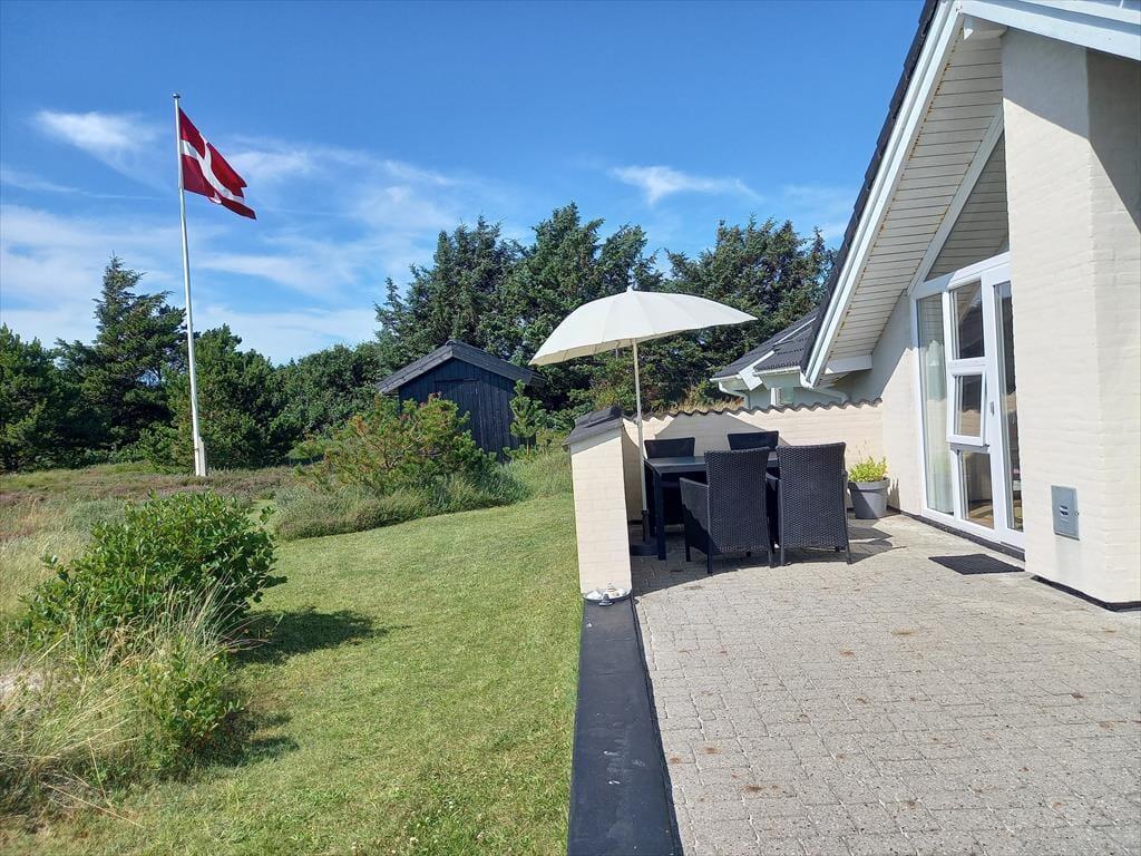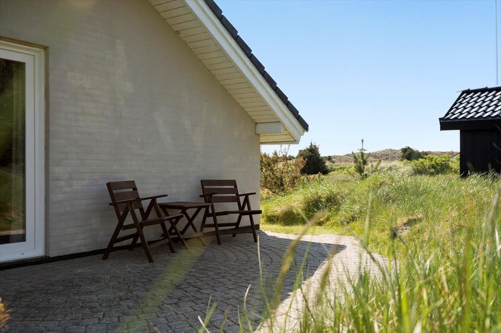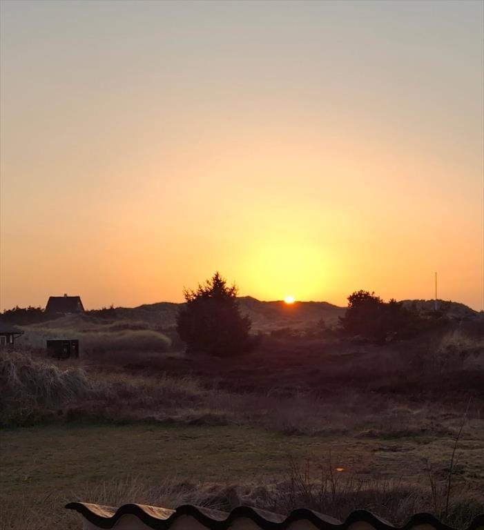 Med terrasser mod øst og vest kan I nyde solen fra morgen til aften. Den østvendte terrasse er stedet, hvor morgenkaffen kan nydes i solens første stråler, og her er også en sydvendt del, der er det ideelle sted at servere frokosten i solen. På den vestvendte terrasse kan I servere aftensmåltidet i dagens sene sol, og her har I også det perfekte sted at nyde solnedgangen. Fra både terrassen mod vest og det store vinduesparti i stuen kan I samtidig lade jer betage af en flot panoramaudsigt til klitterne ved havet – en udsigt, der fuldender oplevelsen, når solen går ned bag horisonten. På den hyggelige naturgrund kan I rundt om huset altid finde en hyggelig plet med læ for brisen