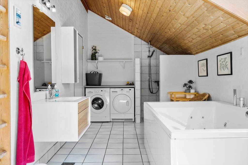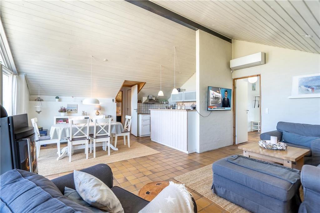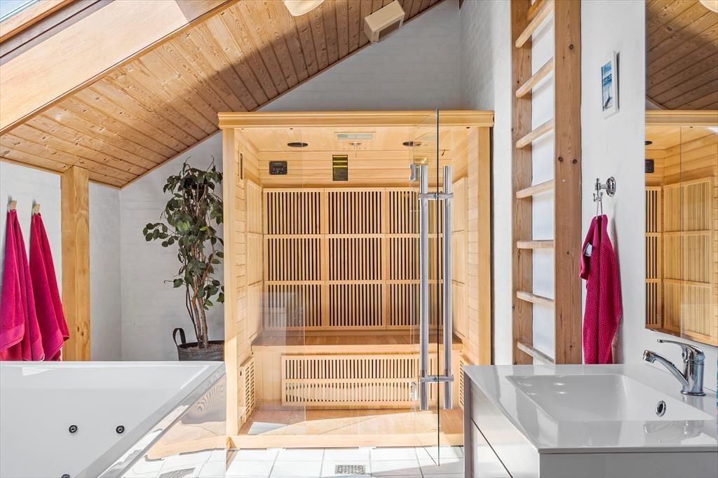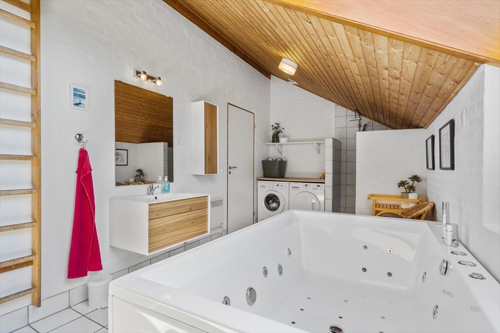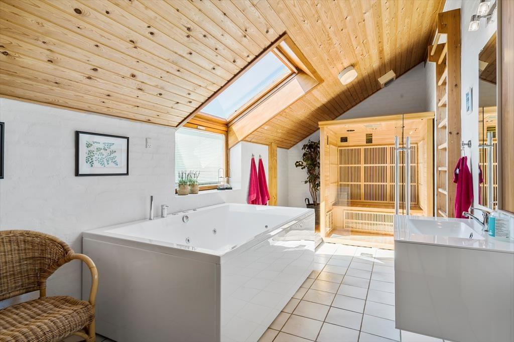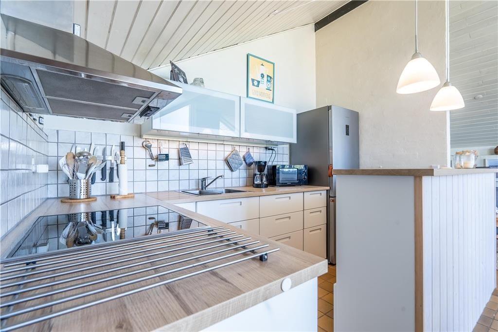 Sommerhuset er moderne og stilfuldt indrettet, og det har en velfungerende planløsning til seks personer. Hjertet er det store, åbne opholdsområde, hvor køkkenet og stuen glider i ét, og her giver loft til kip en luftig atmosfære, mens vinduespartier fra gulv til loft lukker masser af naturligt lys ind. Køkkenet er veludstyret, og retterne serveres let ved spisebordet i stuen, der også byder på et sofaarrangement, hvor I kan hygge med en god bog, en spændende film eller hyggelige samtaler med varm te og hjemmebag, mens ilden knitrer i brændeovnen. Ferieboligen rummer to separate soveafdelinger. Den ene afdeling byder på to soveværelser, og her findes også et badeværelse med bruseniche. Den anden afdeling rummer et stort soveværelse, og her findes også et separat toilet. Ligeledes er her det store wellness-badeværelse, som foruden en vaskemaskine, en tørretumbler og en bruseniche byder på spabadet og den infrarøde sauna.