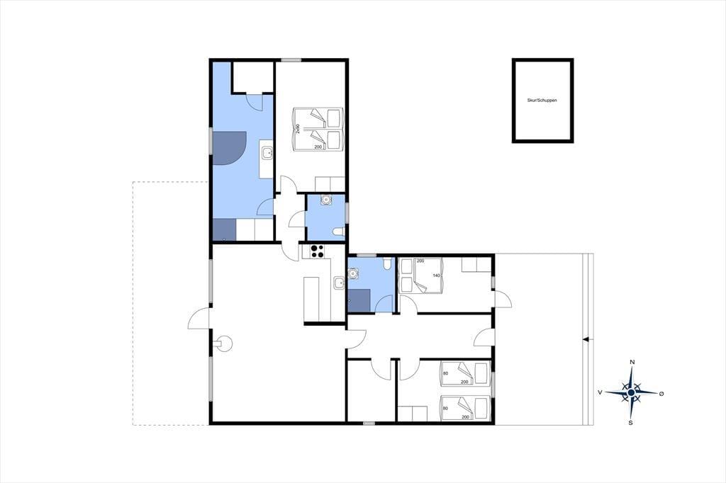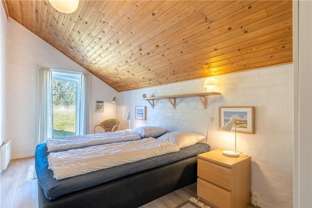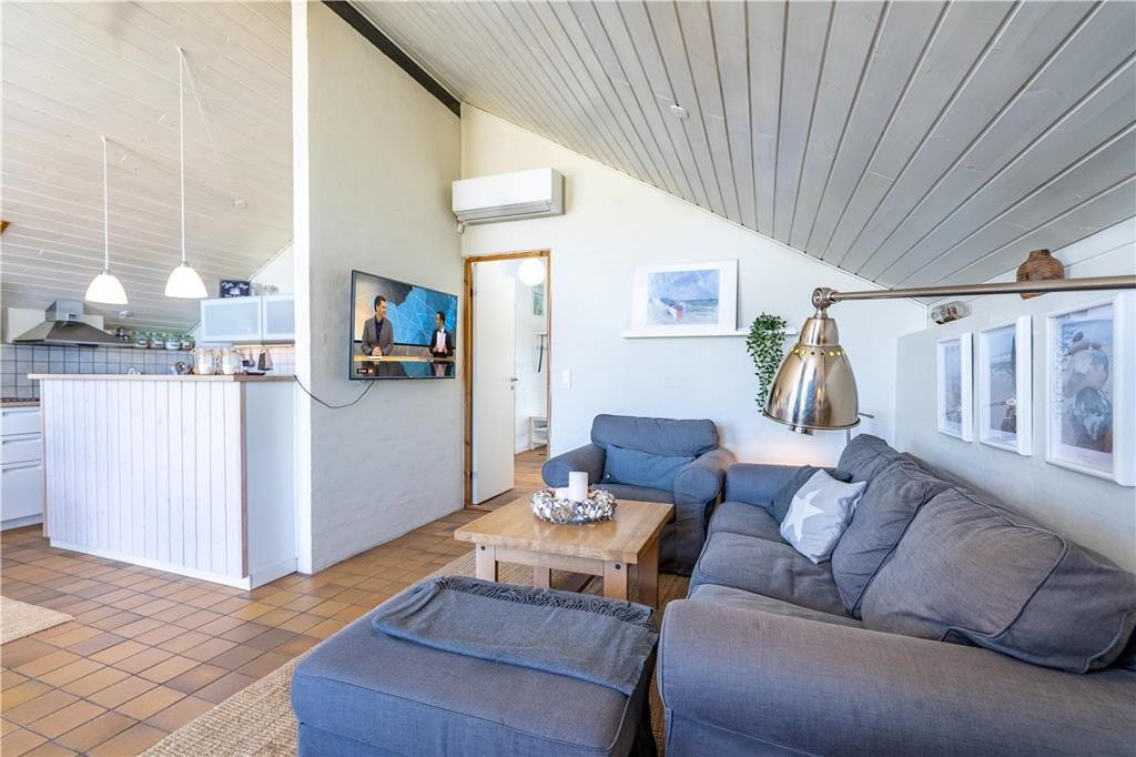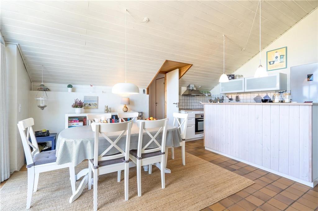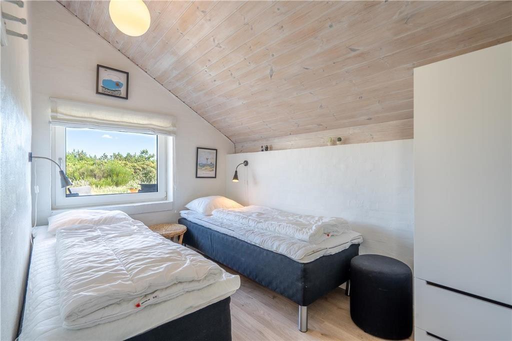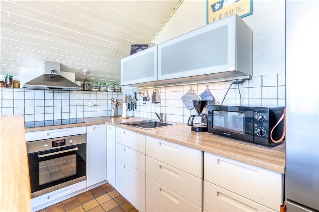 Sommerhuset er moderne og stilfuldt indrettet, og det har en velfungerende planløsning til seks personer. Hjertet er det store, åbne opholdsområde, hvor køkkenet og stuen glider i ét, og her giver loft til kip en luftig atmosfære, mens vinduespartier fra gulv til loft lukker masser af naturligt lys ind. Køkkenet er veludstyret, og retterne serveres let ved spisebordet i stuen, der også byder på et sofaarrangement, hvor I kan hygge med en god bog, en spændende film eller hyggelige samtaler med varm te og hjemmebag, mens ilden knitrer i brændeovnen. Ferieboligen rummer to separate soveafdelinger. Den ene afdeling byder på to soveværelser, og her findes også et badeværelse med bruseniche. Den anden afdeling rummer et stort soveværelse, og her findes også et separat toilet. Ligeledes er her det store wellness-badeværelse, som foruden en vaskemaskine, en tørretumbler og en bruseniche byder på spabadet og den infrarøde sauna.