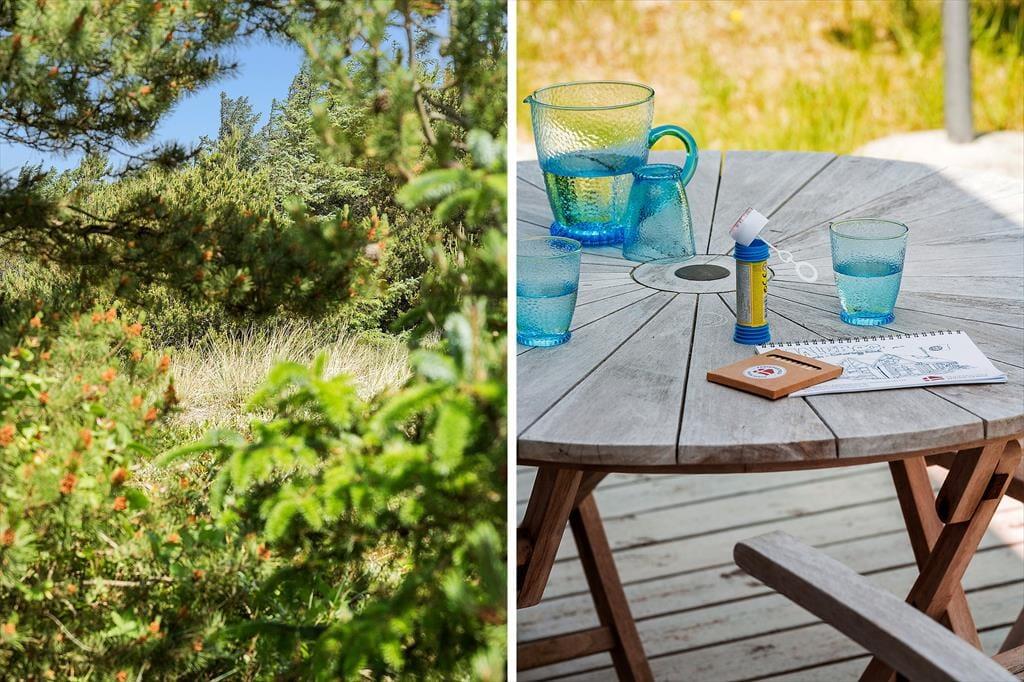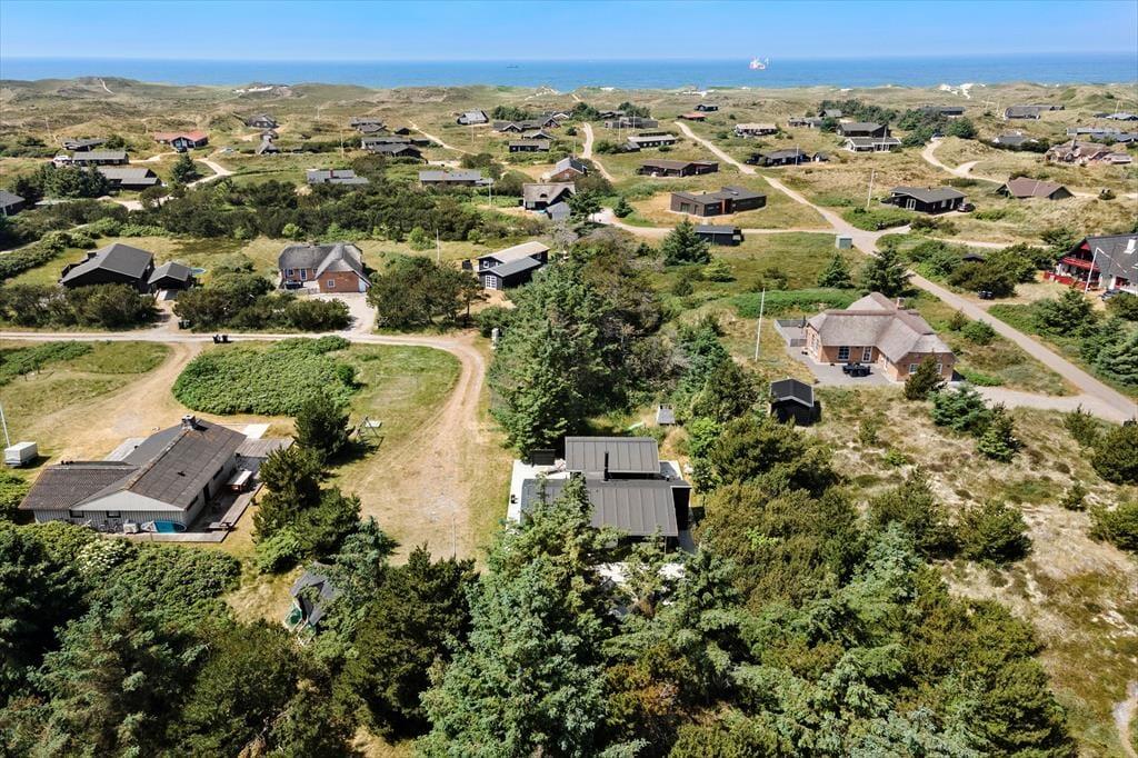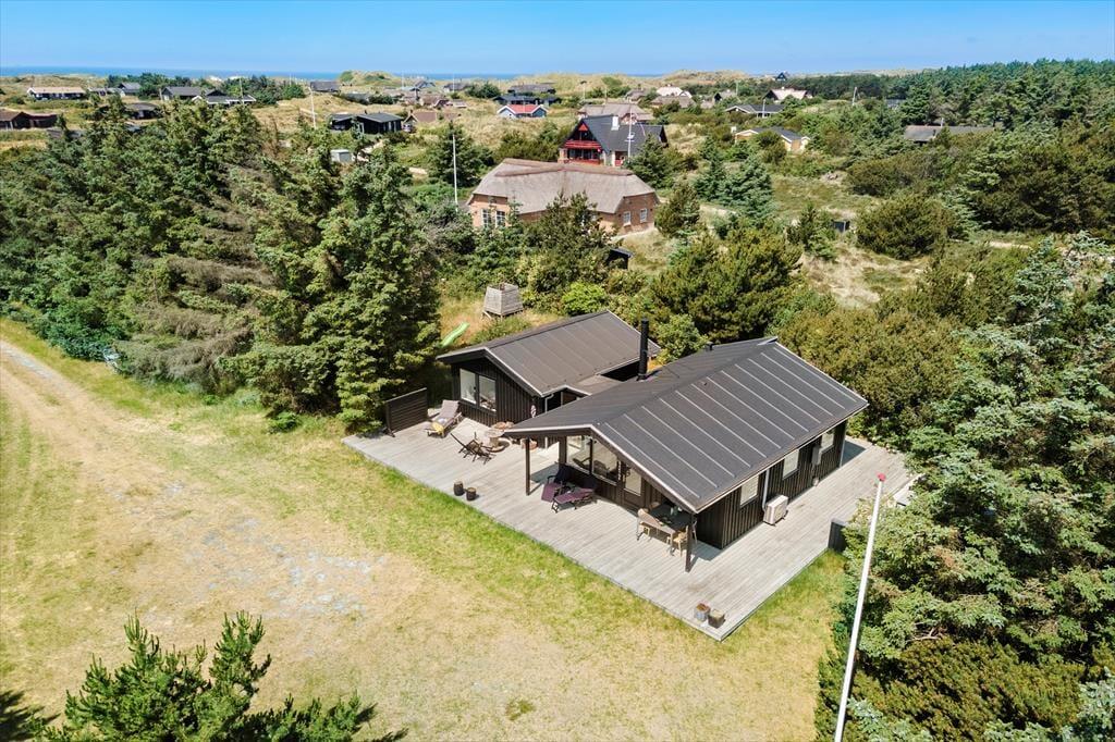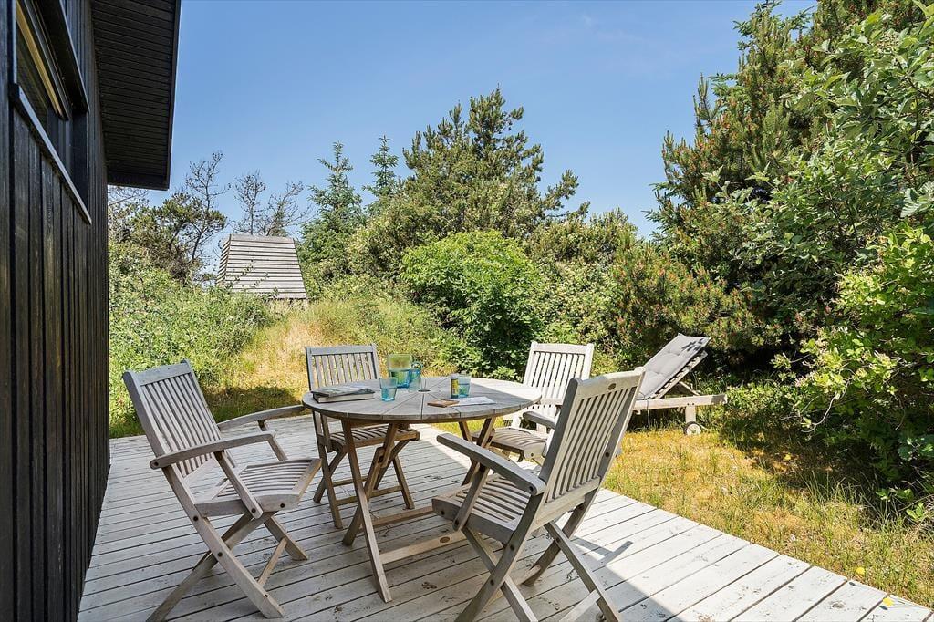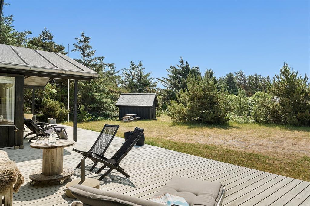 Sommerhuset ligger for enden af en lille, lukket sidevej, så omgivelserne er helt uforstyrrede. Rundt om huset breder en åben træterrasse sig, og der er et overdækket areal mod syd. Her kan I passende sidde om aftenen, når mørket sænker sig over Søndervig. En udebruser og en lille rutsjebane hører med til udefaciliteterne, og derudover er der flere hyggekroge og en græsplæne på naturgrunden.